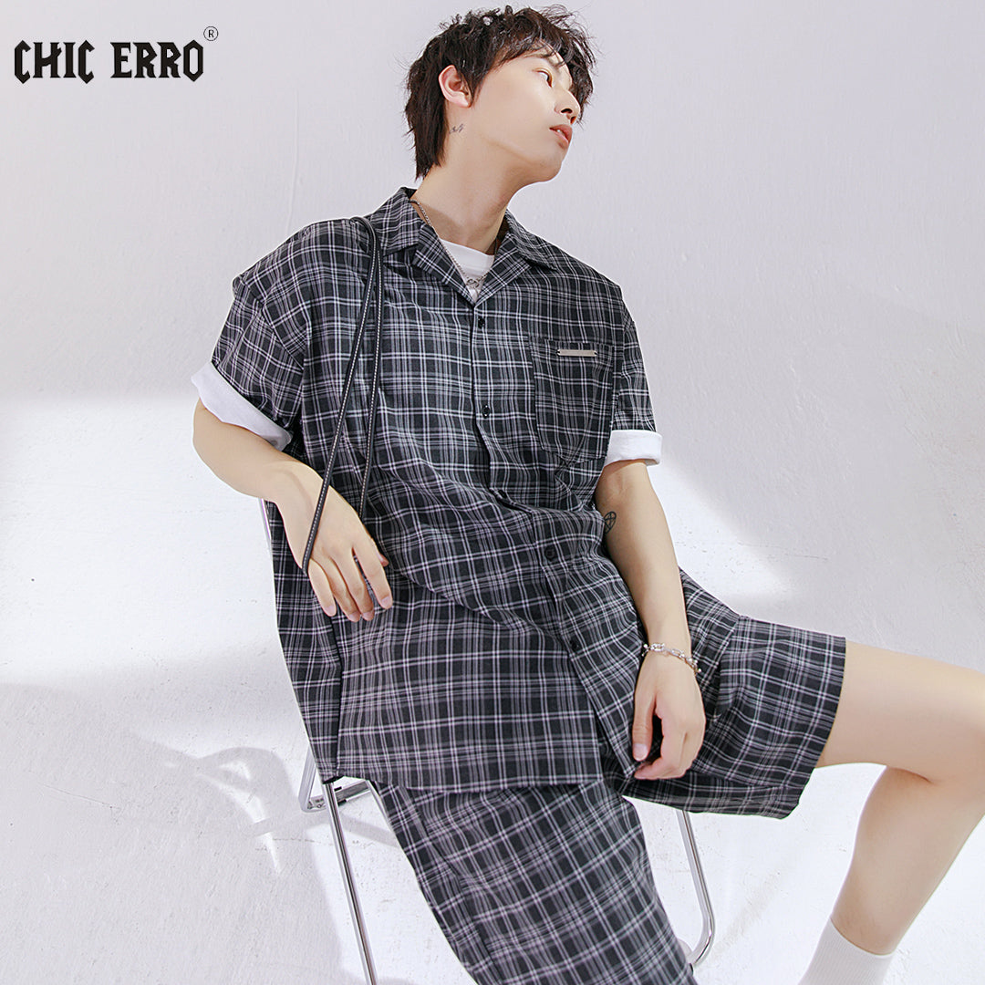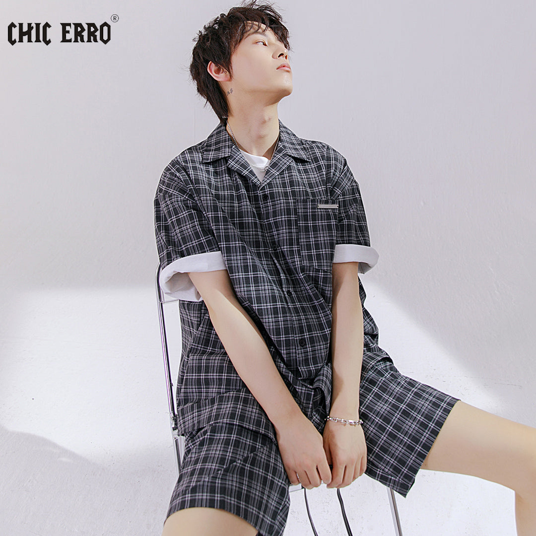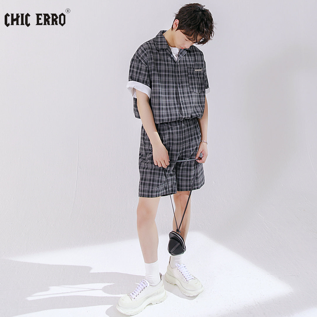 CHIC ERRO Chic Erro 2021 new plaid shirt men's summer short-sleeved loose straight shorts casual men's suit