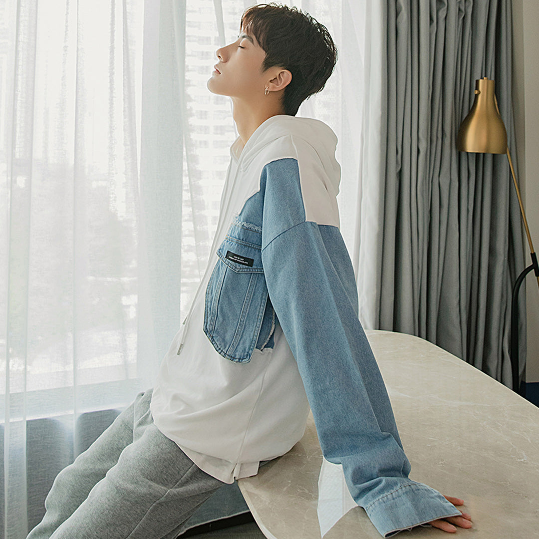CHIC ERRO Chic Erro autumn men's Korean style jacket loose white denim stitching hooded sweater men's trend