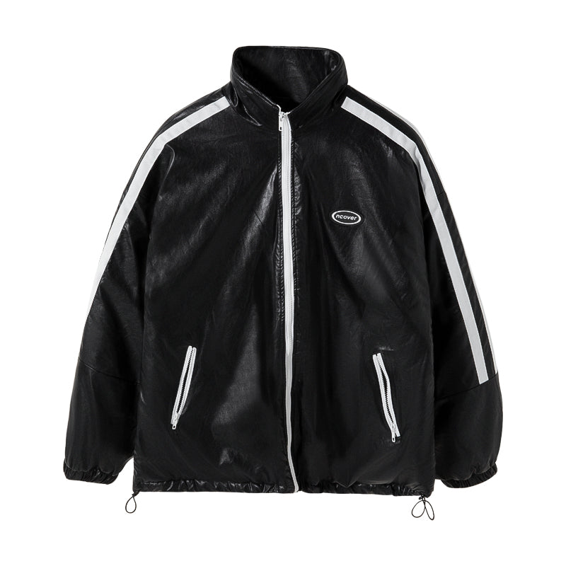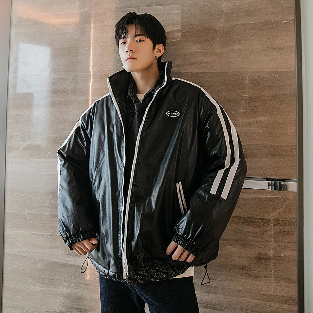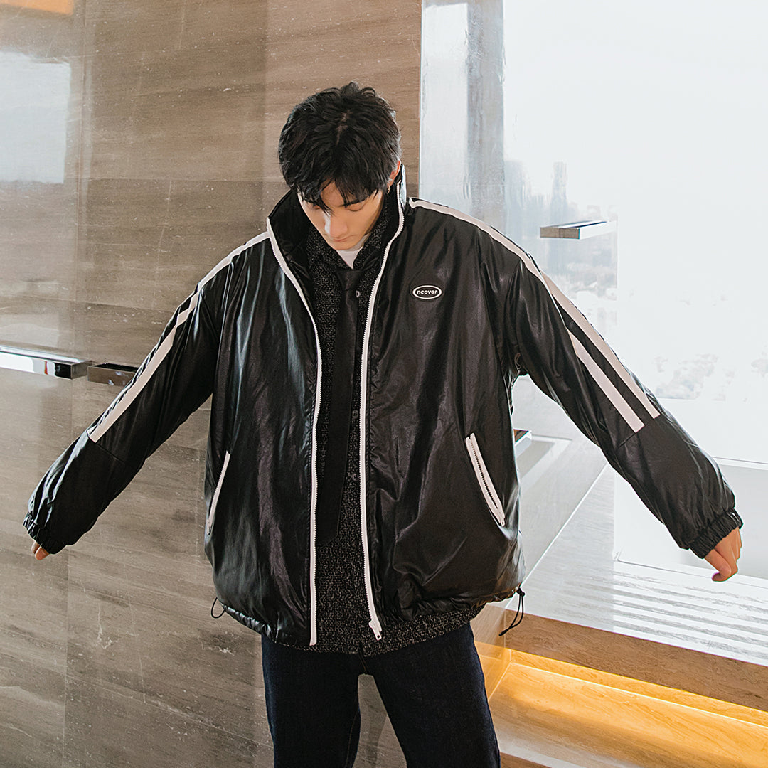 CHIC ERRO Chic Erro black loose handsome cotton jacket stand-up collar stitching warm trend leather jacket autumn and winter men's jacket