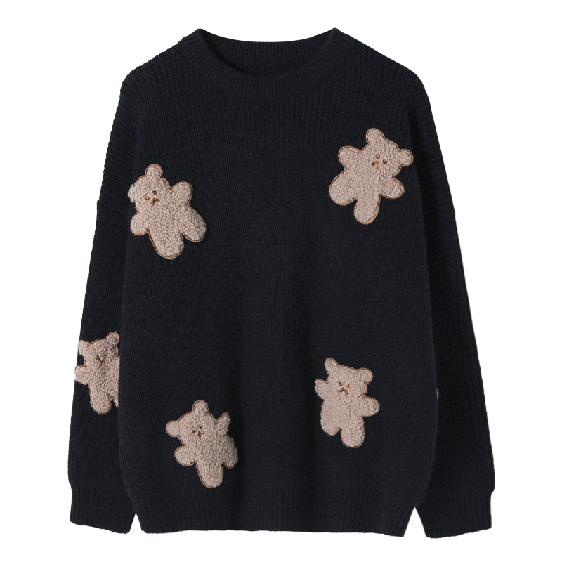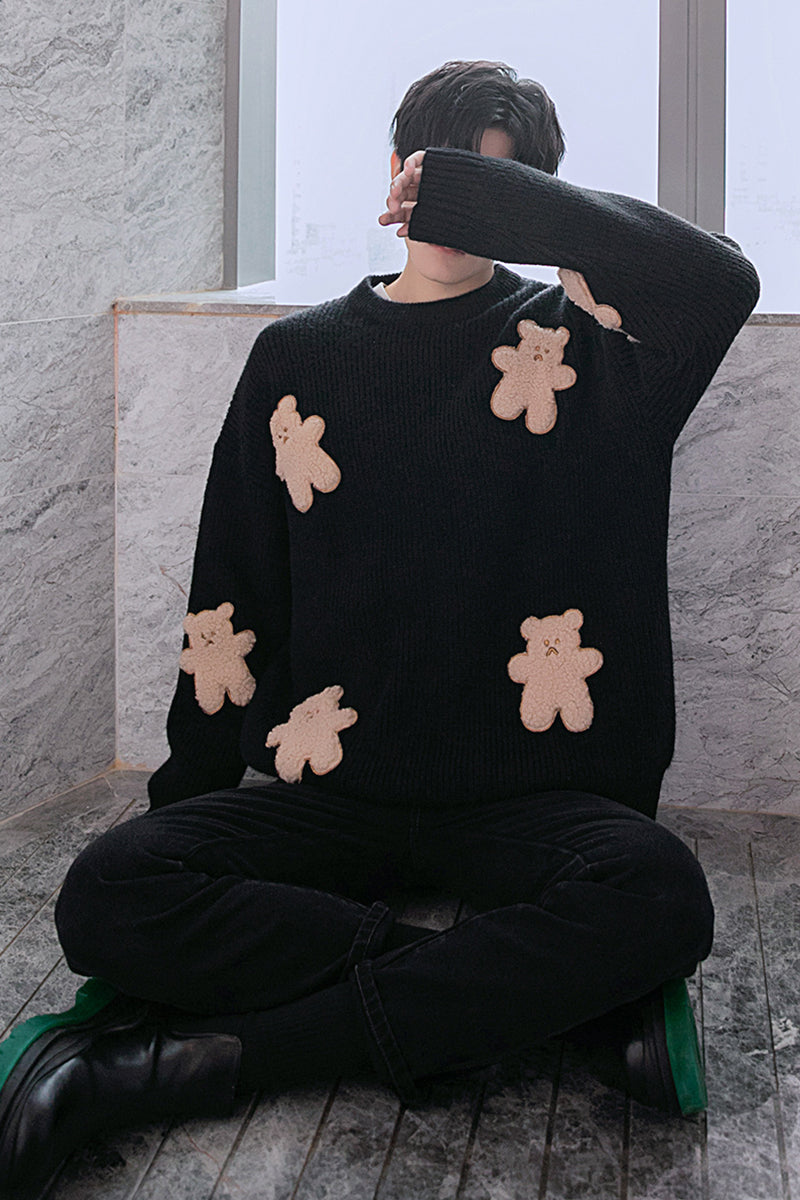 CHIC ERRO Chic Erro black round neck sweater men's autumn long-sleeved loose lazy bear jacquard sweater pullover