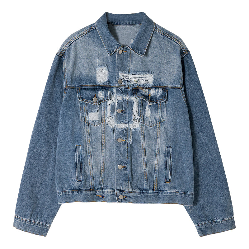 CHIC ERRO Chic Erro blue ripped denim jacket male Korean version of the trend loose lapel men's casual spring and autumn jacket