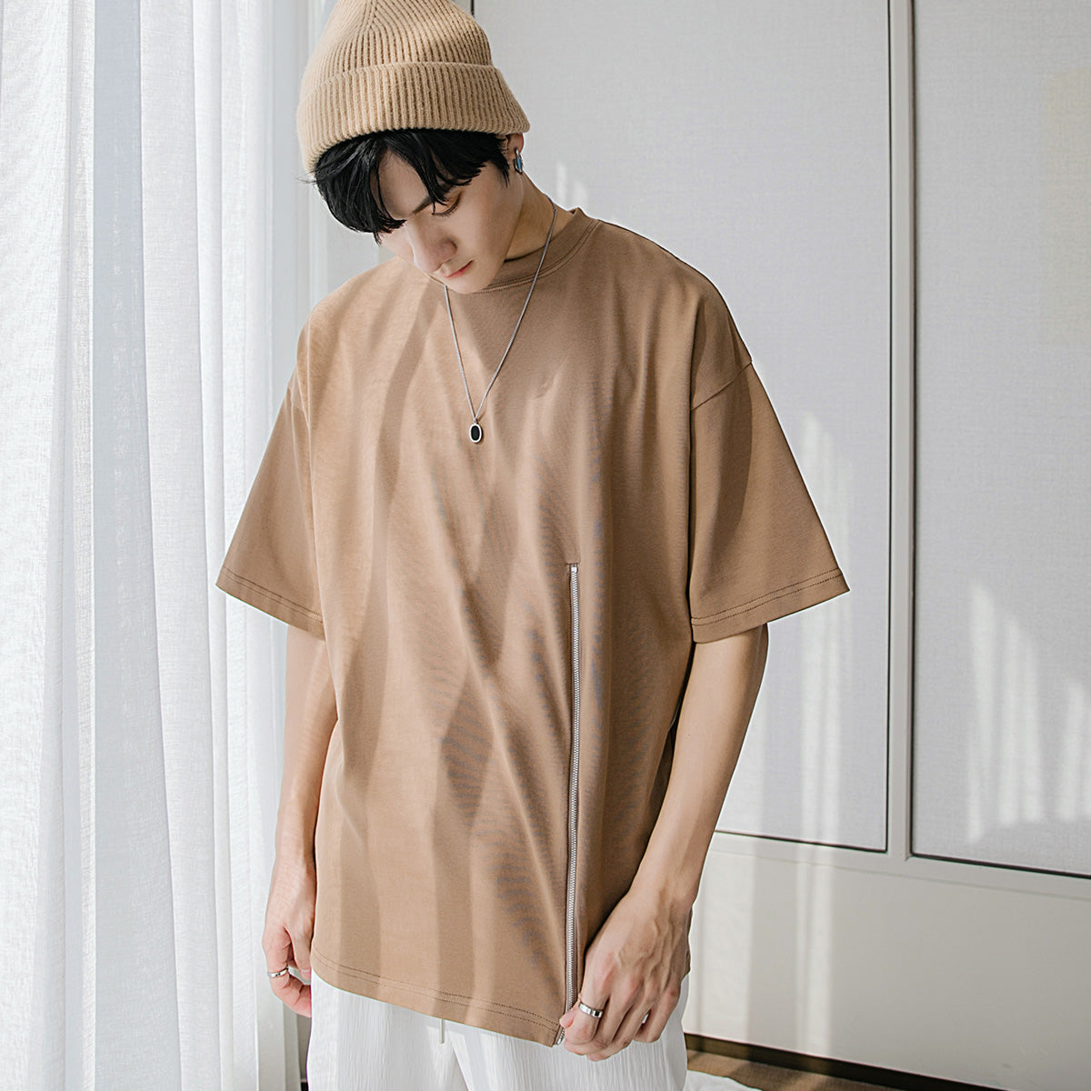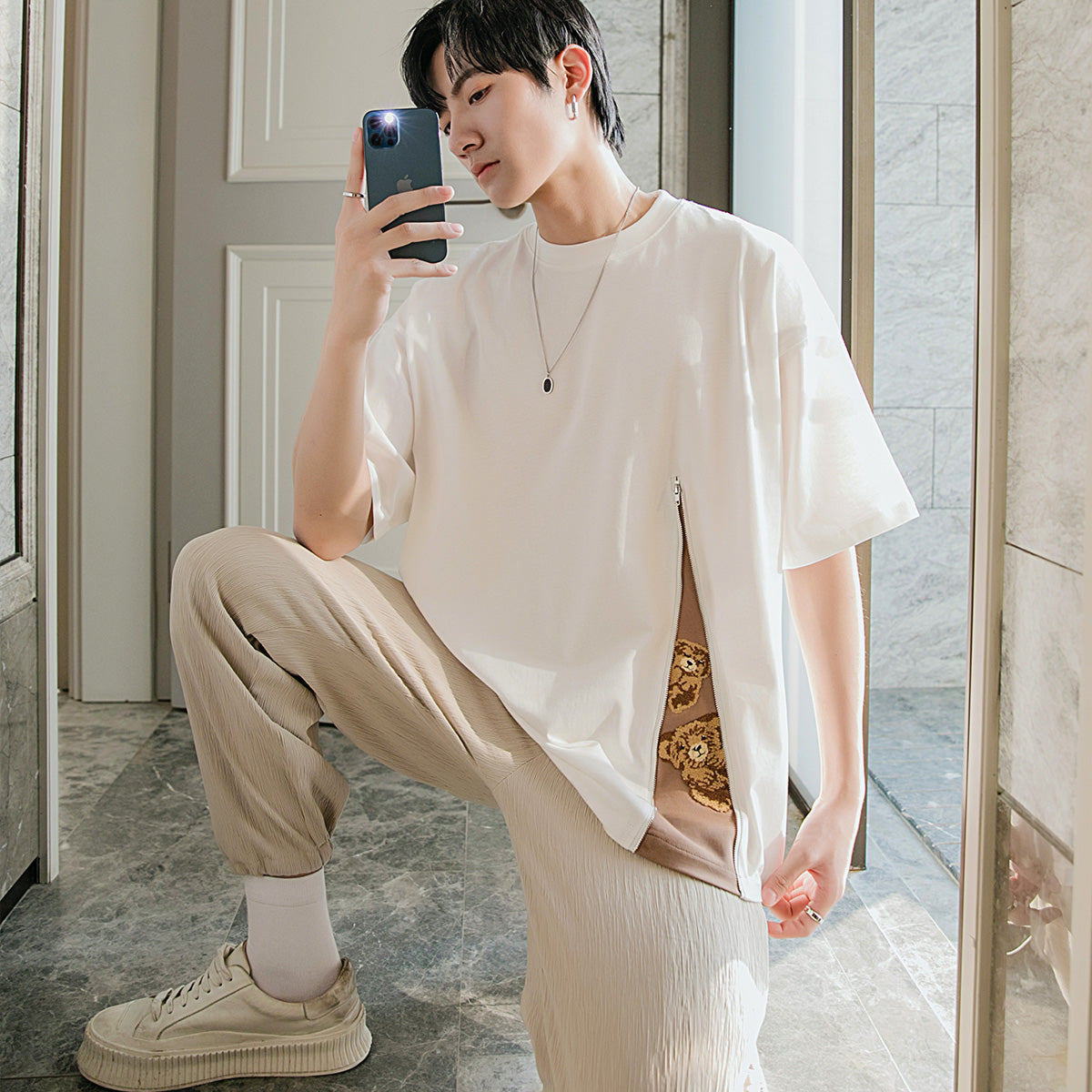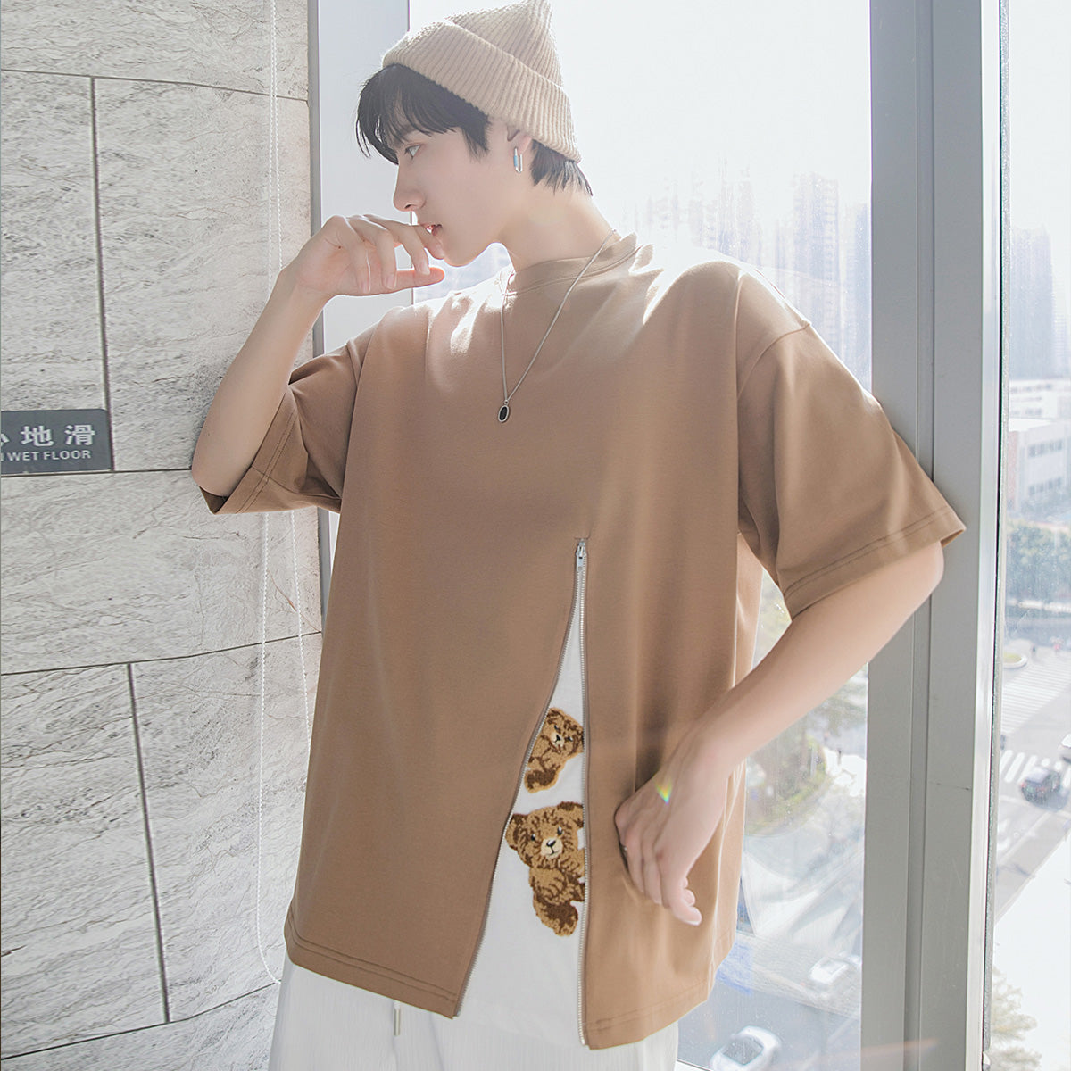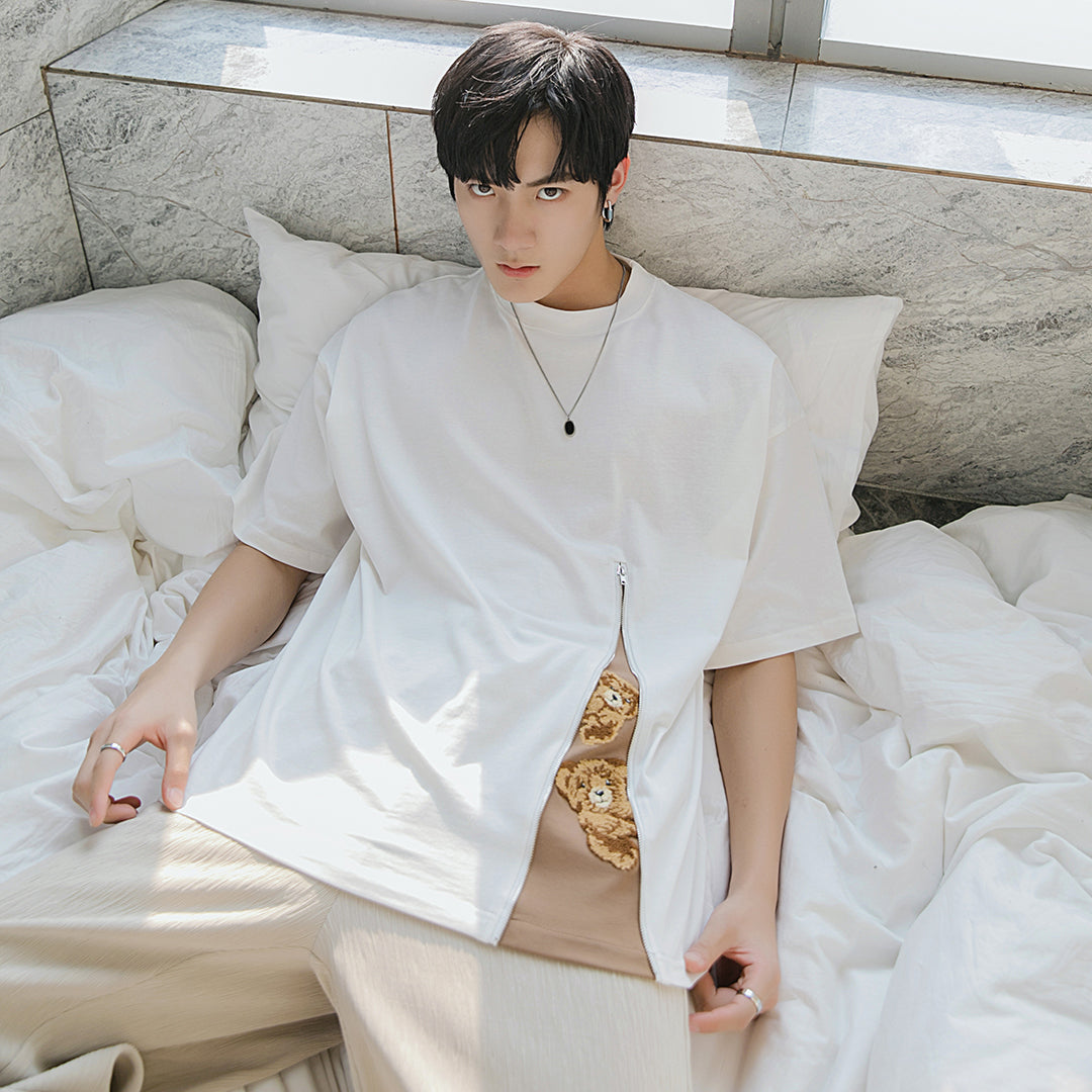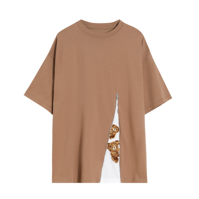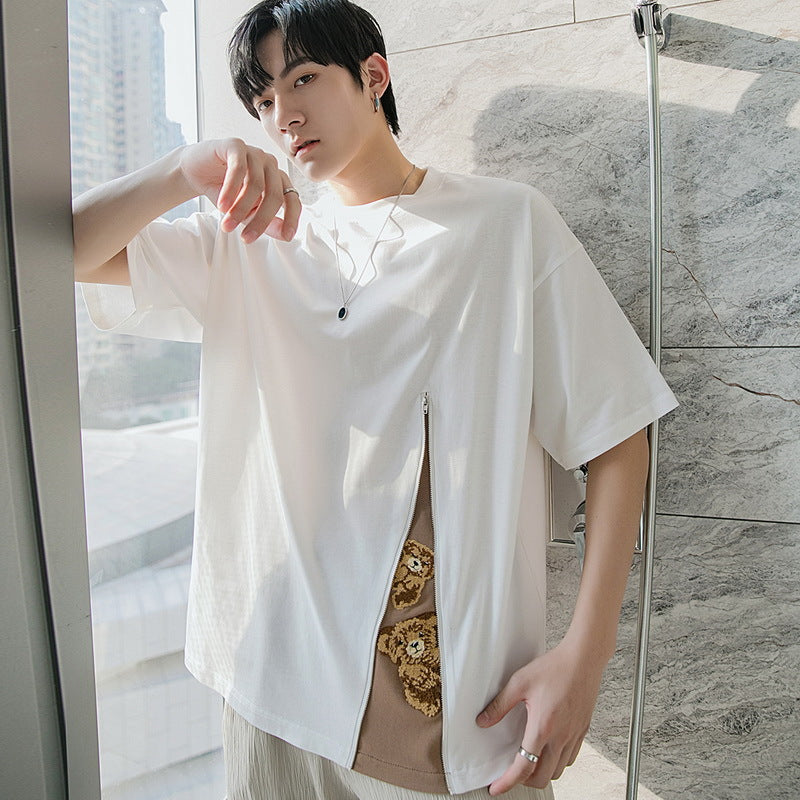 CHIC ERRO Chic Erro cartoon print loose short-sleeved T-shirt men's trend slit stitching design sense casual t-shirt