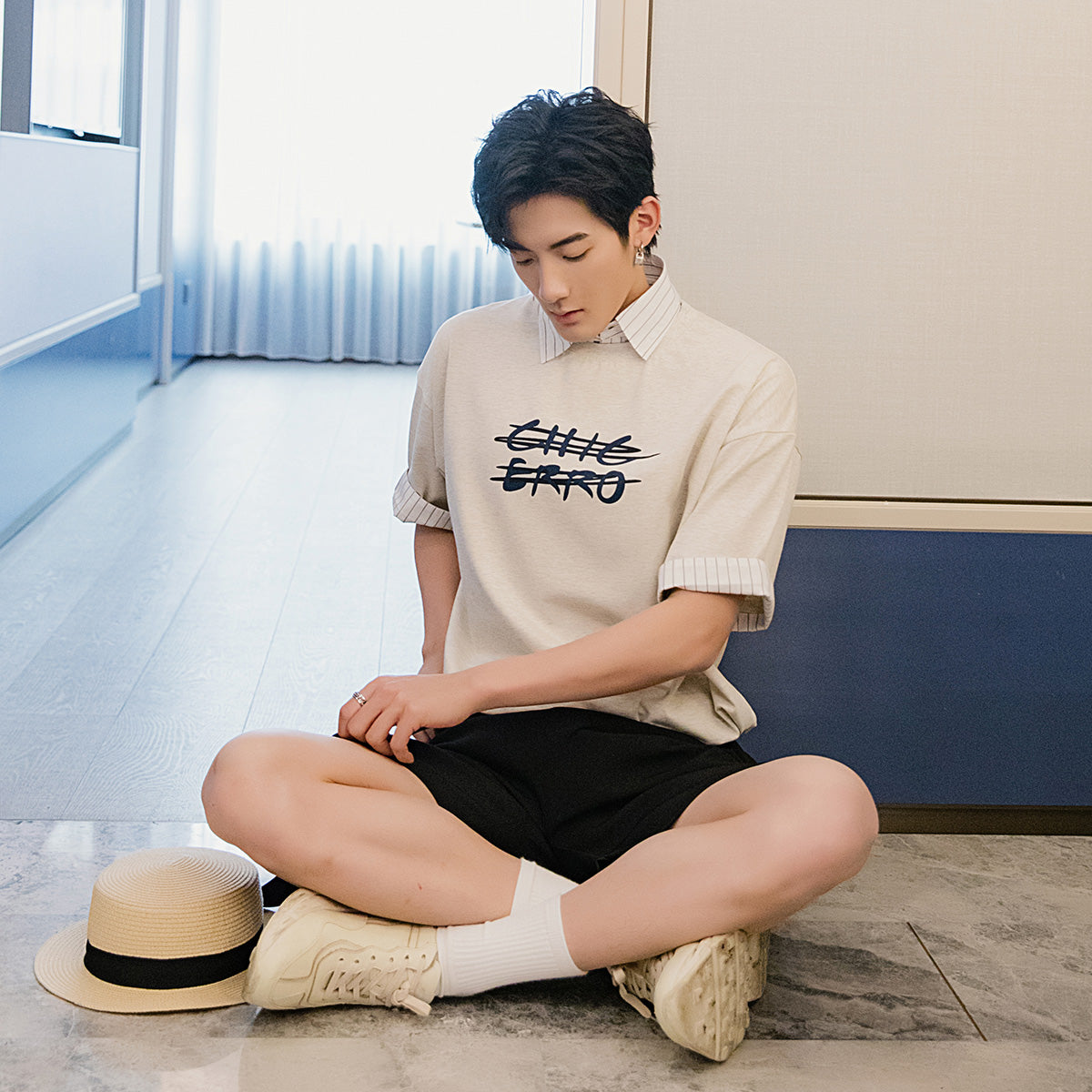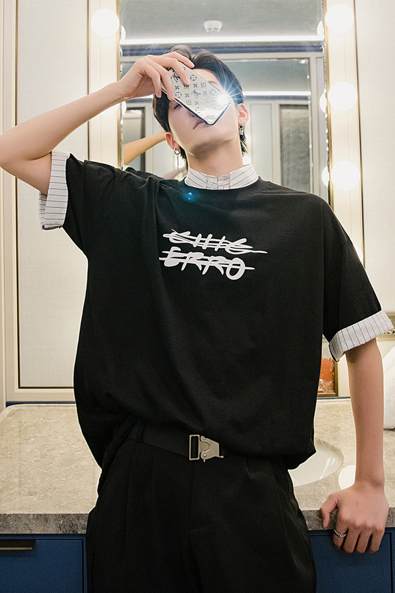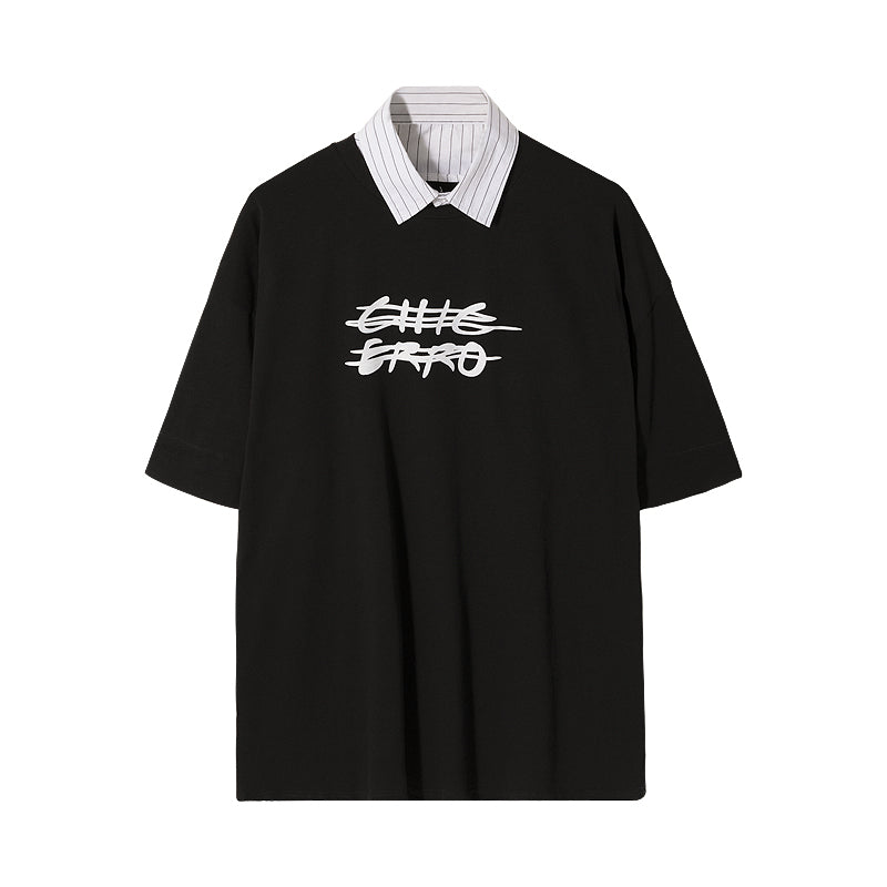 CHIC ERRO Chic Erro clothing style fake two-piece half-sleeved men's trend loose men's stitching shirt collar printing short-sleeved T-shirt
