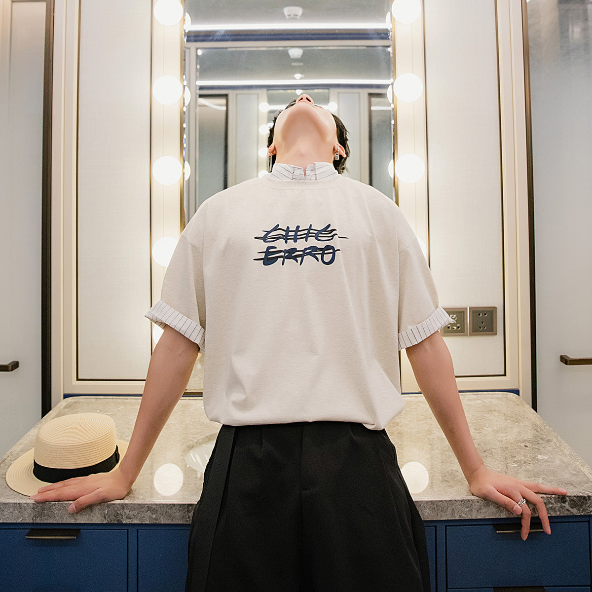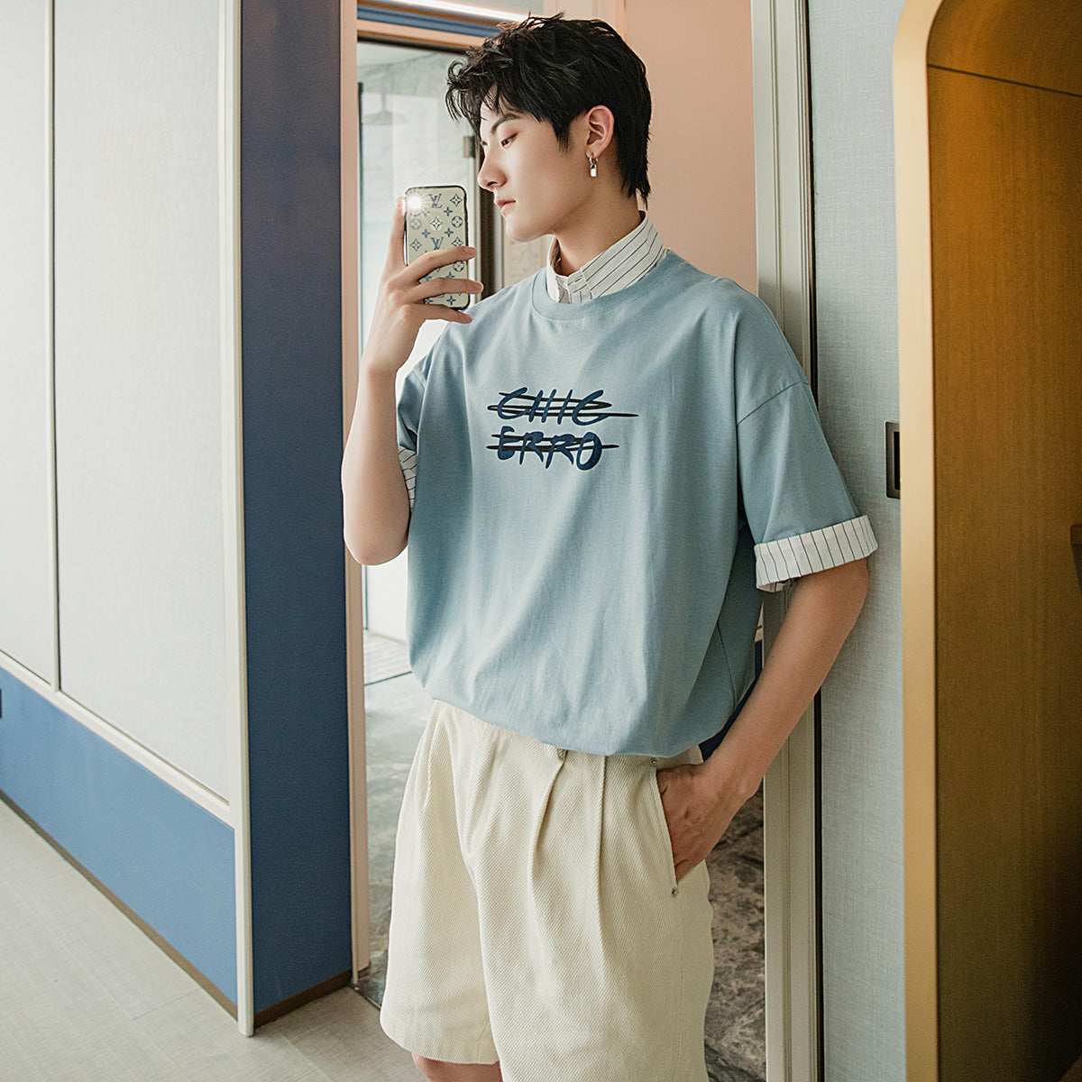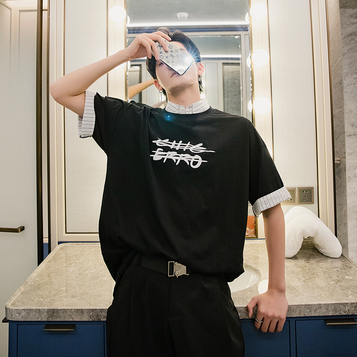 CHIC ERRO Chic Erro clothing style fake two-piece half-sleeved men's trend loose men's stitching shirt collar printing short-sleeved T-shirt