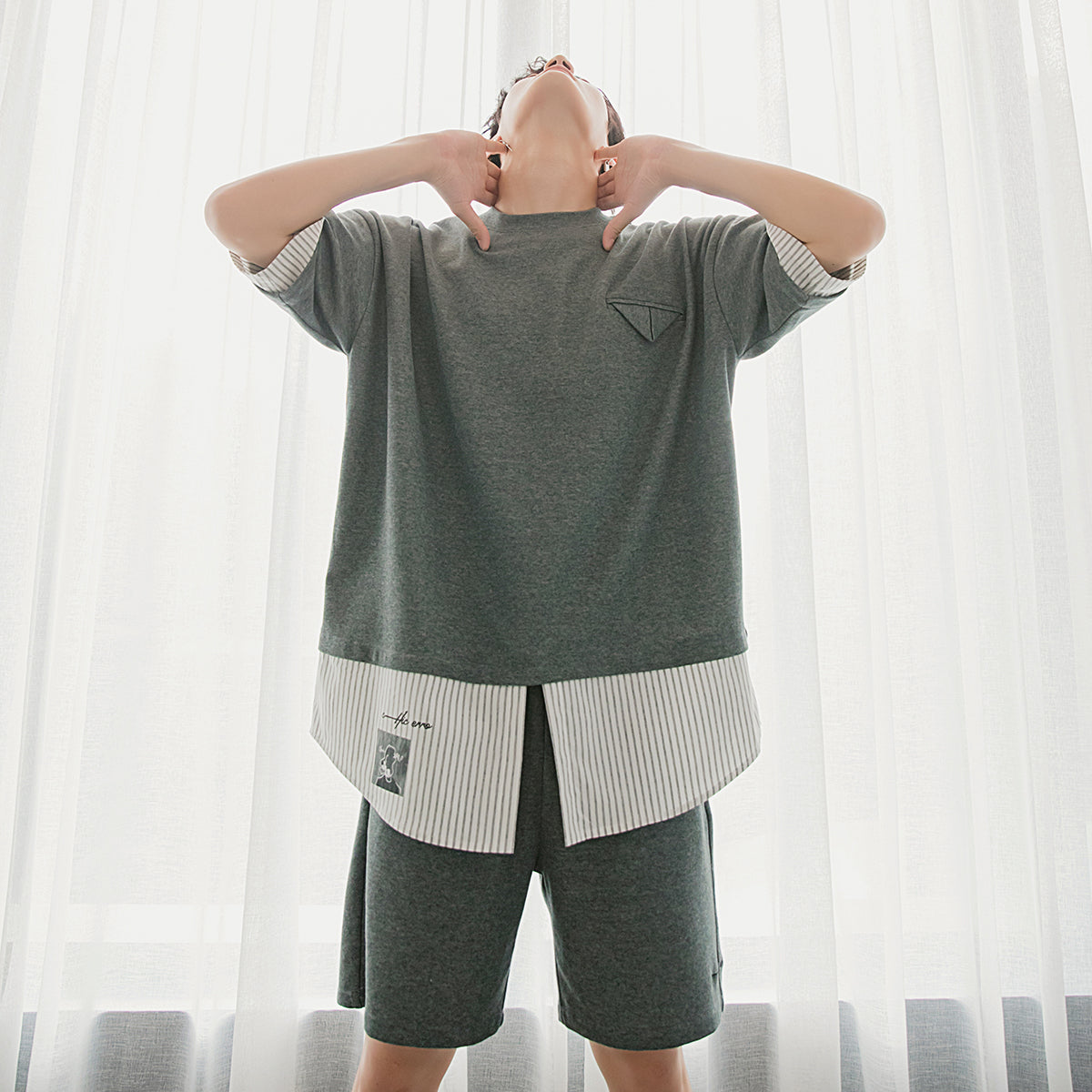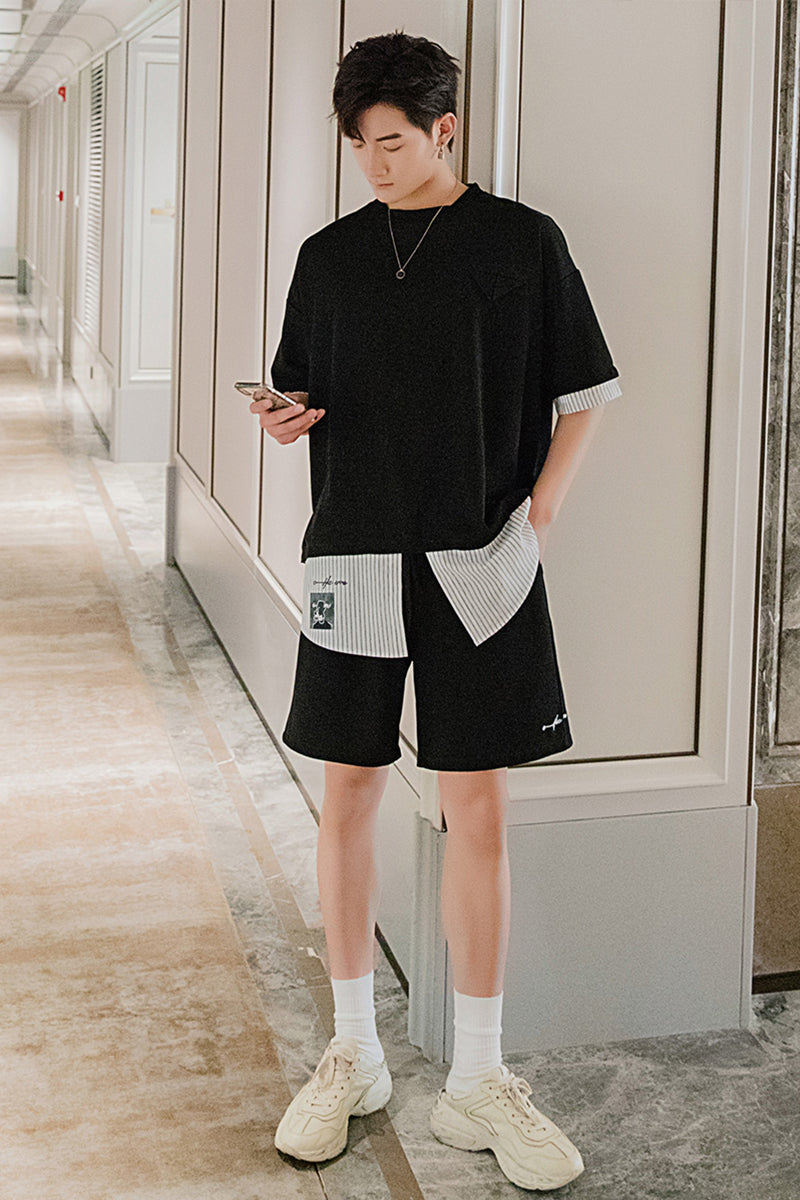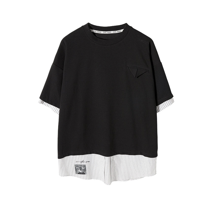 CHIC ERRO Chic Erro clothing style half-sleeved men's tide brand trend loose men's stitching fake two black short-sleeved t-shirts