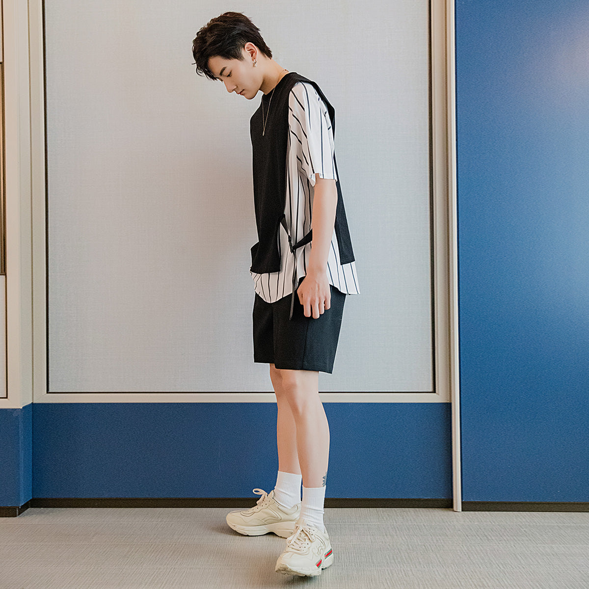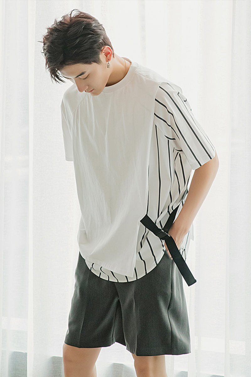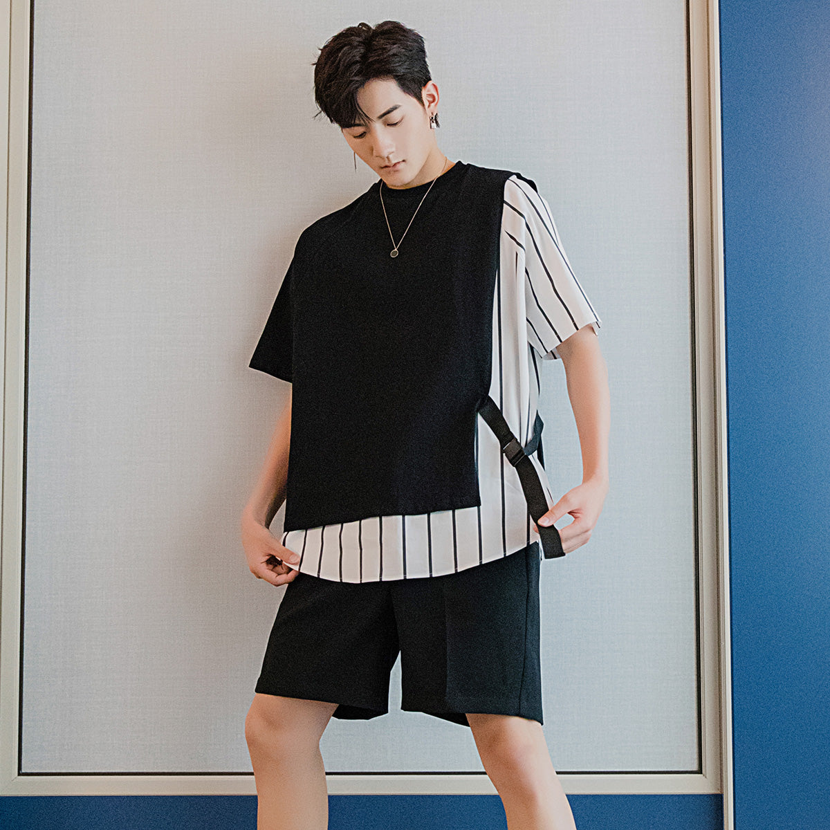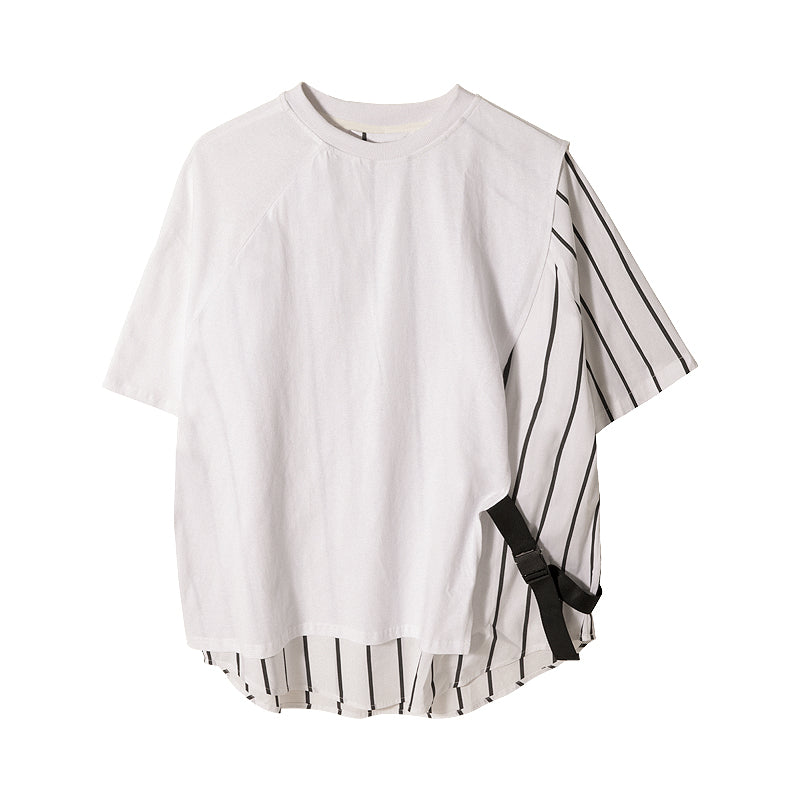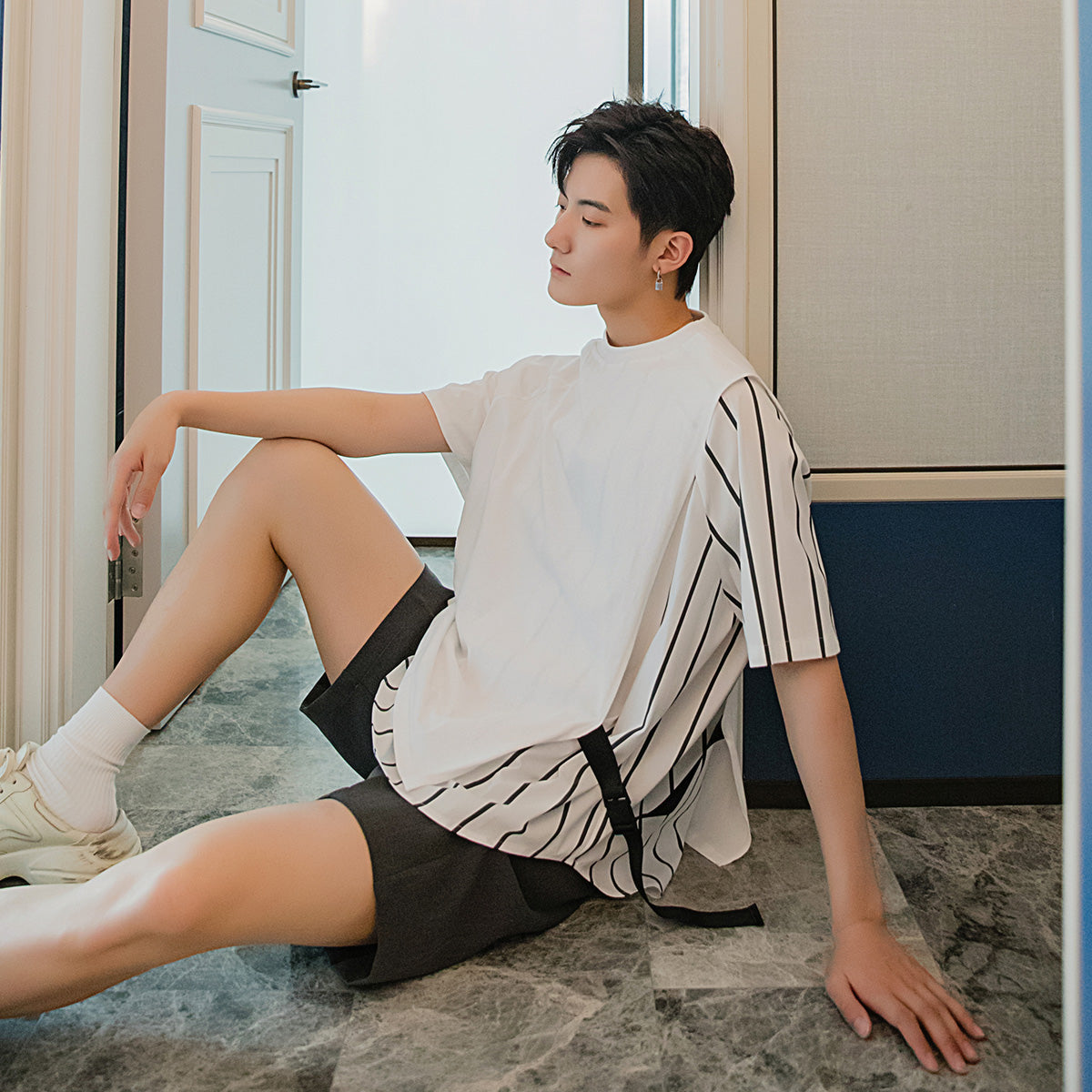 CHIC ERRO Chic Erro clothing style short-sleeved men's trend loose white men's design sense striped stitching fake two-piece t-shirt