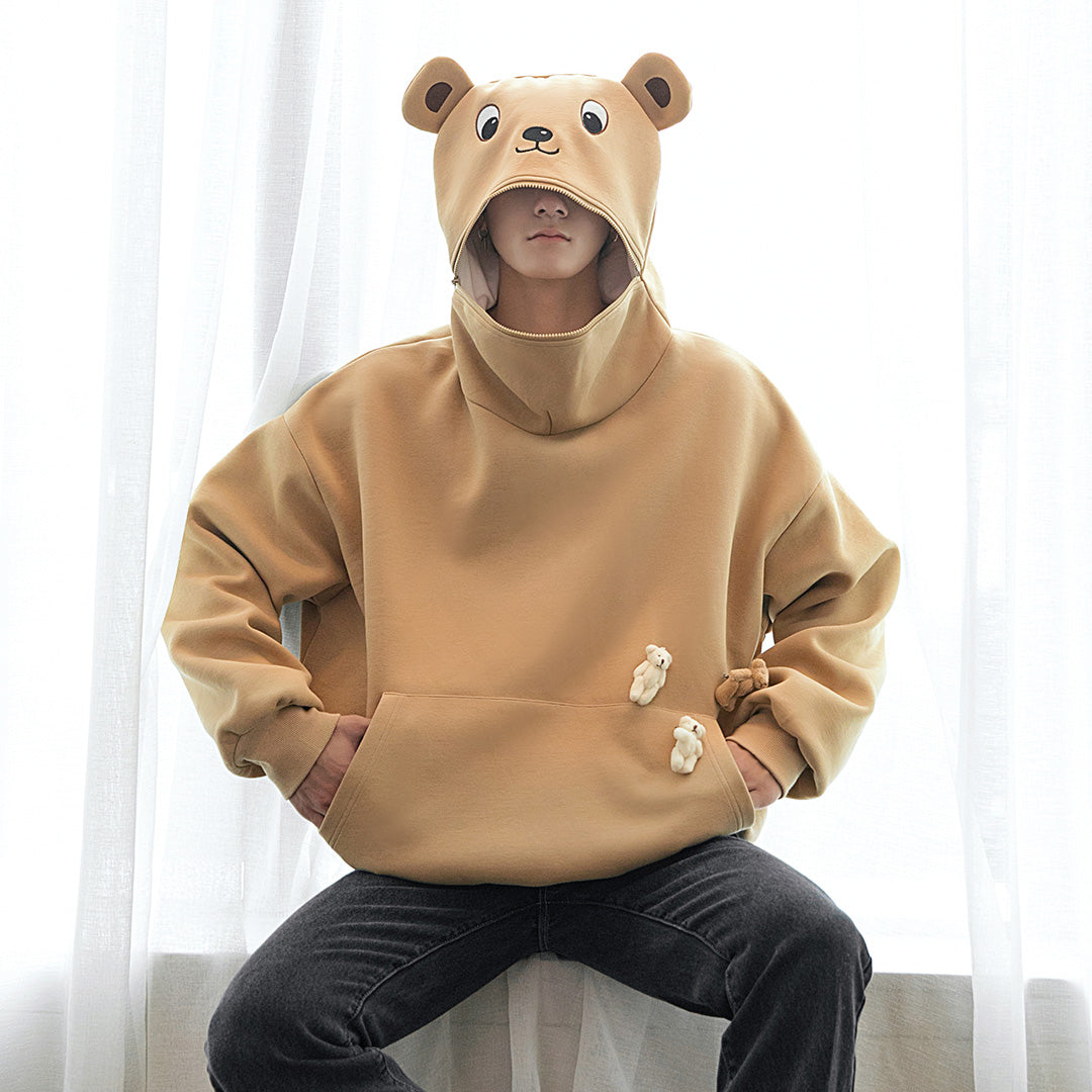 CHIC ERRO Chic Erro cute bear head zipper hat long sleeve trend casual loose lazy style sweater men's hood