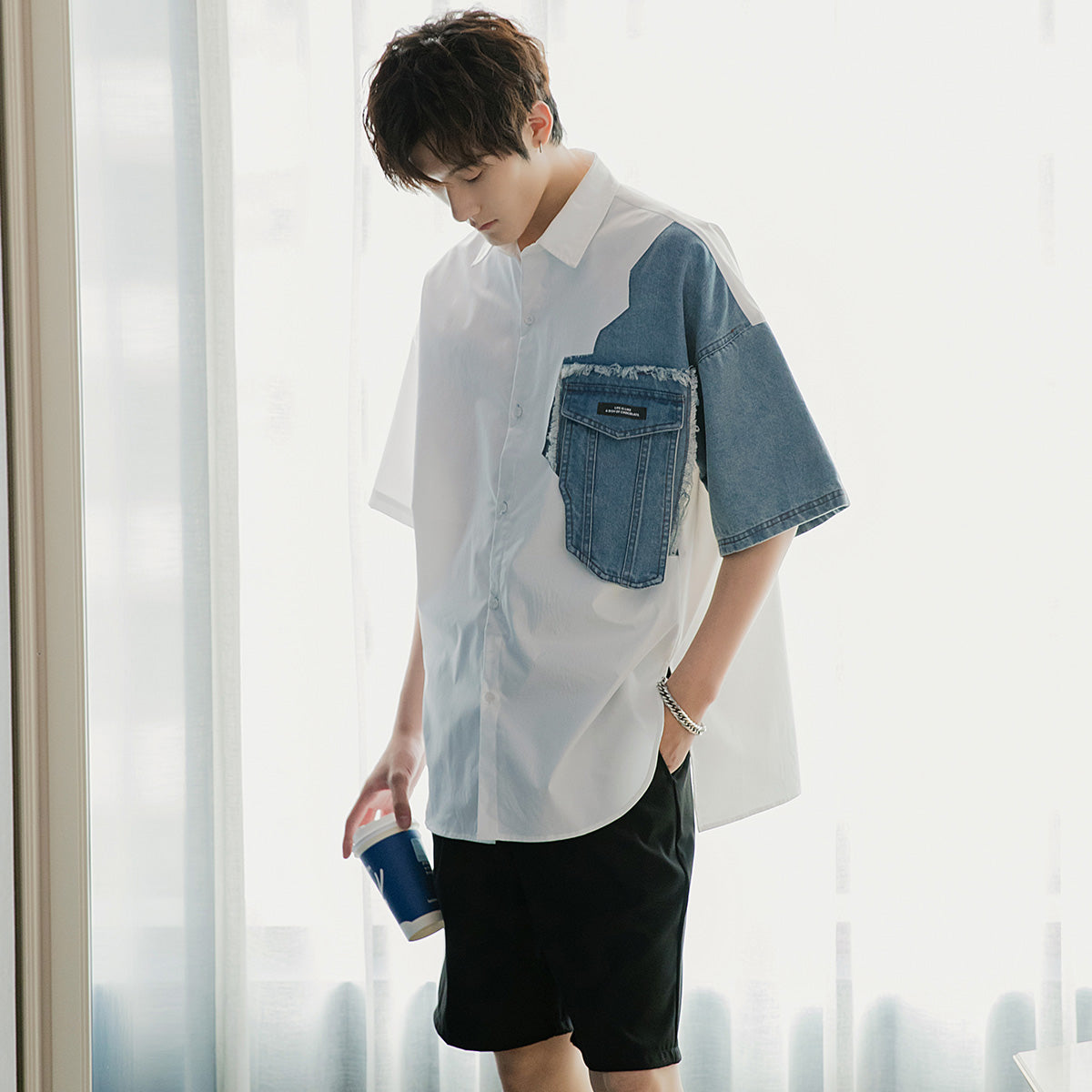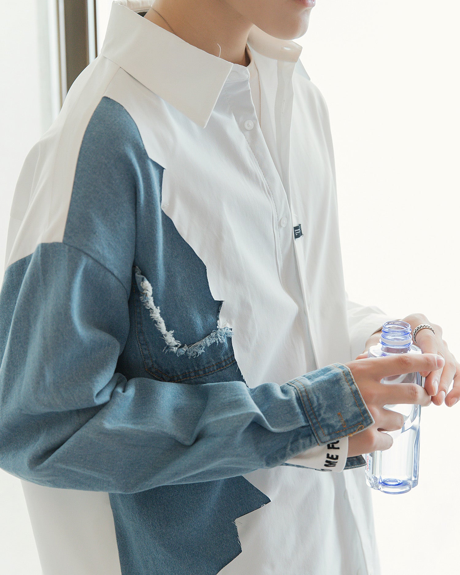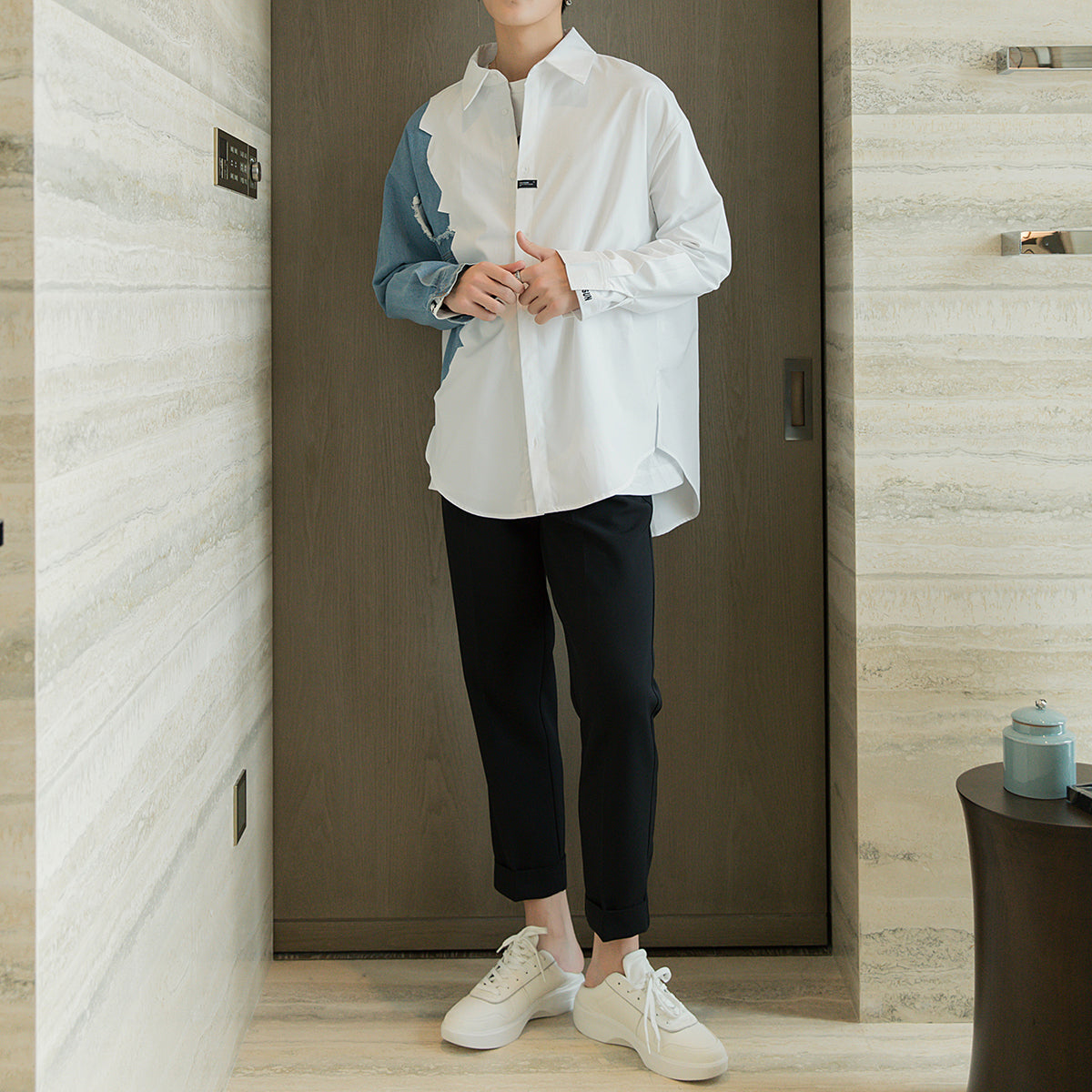 CHIC ERRO Chic Erro design sense stitching white shirt male Korean style trend men's casual white long-sleeved shirt jacket