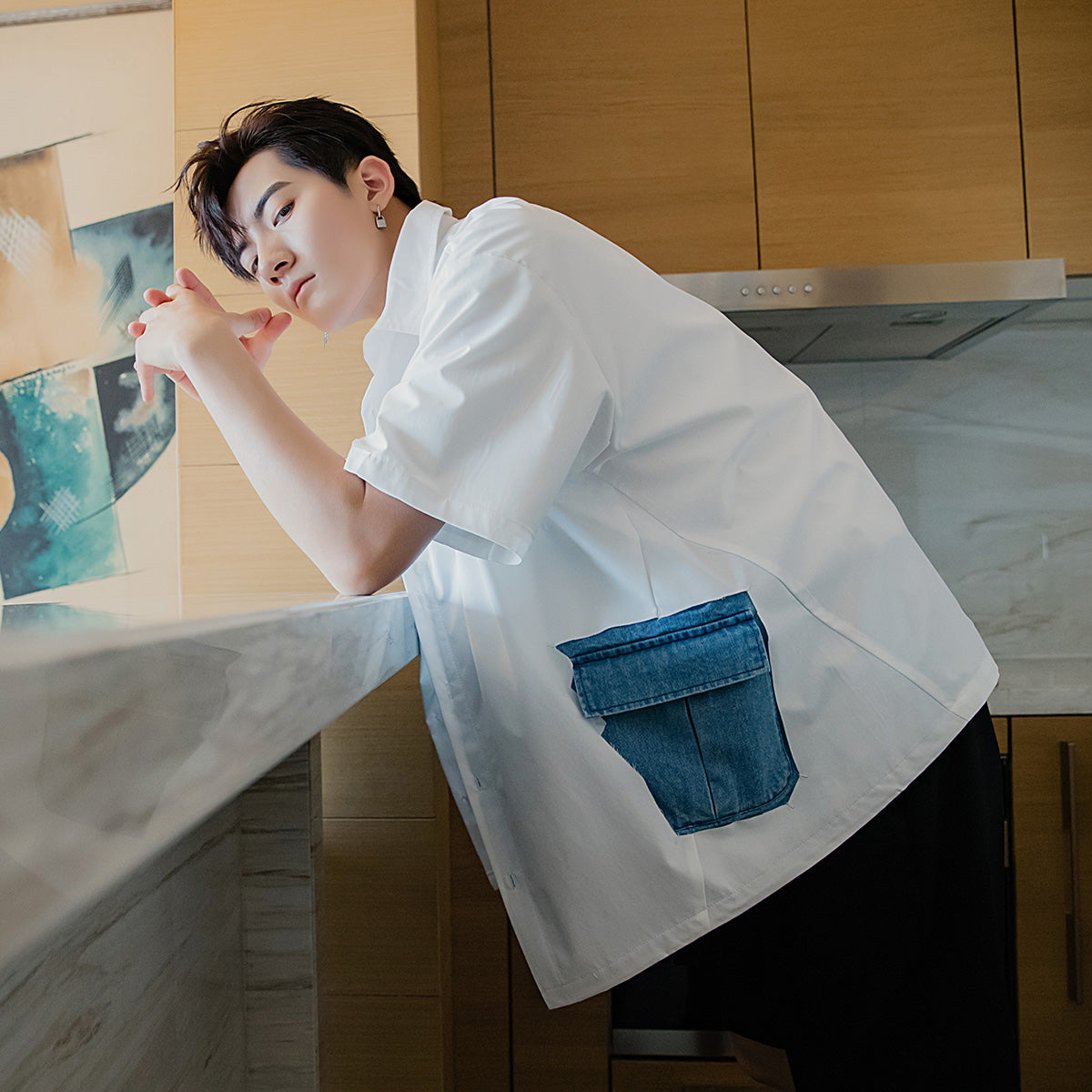 CHIC ERRO Chic Erro design sense white short-sleeved shirt male Korean style trend loose half-sleeved stitching white shirt