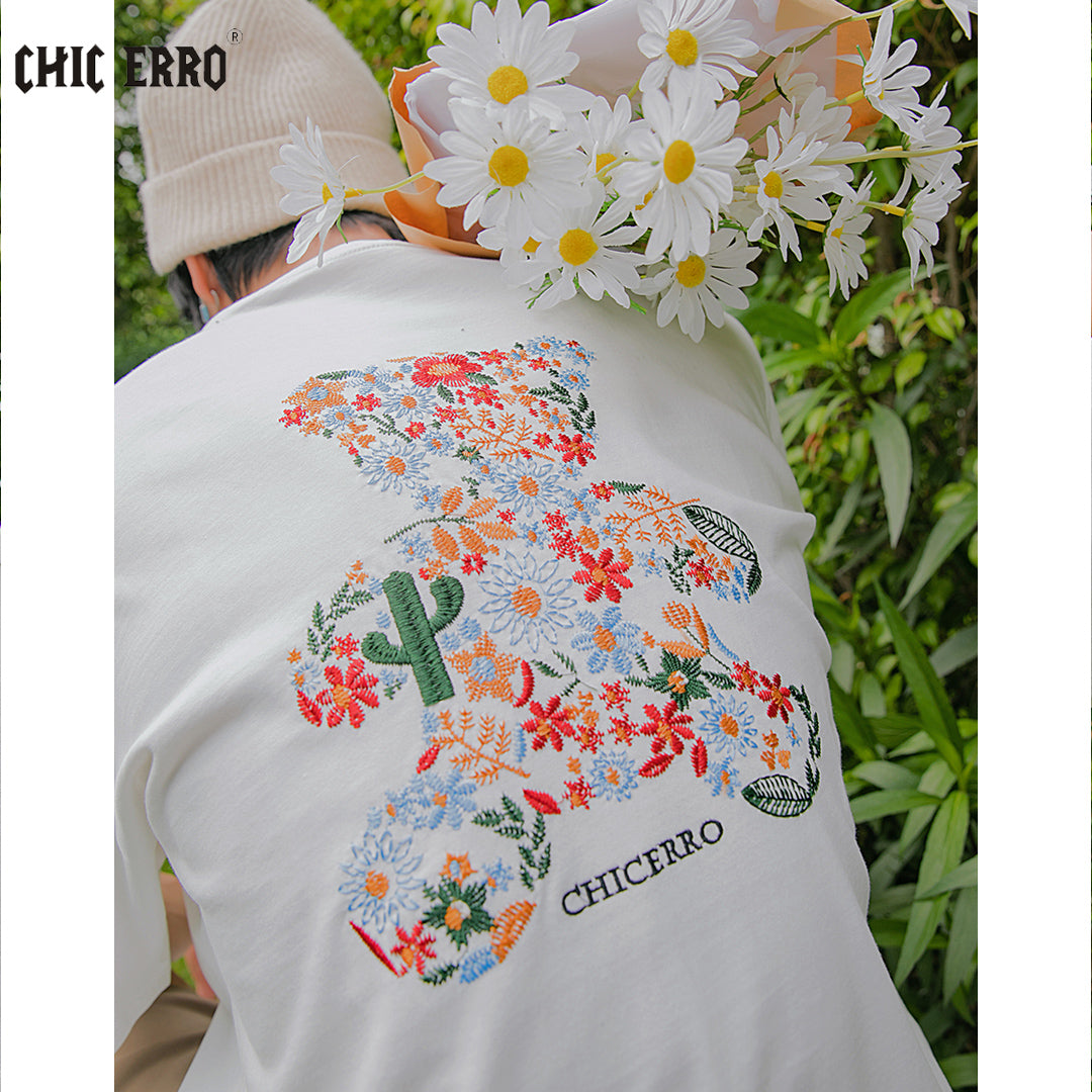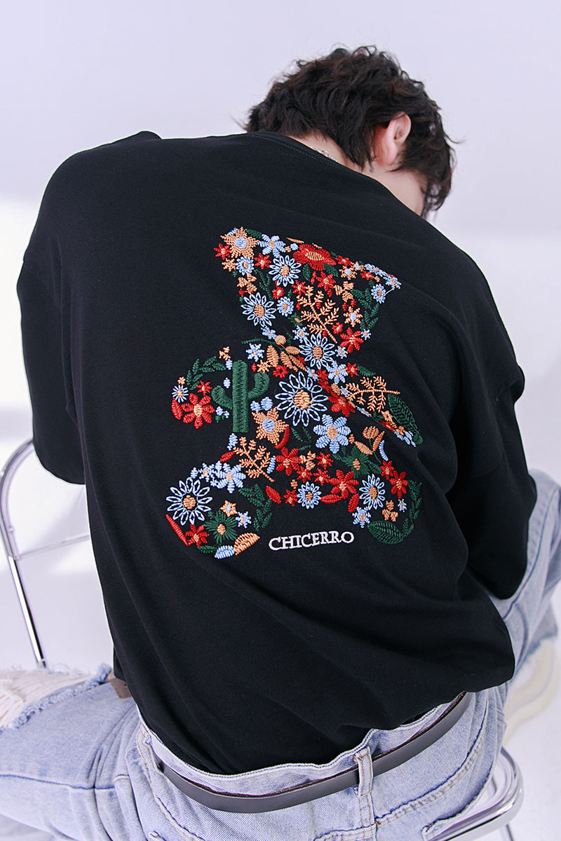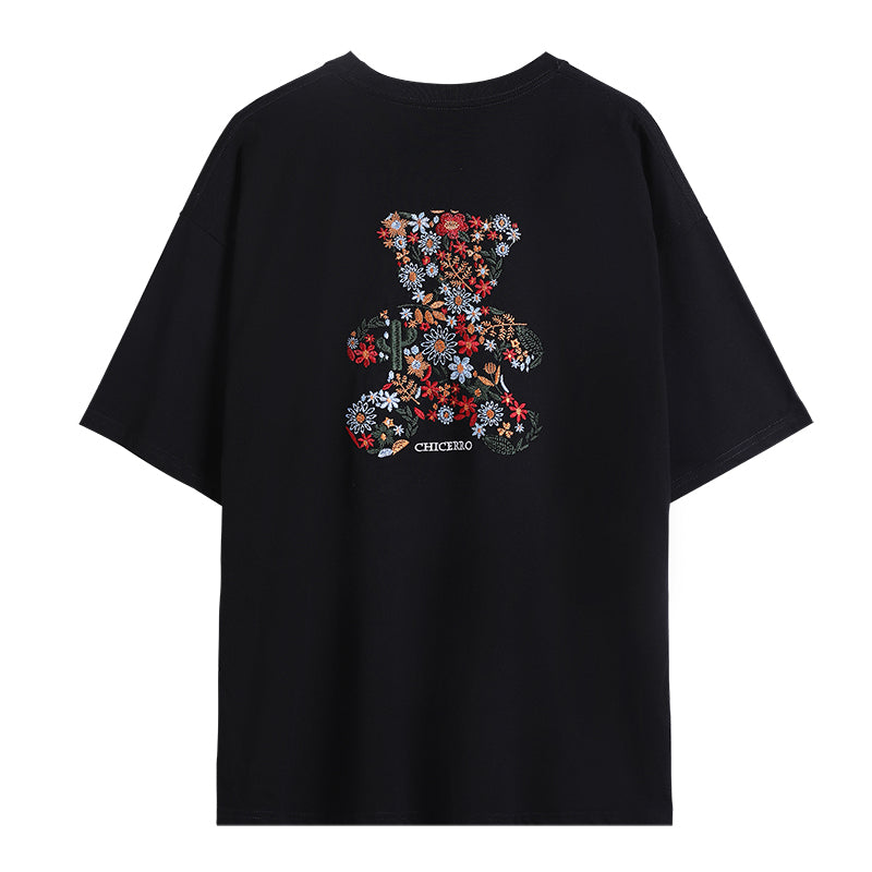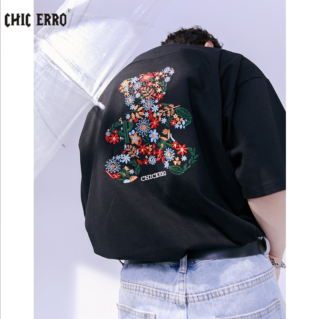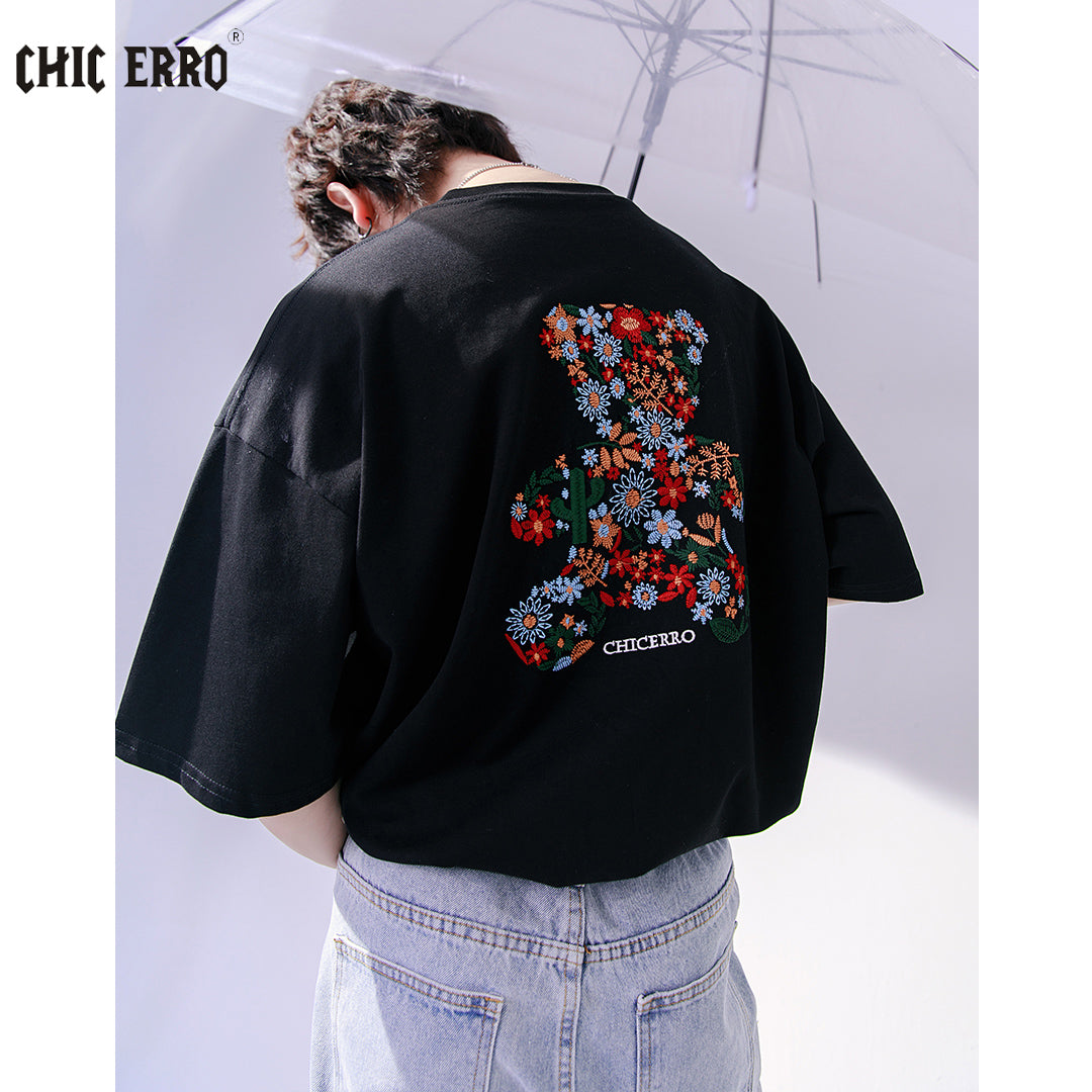 CHIC ERRO Chic Erro embroidery flower round neck short-sleeved t-shirt men's summer casual men's creative bear loose top