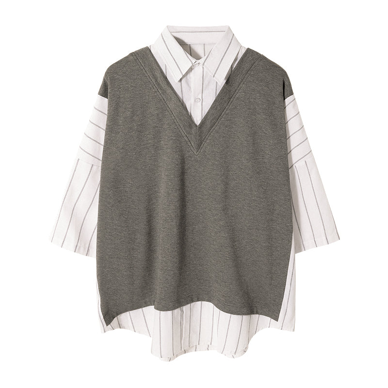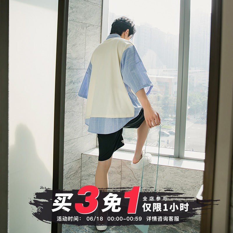 CHIC ERRO Chic Erro fake two-piece splicing striped short-sleeved shirt male Korean version of the trend loose three-quarter sleeve shirt