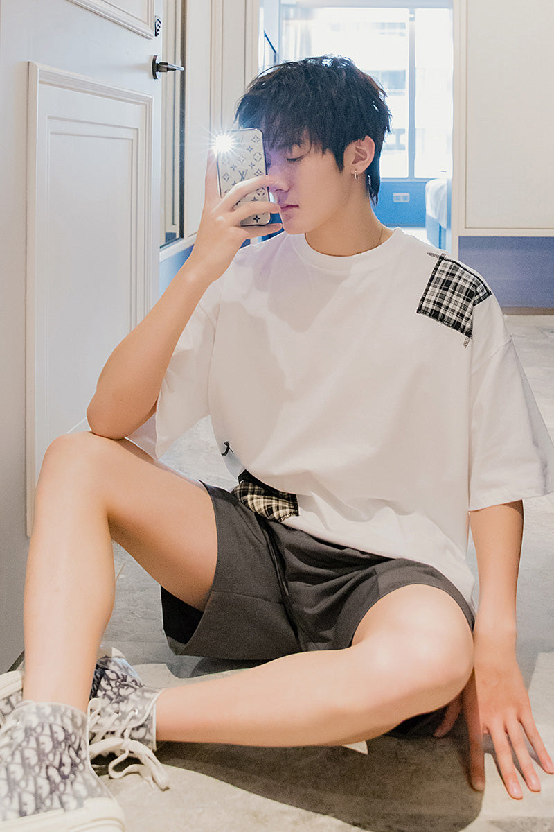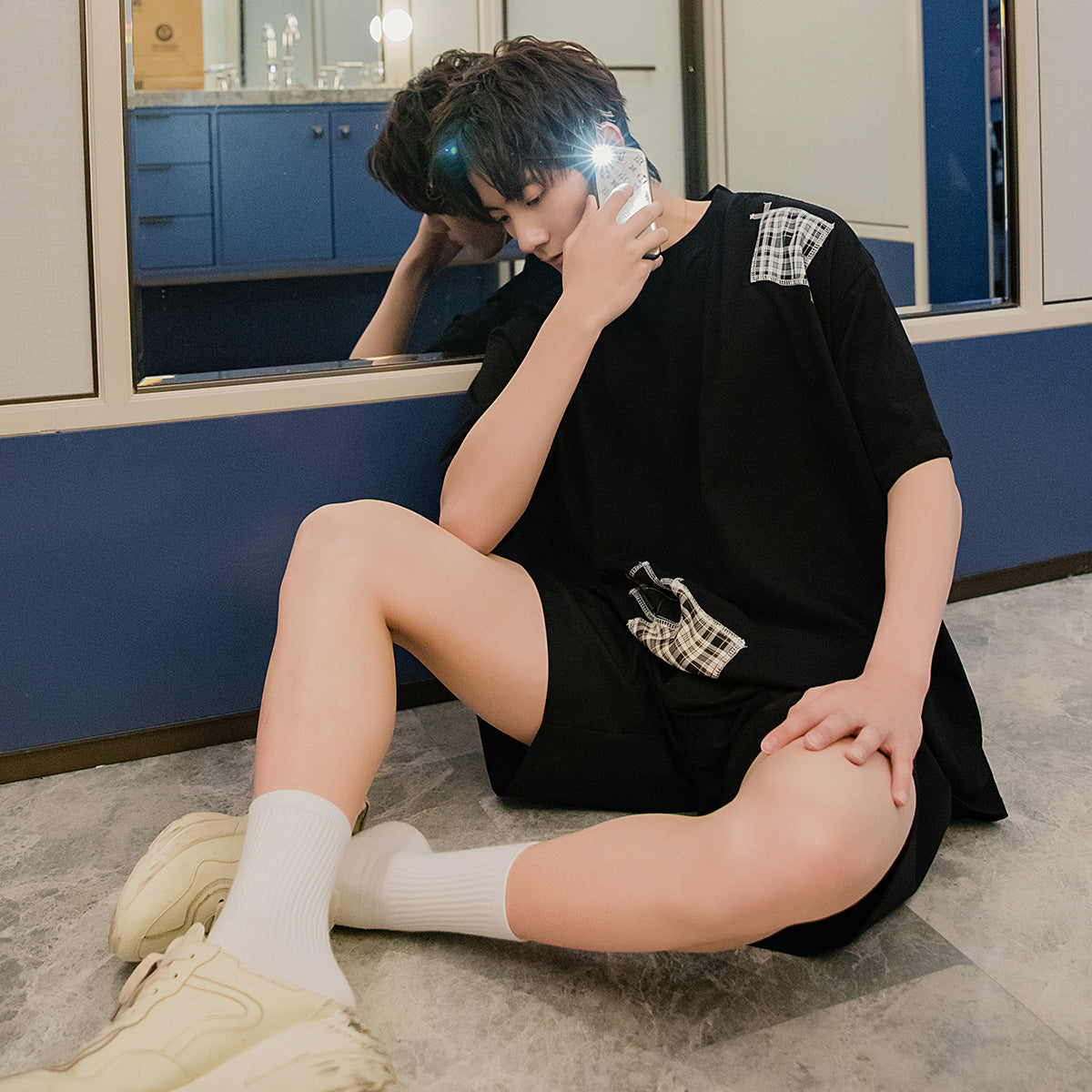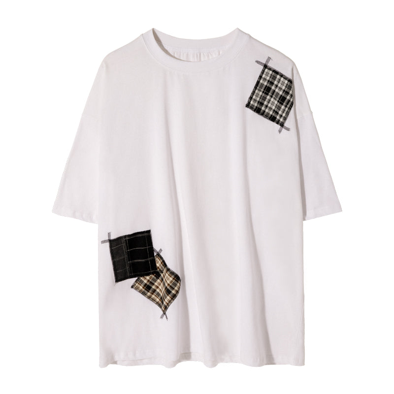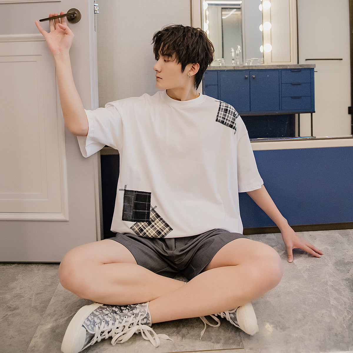 CHIC ERRO Chic Erro Harajuku style short-sleeved men's tide brand trend loose men's five-point sleeve lattice stitching white t-shirt