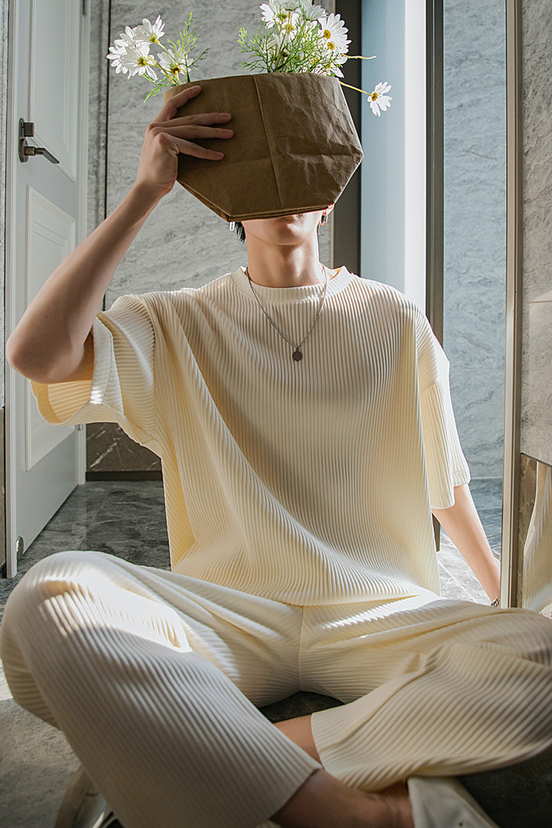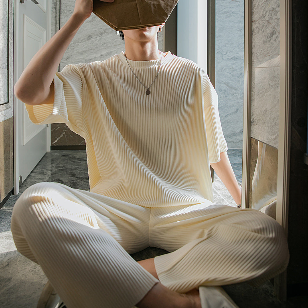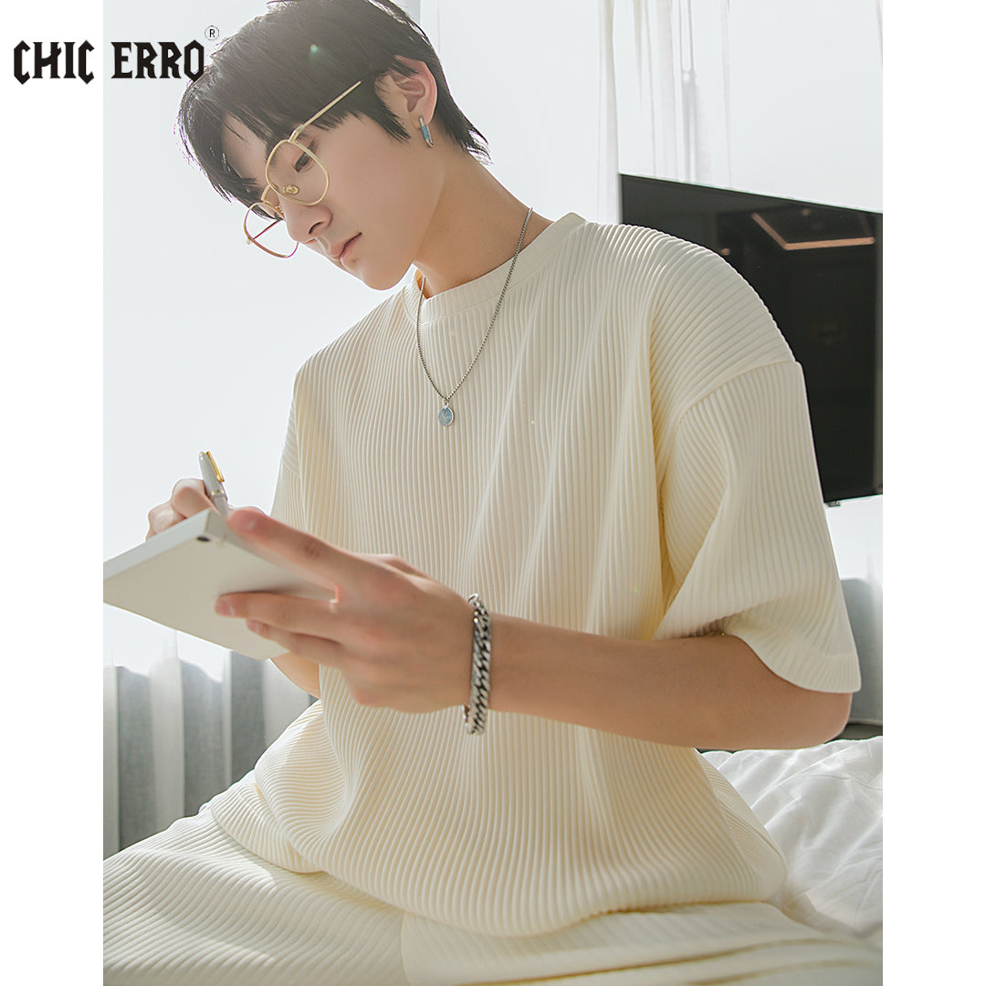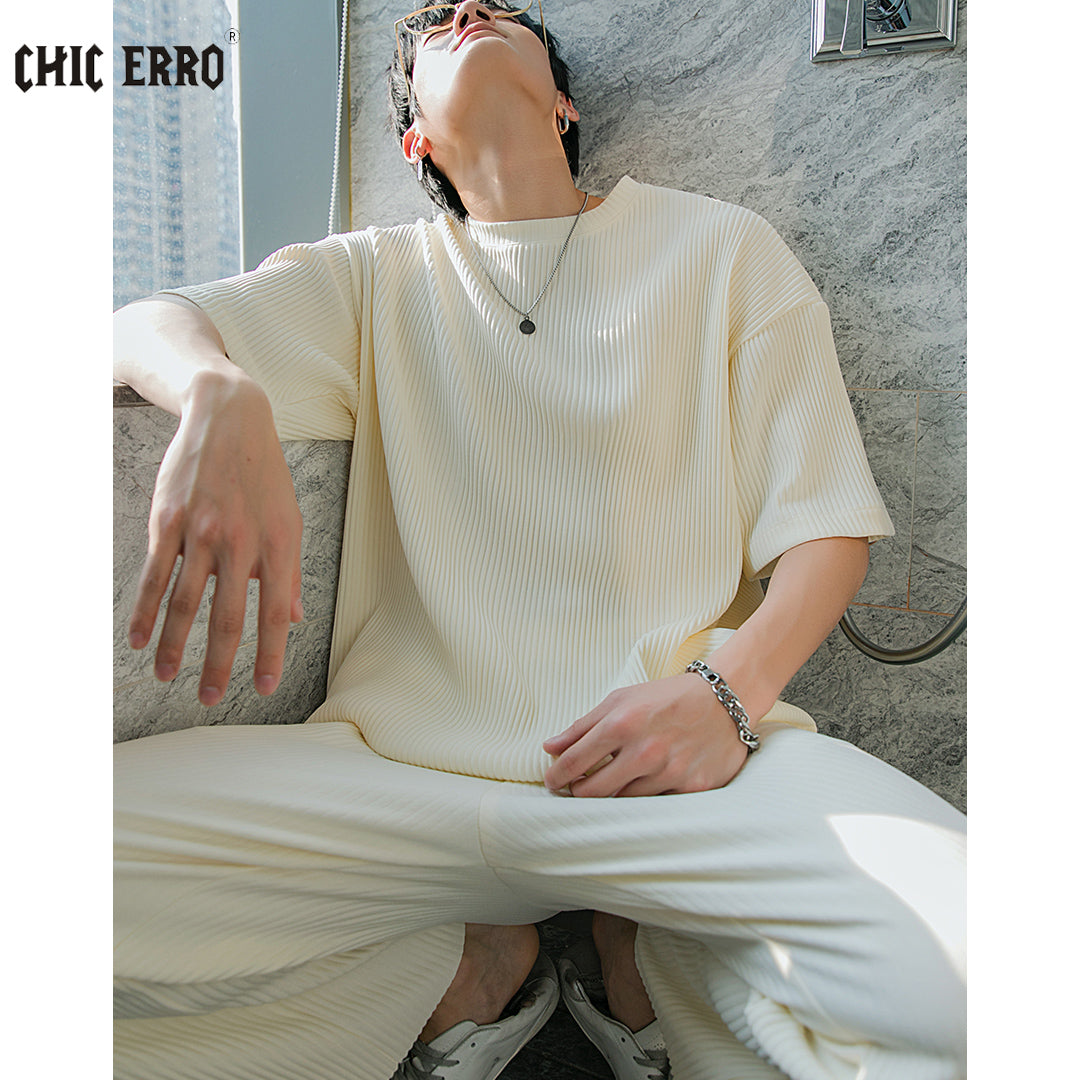 CHIC ERRO Chic Erro men's casual suit summer thin loose striped short-sleeved trousers knitted handsome two-piece suit