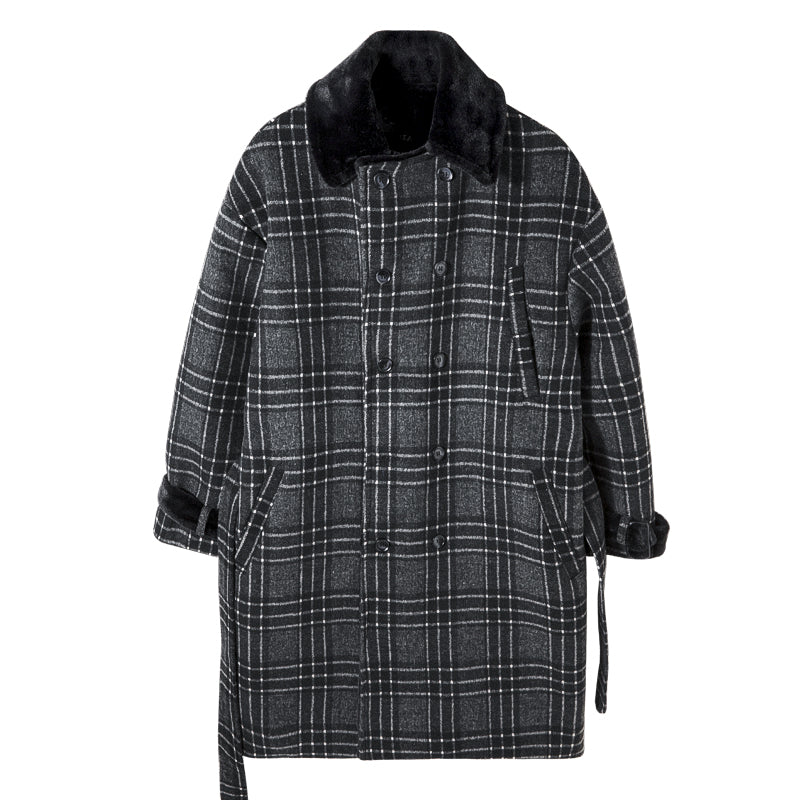 CHIC ERRO Chic Erro mid-length belted woolen coat Korean style handsome plaid stitching thick coat