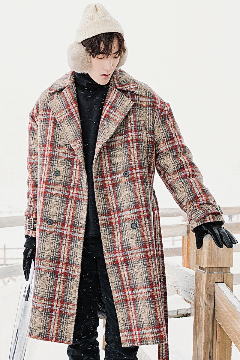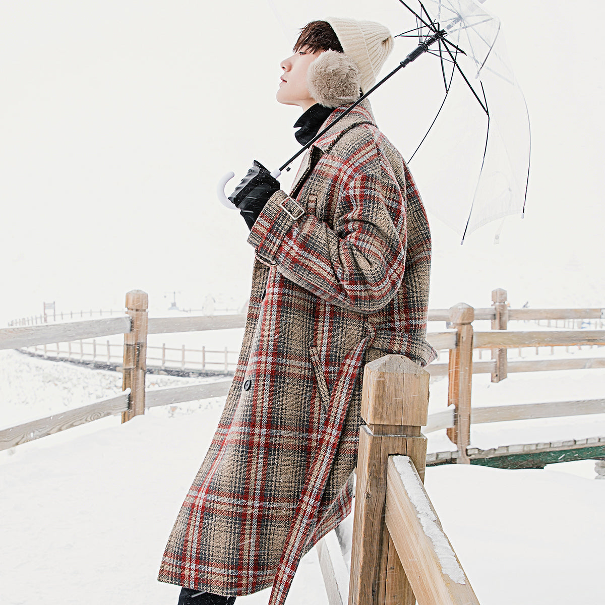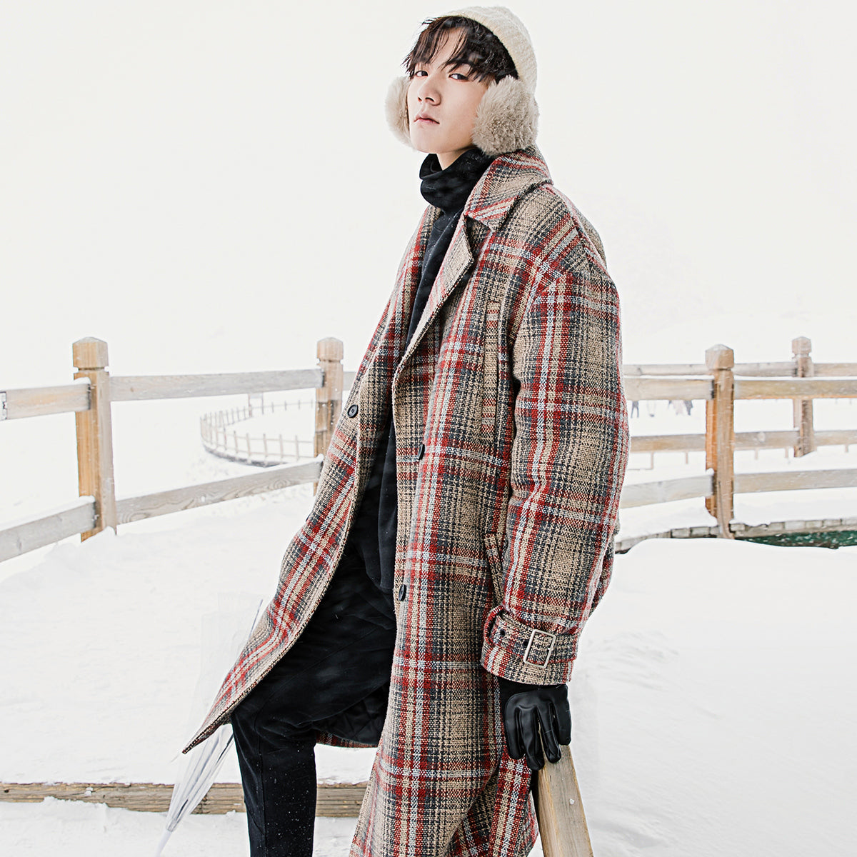CHIC ERRO Chic Erro plaid jacket men's autumn and winter Korean version of the trend in the long section of the knee thick woolen coat