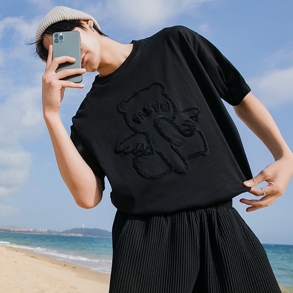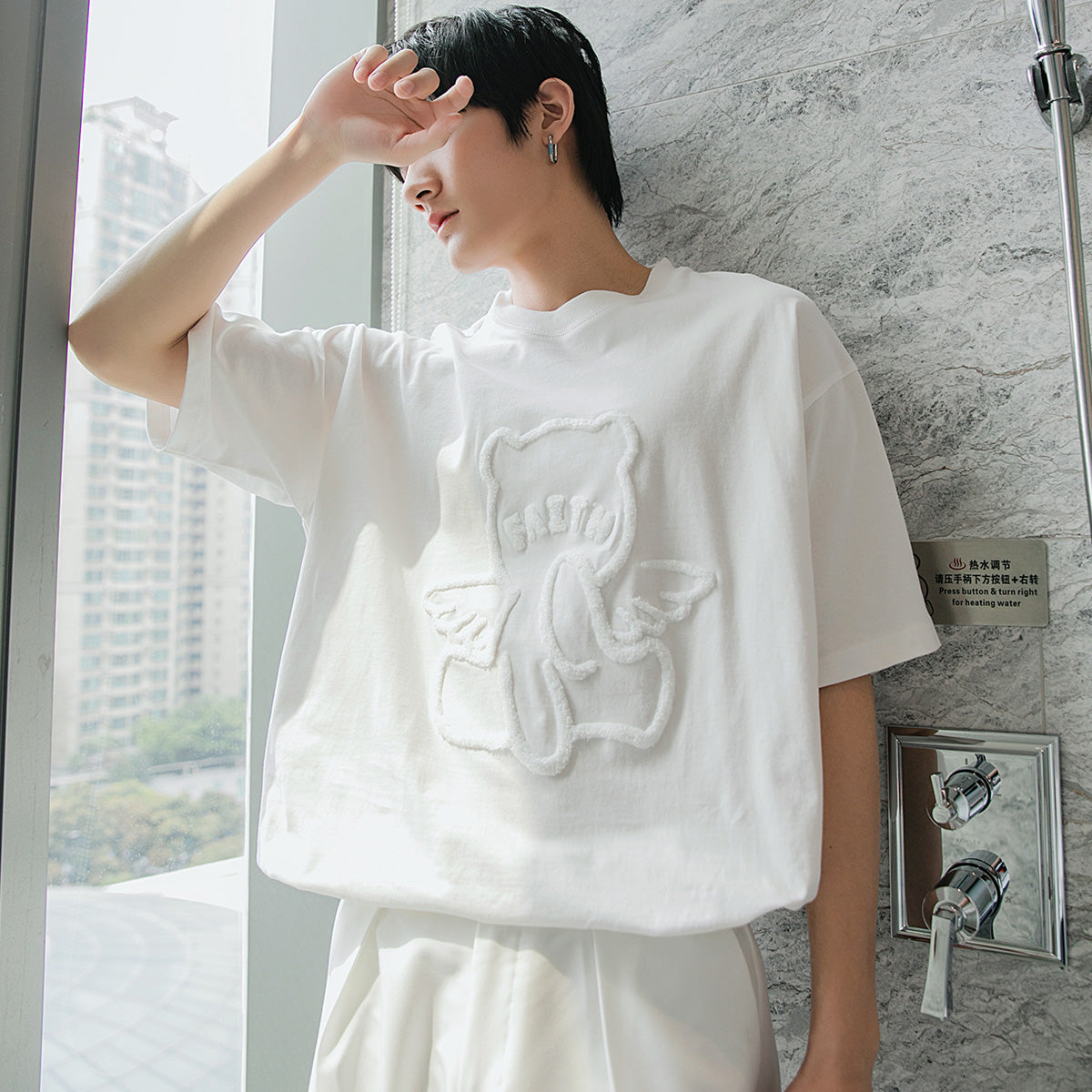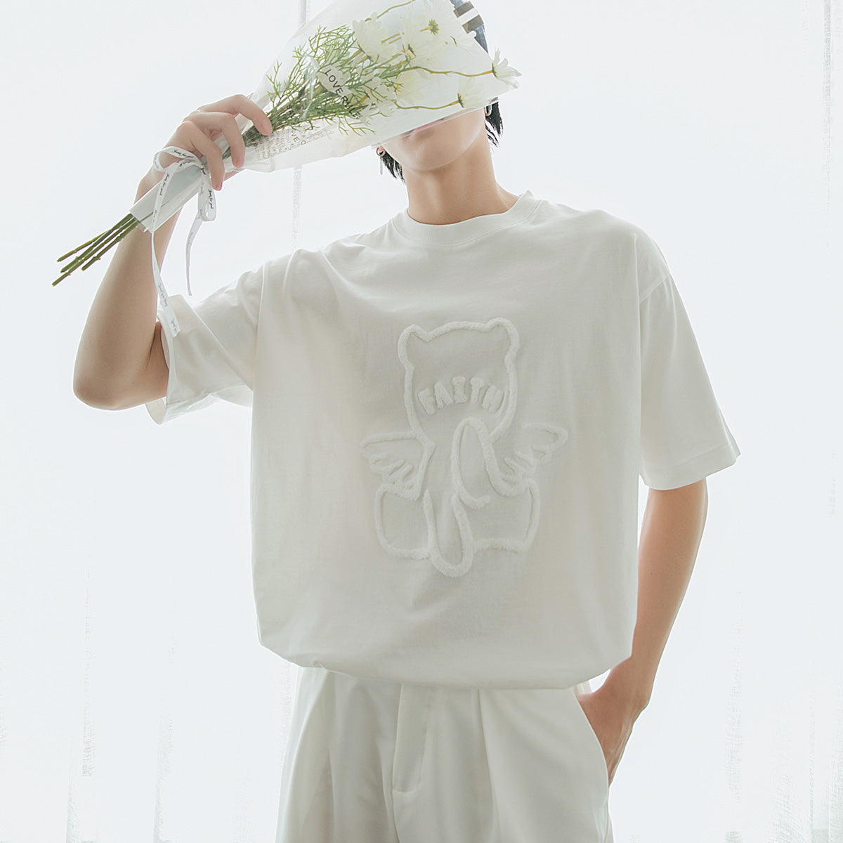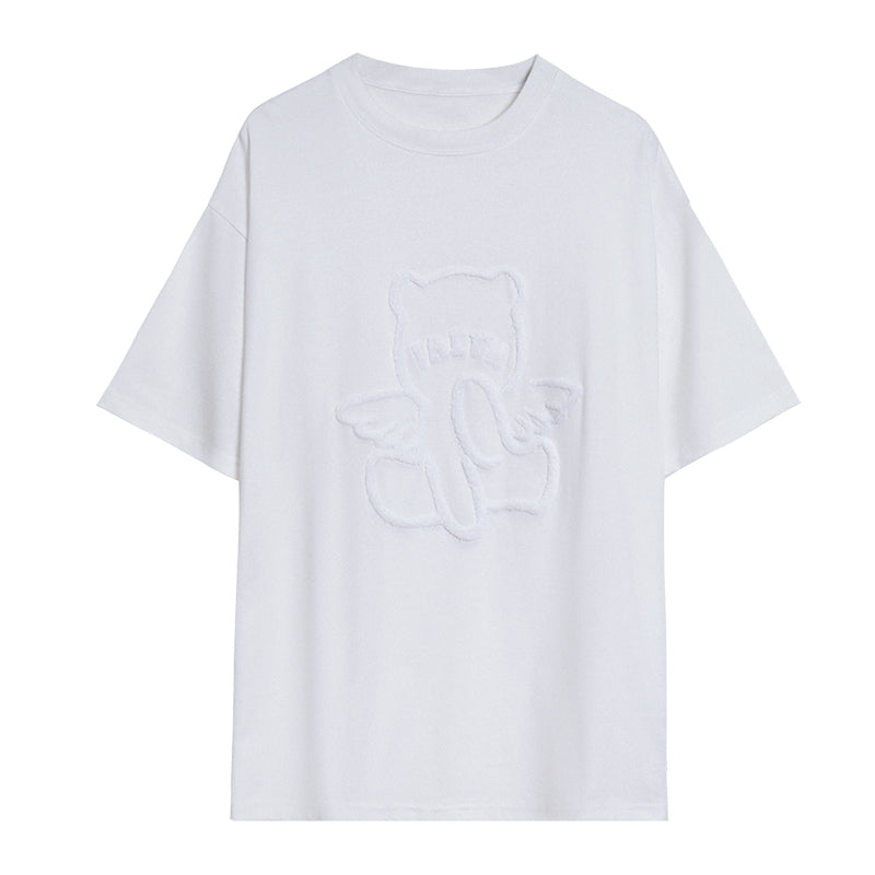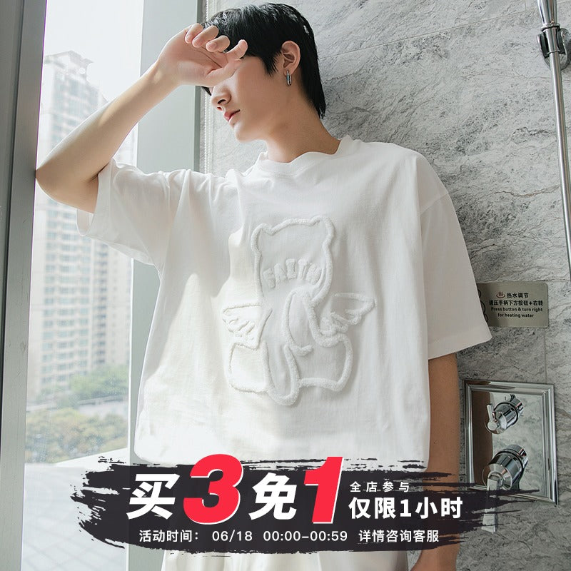 CHIC ERRO Chic Erro round neck short-sleeved t-shirt men's trendy brand loose cartoon bear print top casual white compassionate shirt