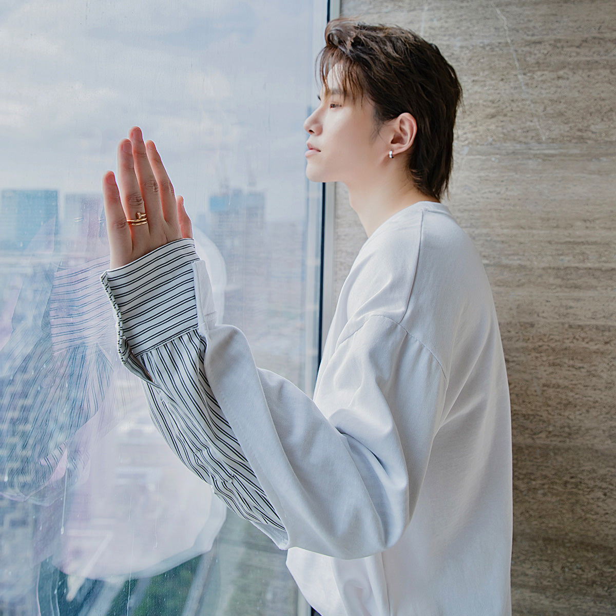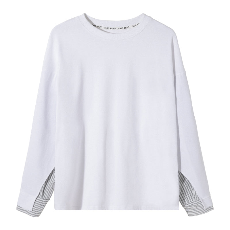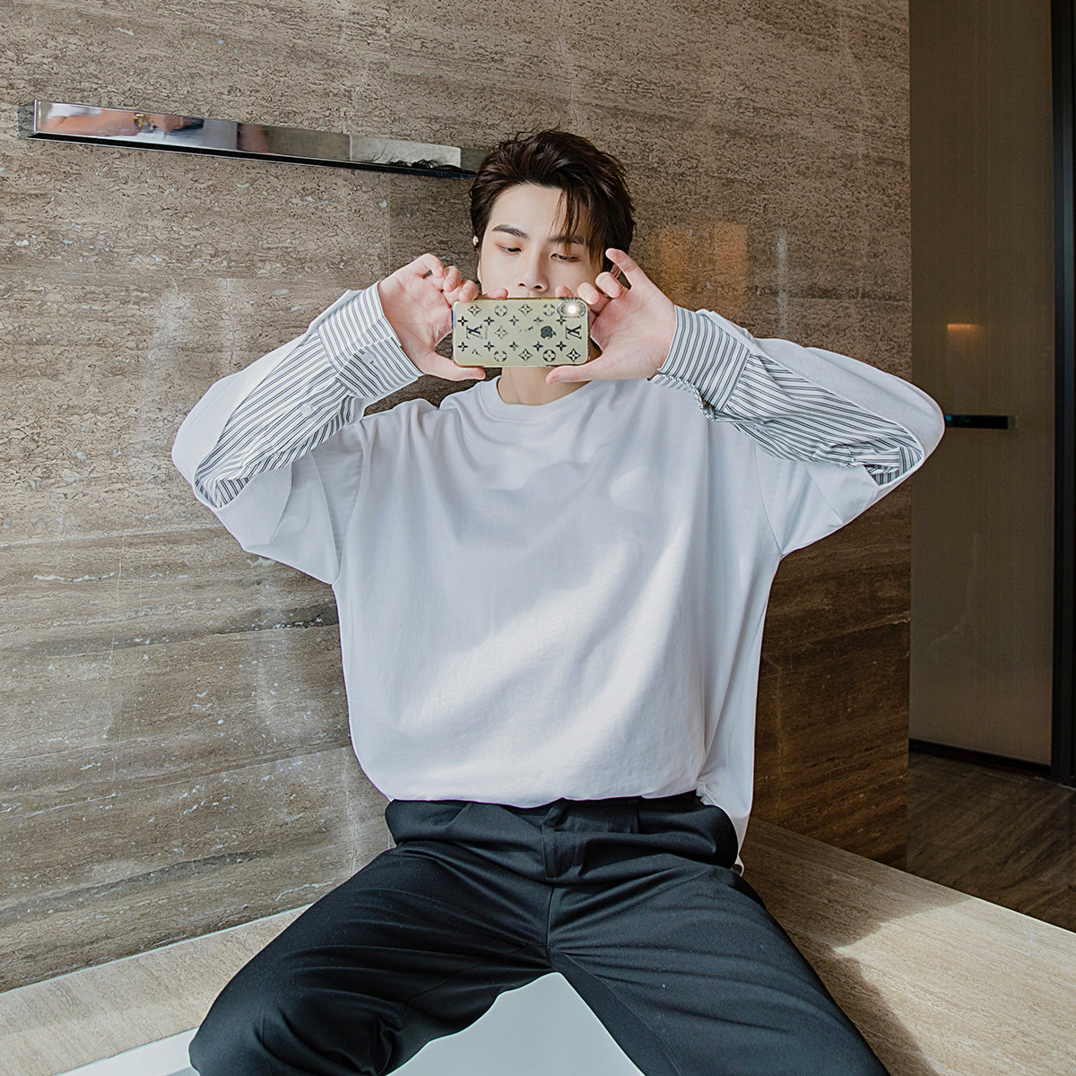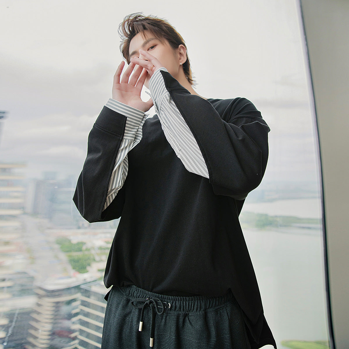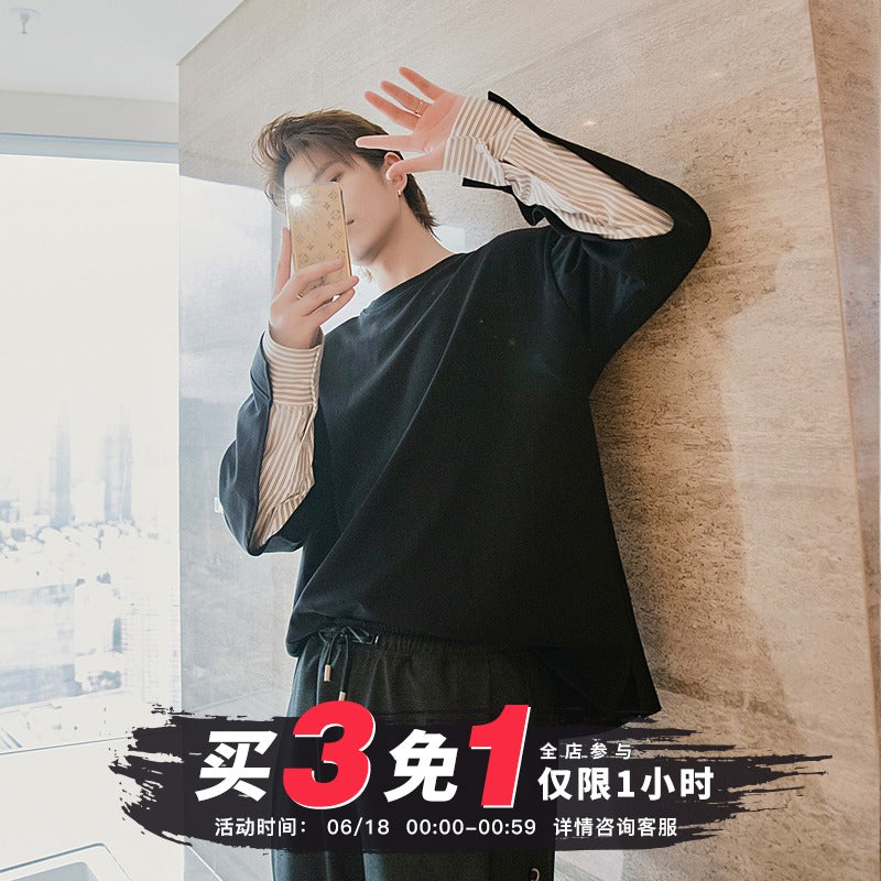 CHIC ERRO Chic Erro spring men's shirt loose striped stitching fake two-piece casual round neck sweater men's trend