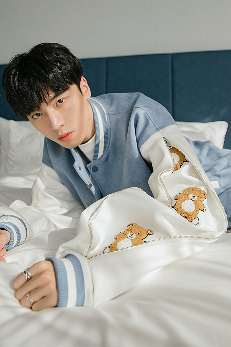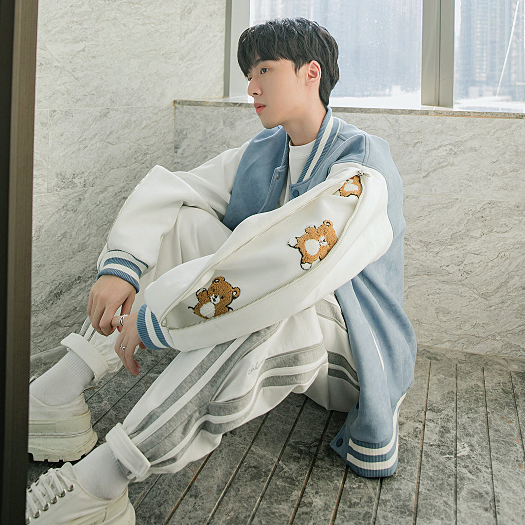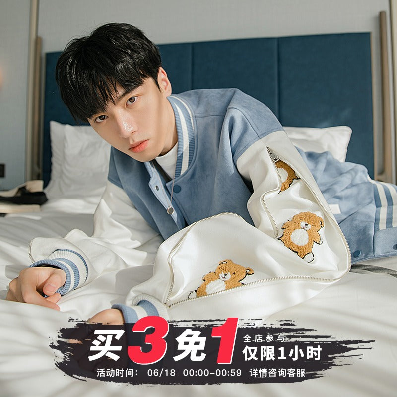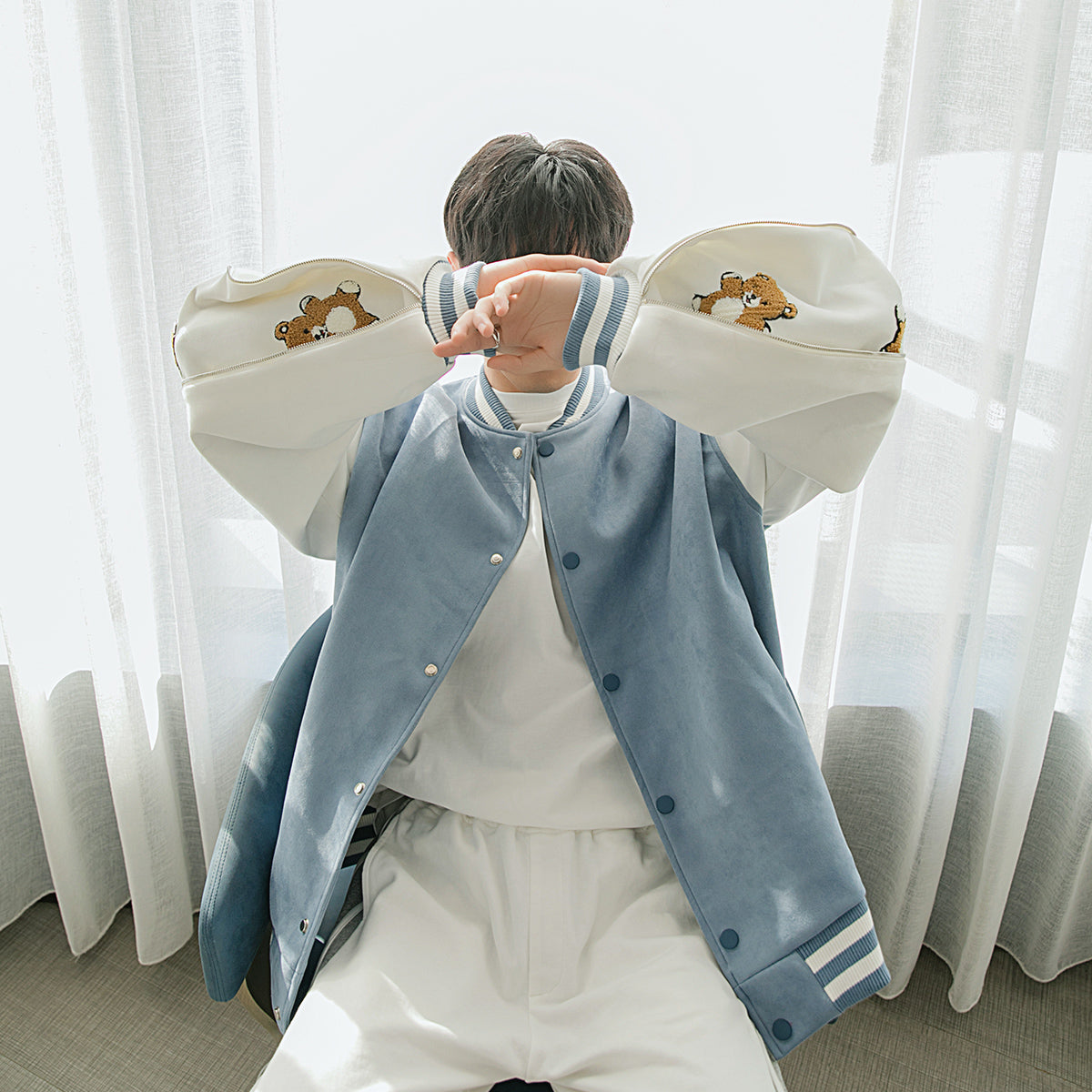 CHIC ERRO Chic Erro spring new cute bear flocking baseball uniform contrast stitching long-sleeved loose jacket jacket