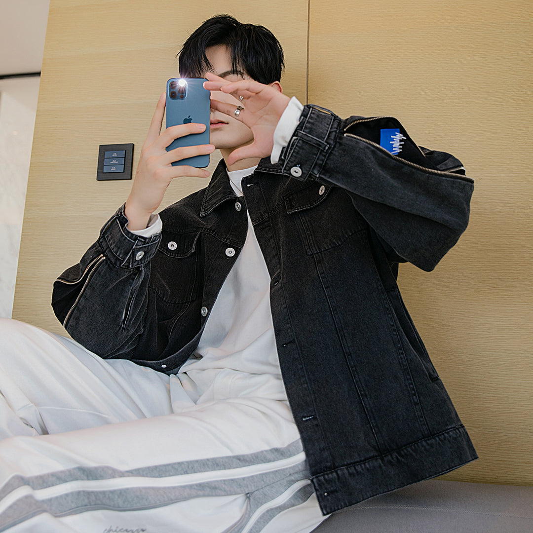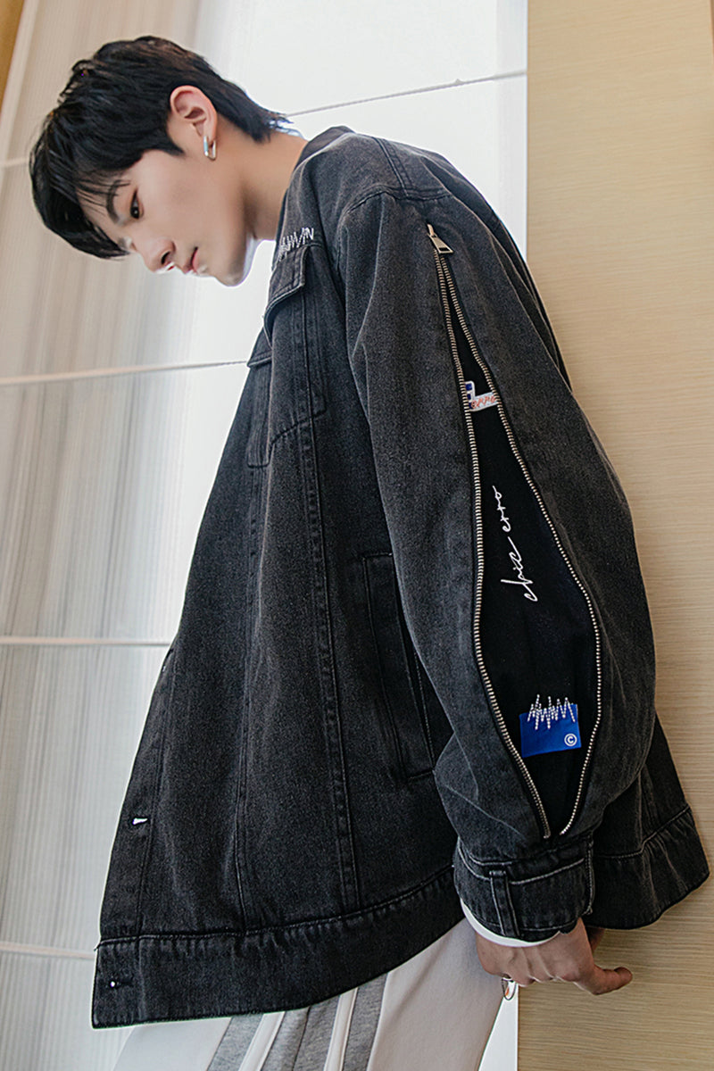 CHIC ERRO Chic Erro spring new lapel denim jacket zipper embroidery Korean trend loose handsome jacket men