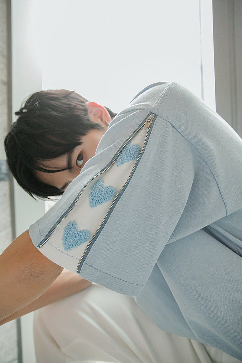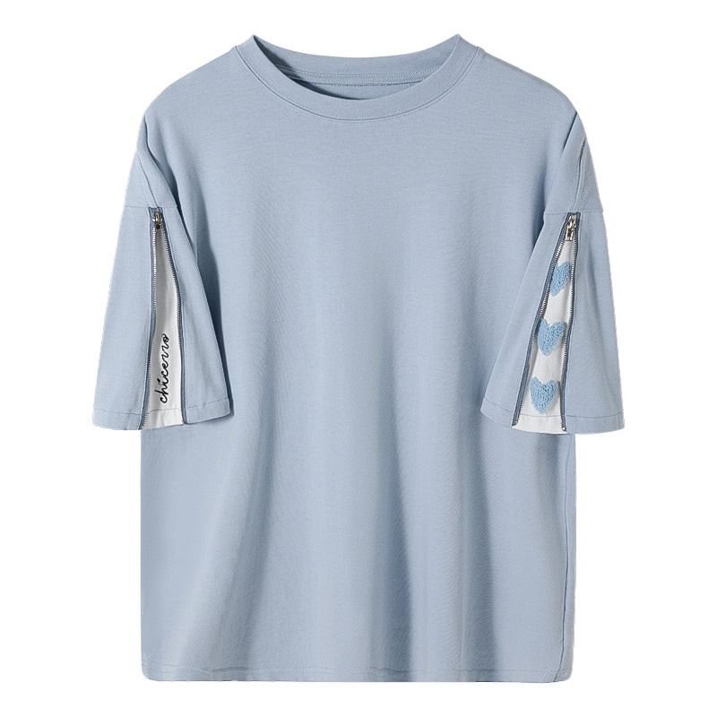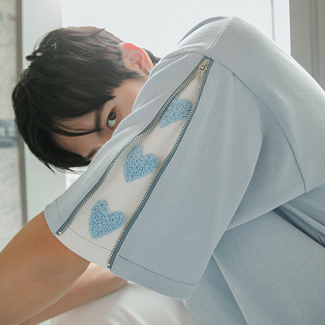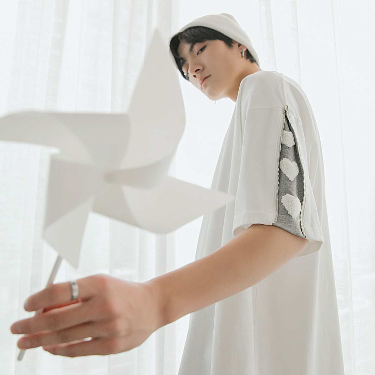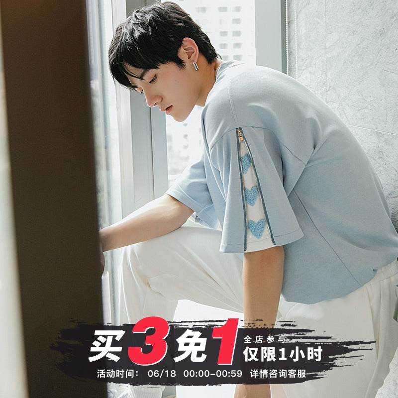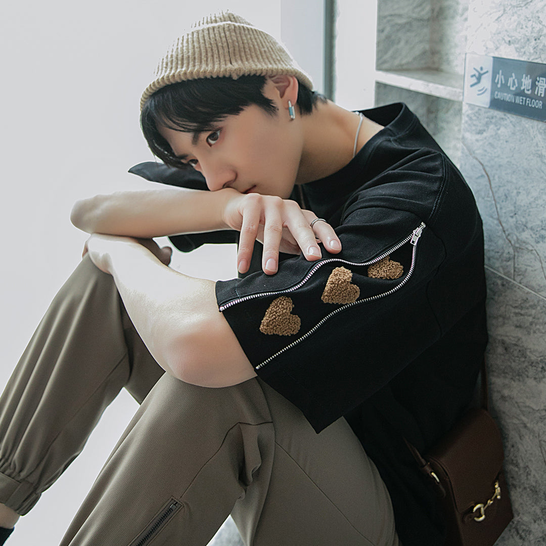 CHIC ERRO Chic Erro spring round neck sweater men's trendy ins loose slit flocking printed youth short-sleeved shirt
