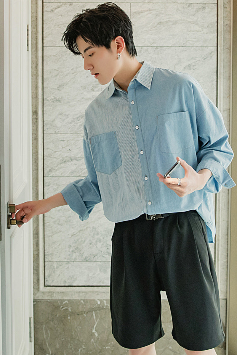 CHIC ERRO Chic Erro striped stitching shirt men's Korean version of the trend of men's loose thin three-quarter sleeve shirt jacket