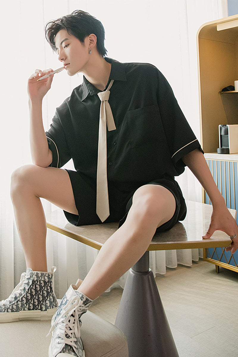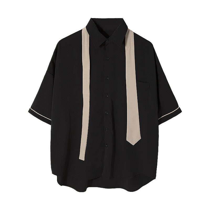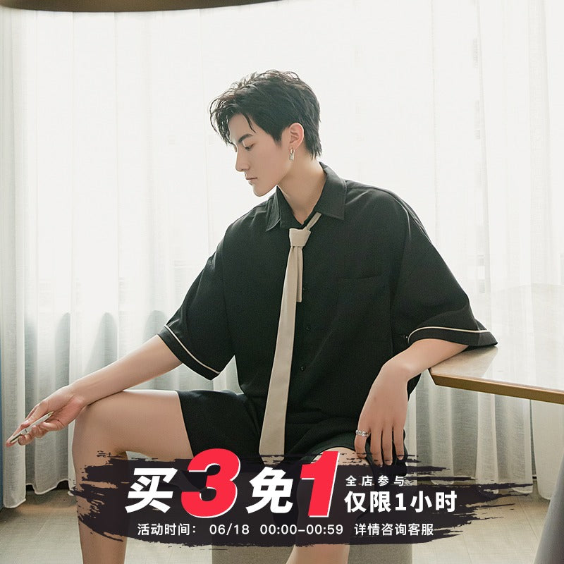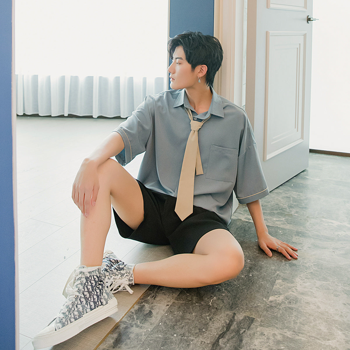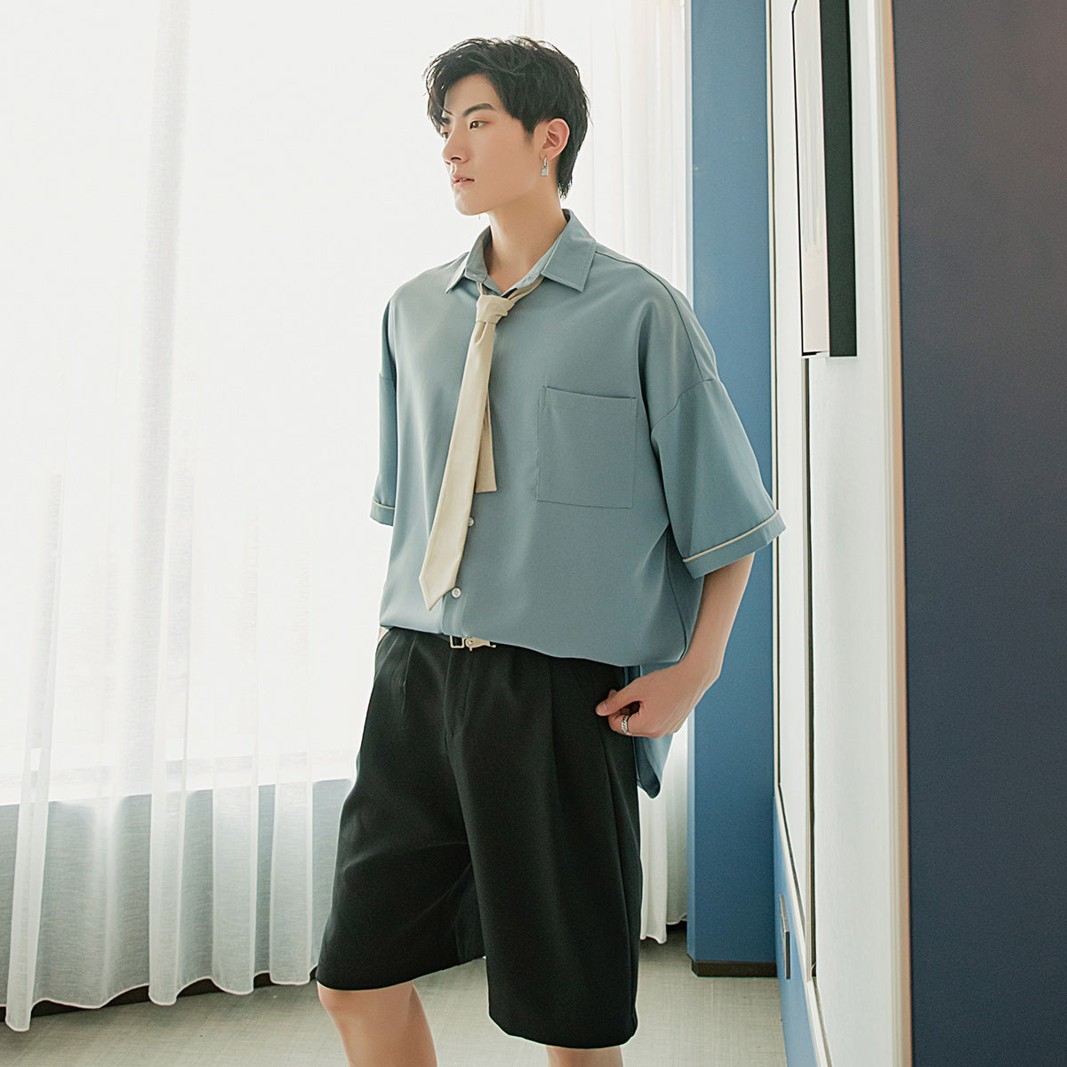 CHIC ERRO Chic Erro summer college style tie shirt male Korean style trend five-point sleeve loose men's short-sleeved shirt
