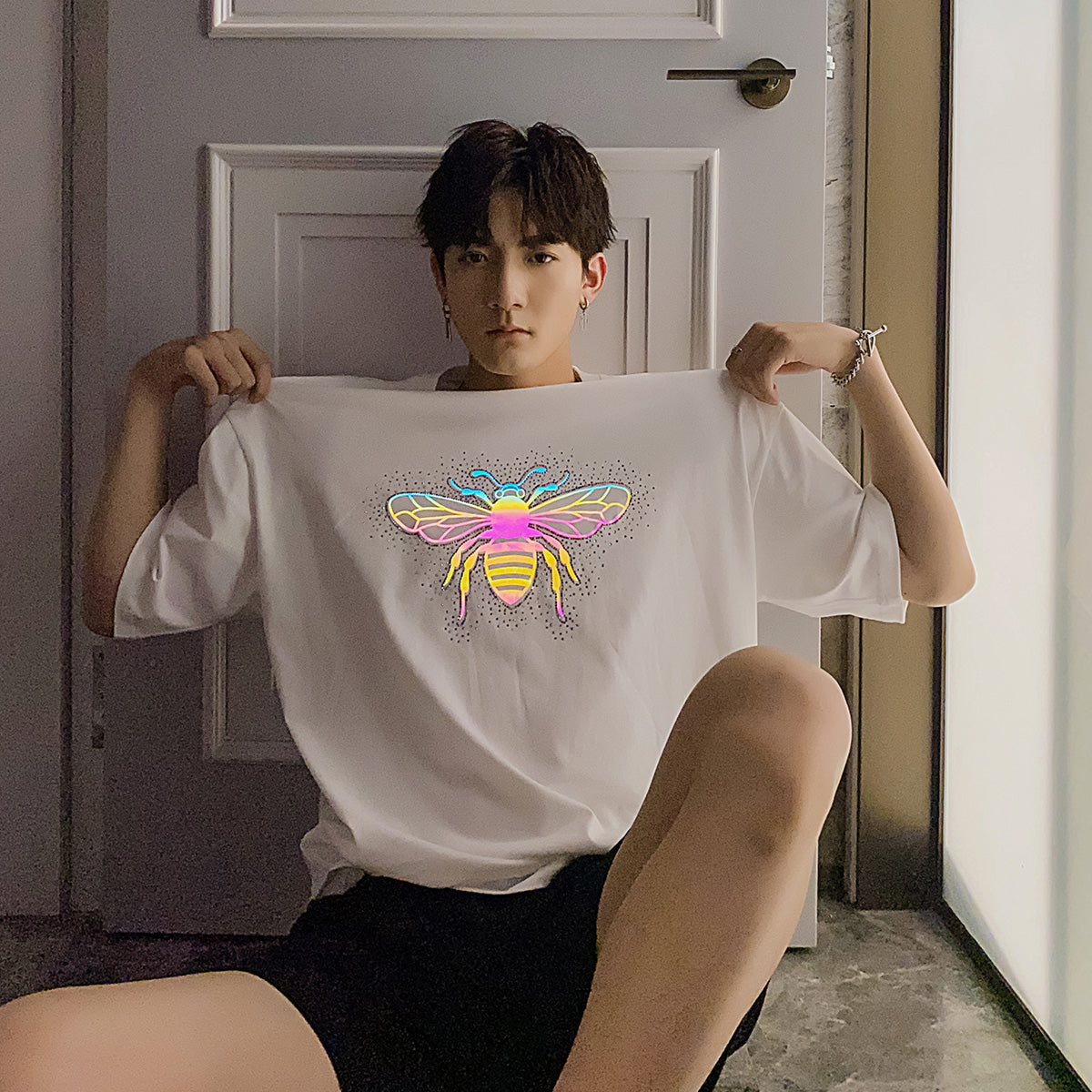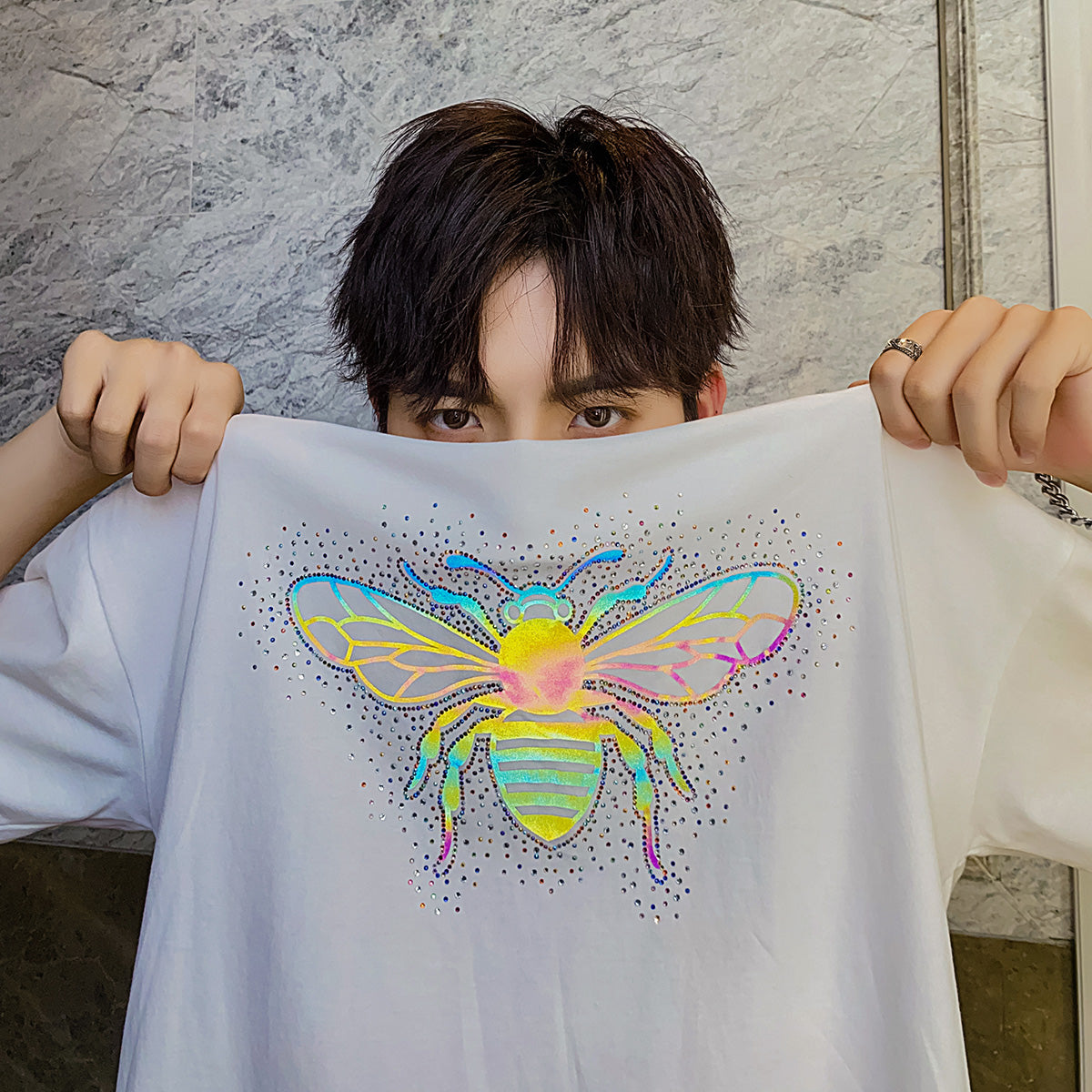 CHIC ERRO Chic Erro summer half-sleeved men's tide brand trend loose boys hot diamond reflective printing white short-sleeved t-shirt