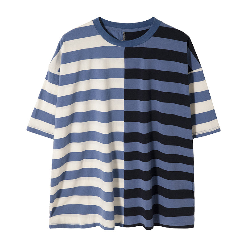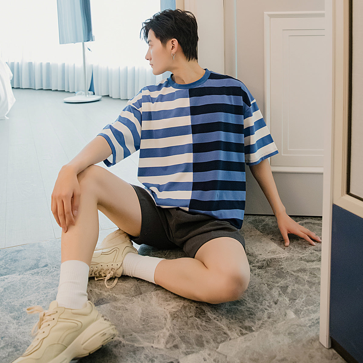 CHIC ERRO Chic Erro summer style short-sleeved men's tide brand trend loose five-point sleeve men's stitching striped t-shirt
