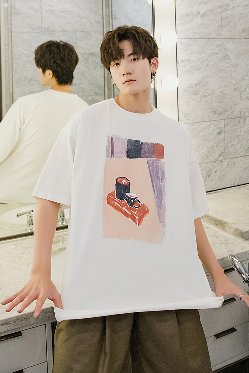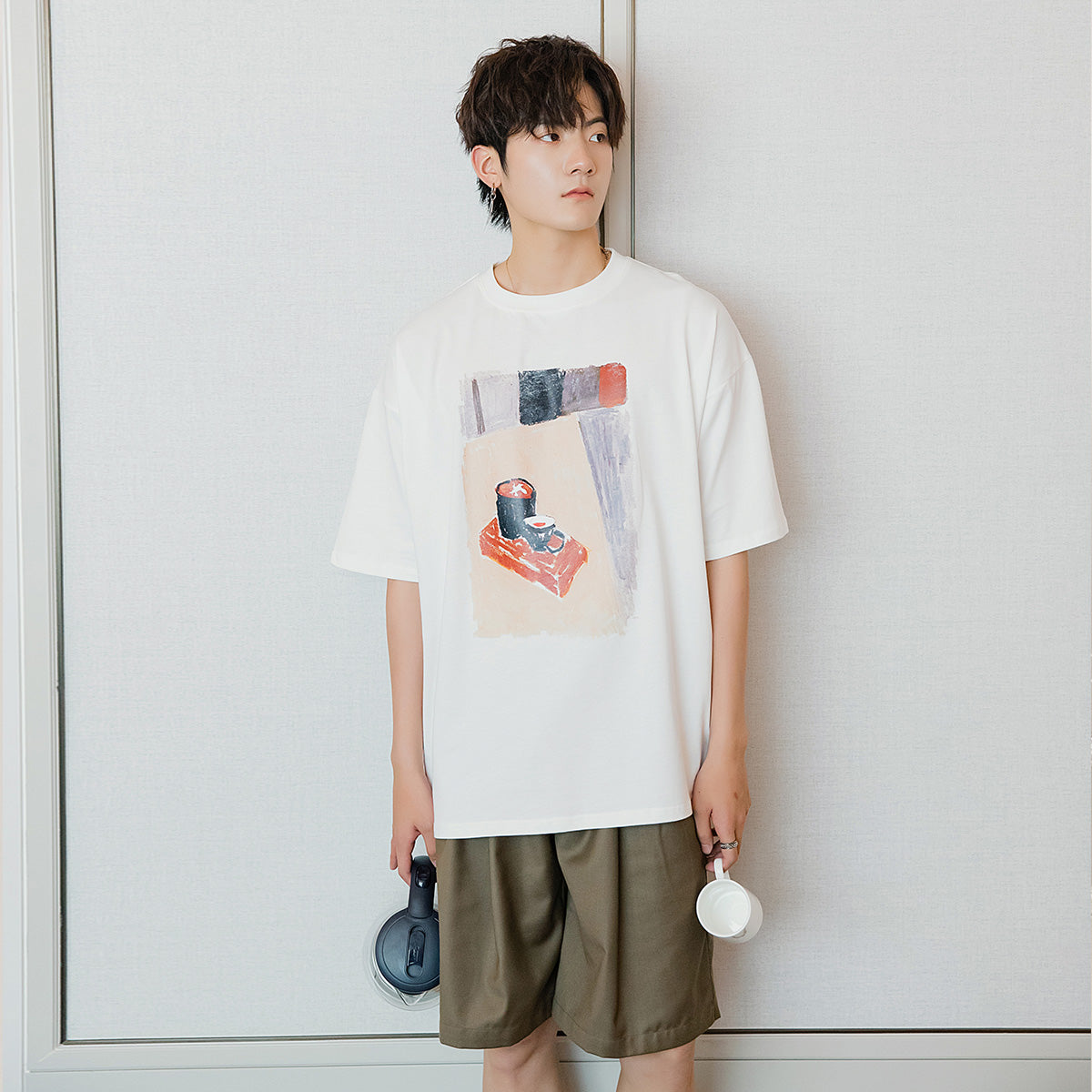 CHIC ERRO Chic Erro summer Korean short-sleeved men's tide brand trend men's loose white five-point sleeve printed t-shirt