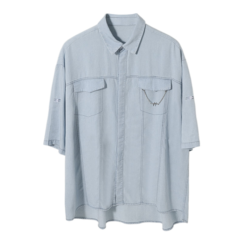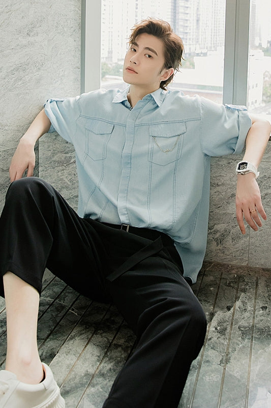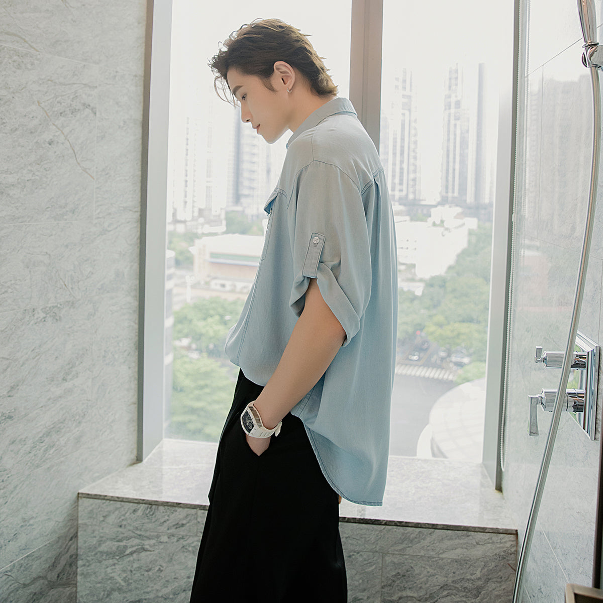 CHIC ERRO Chic Erro summer short-sleeved denim shirt male Korean version of the trend handsome loose men's blue ice silk shirt