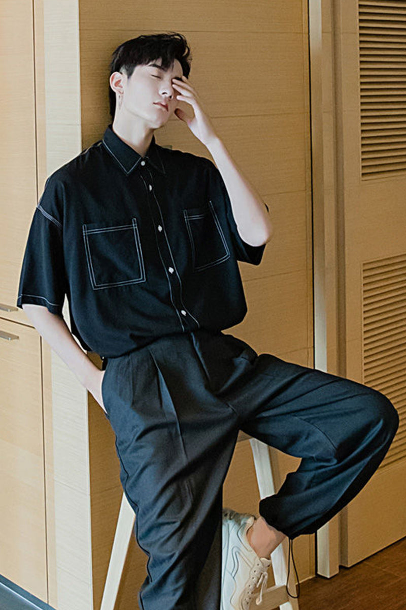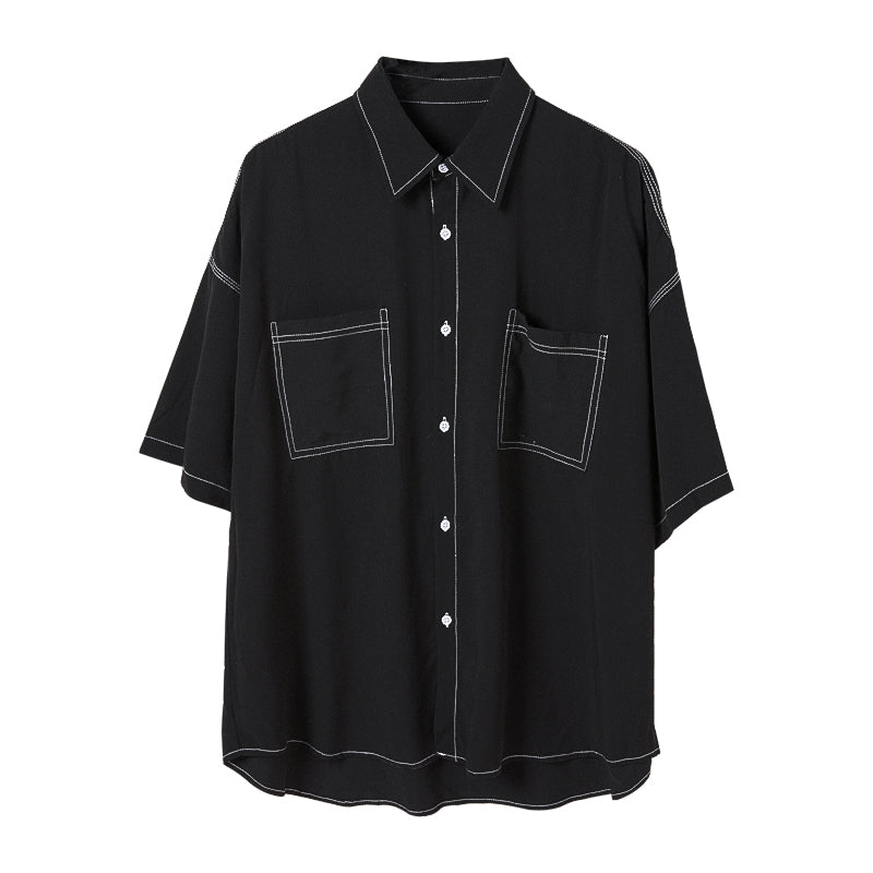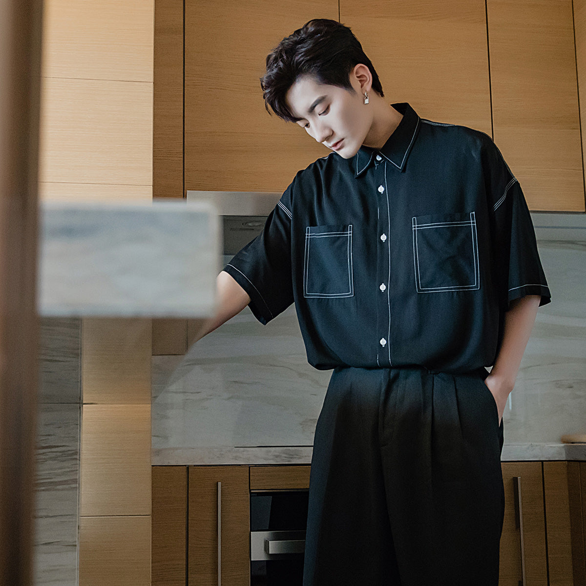 CHIC ERRO Chic Erro summer short-sleeved shirt male Korean version of the trend handsome loose men's trendy black ice silk shirt