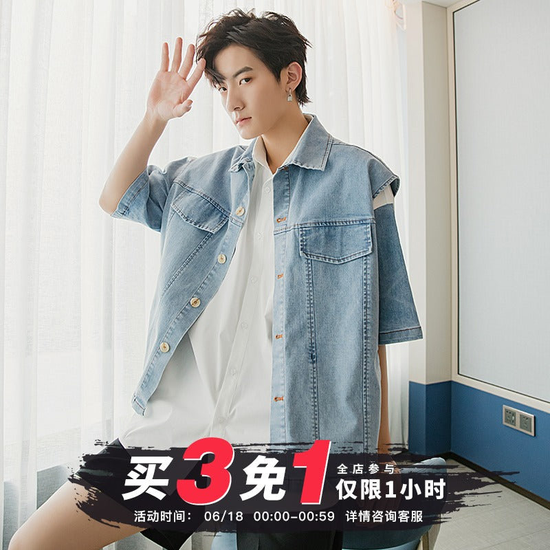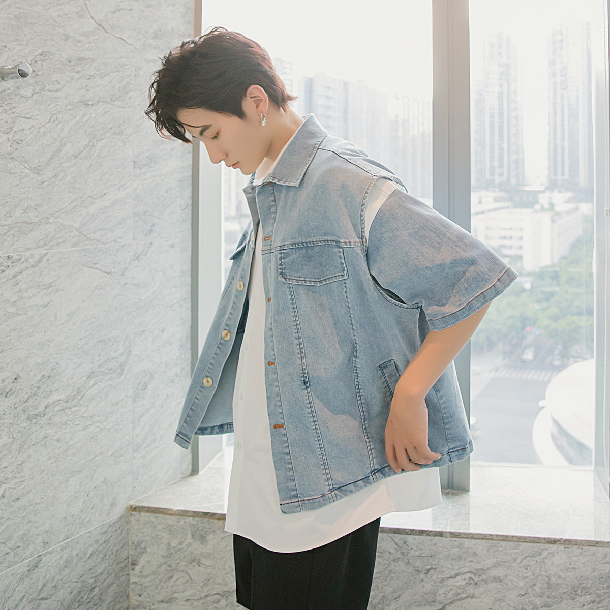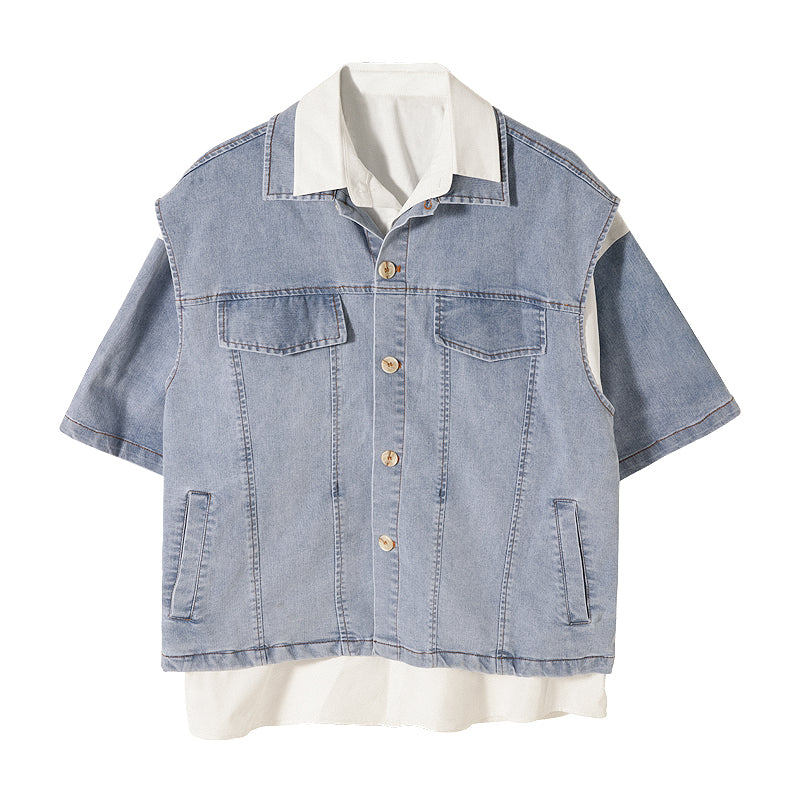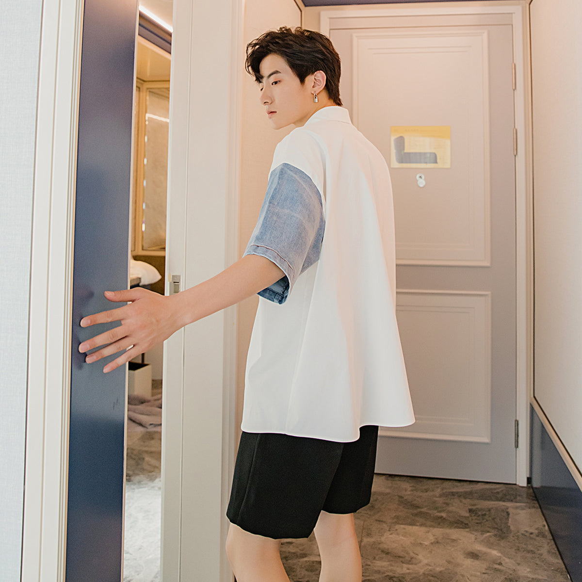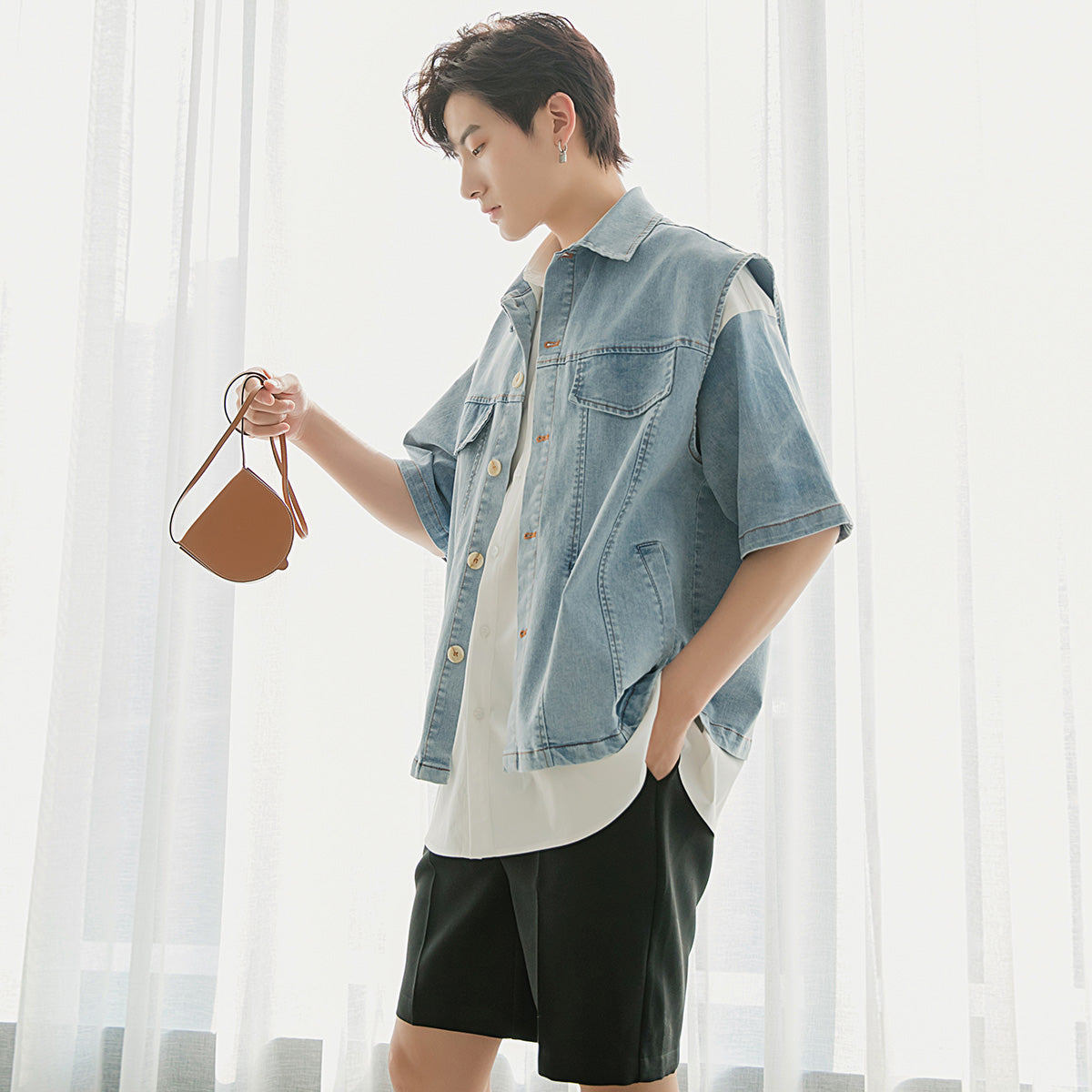 CHIC ERRO Chic Erro summer thin stitching short-sleeved shirt male Korean loose denim vest white shirt suit