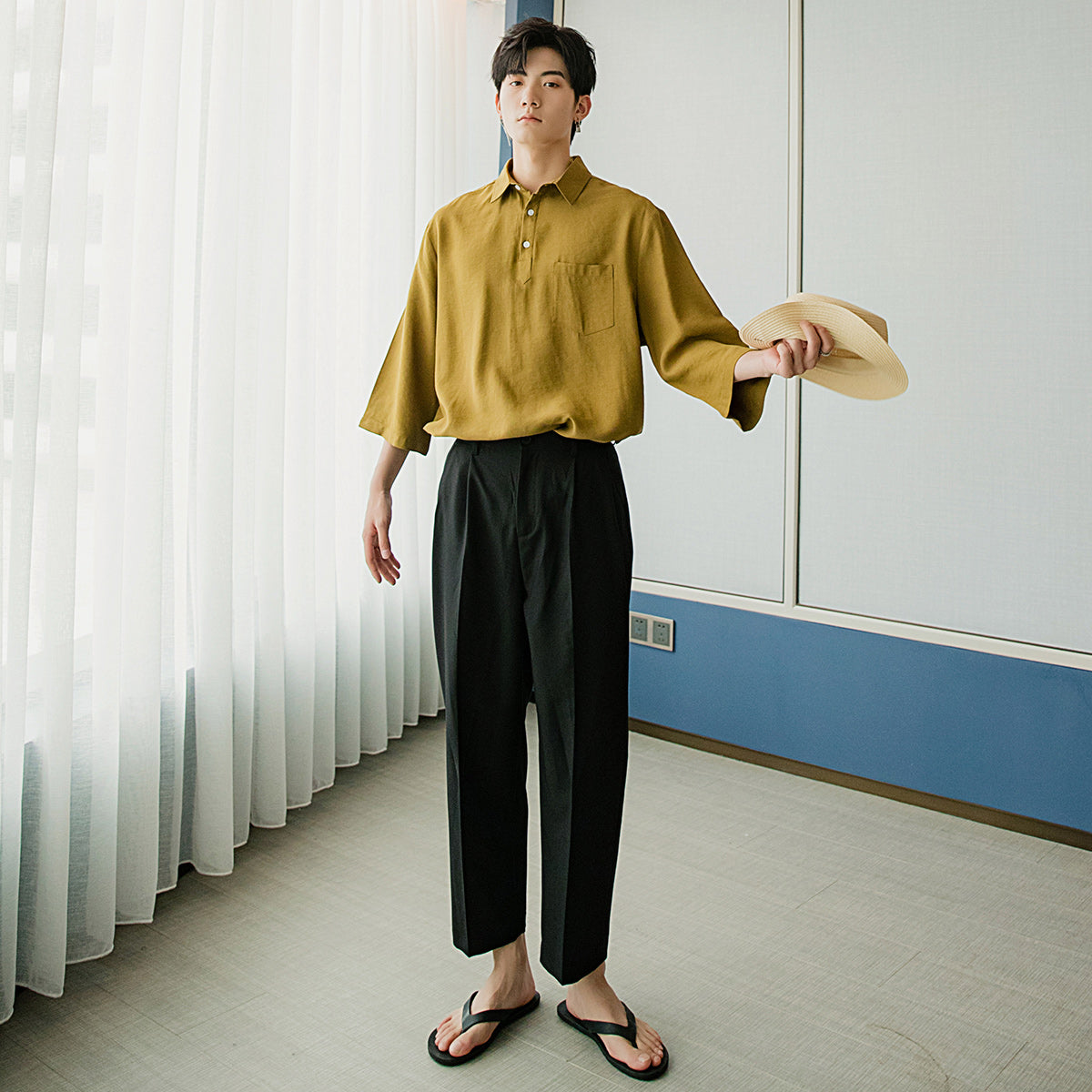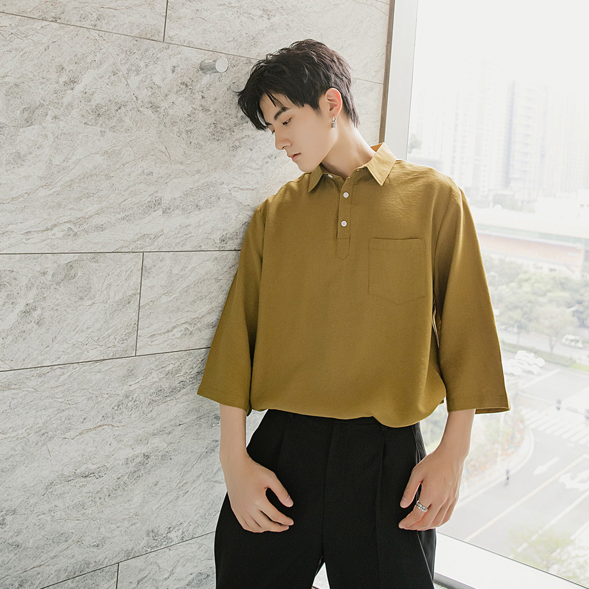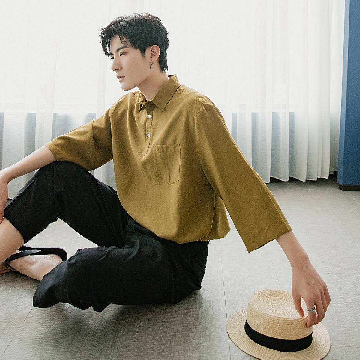 CHIC ERRO Chic Erro summer three-quarter sleeve cotton and linen shirt men's Korean style trendy handsome loose men's short-sleeved shirt