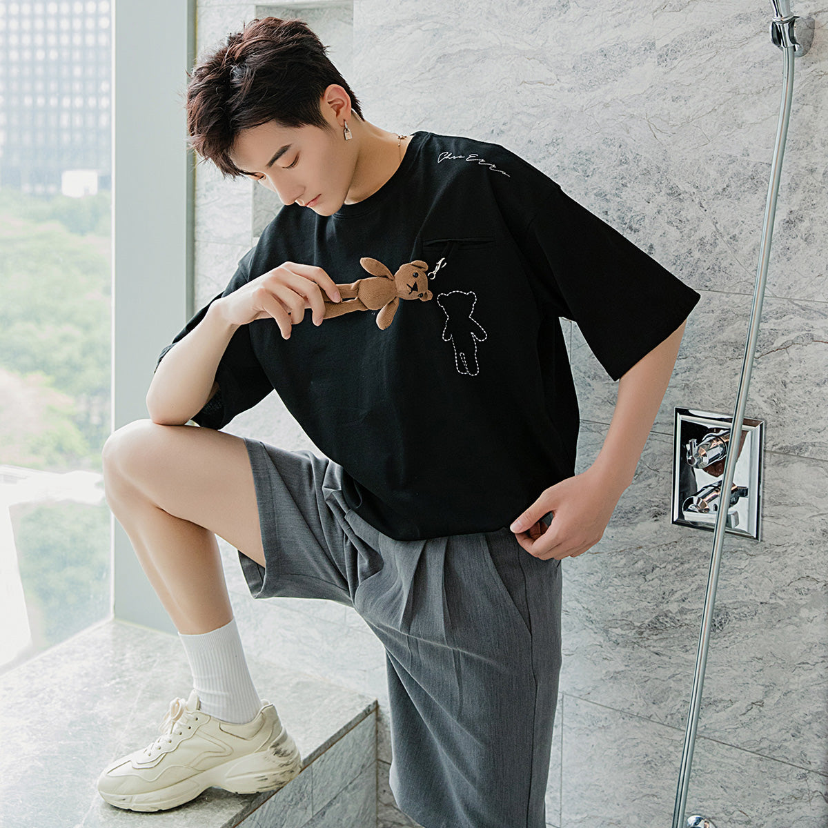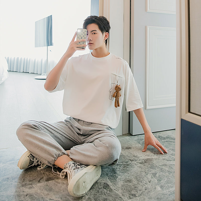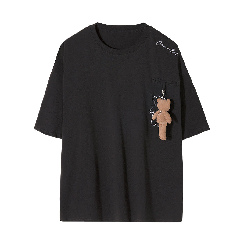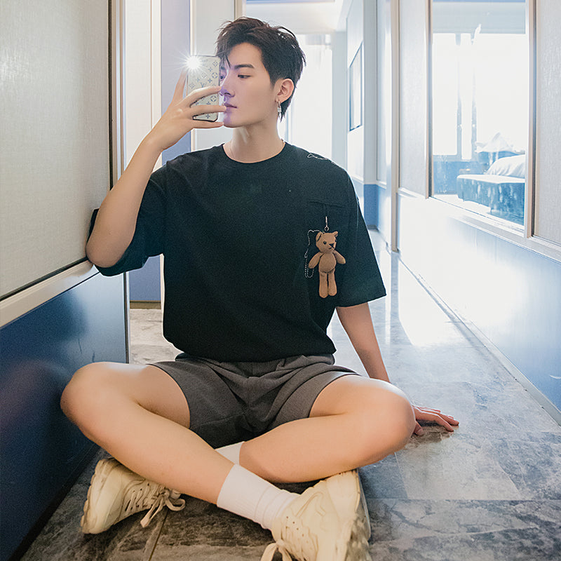 CHIC ERRO Chic Erro summer white short-sleeved men's tide brand trend loose bear ornaments men's five-point sleeve t-shirt