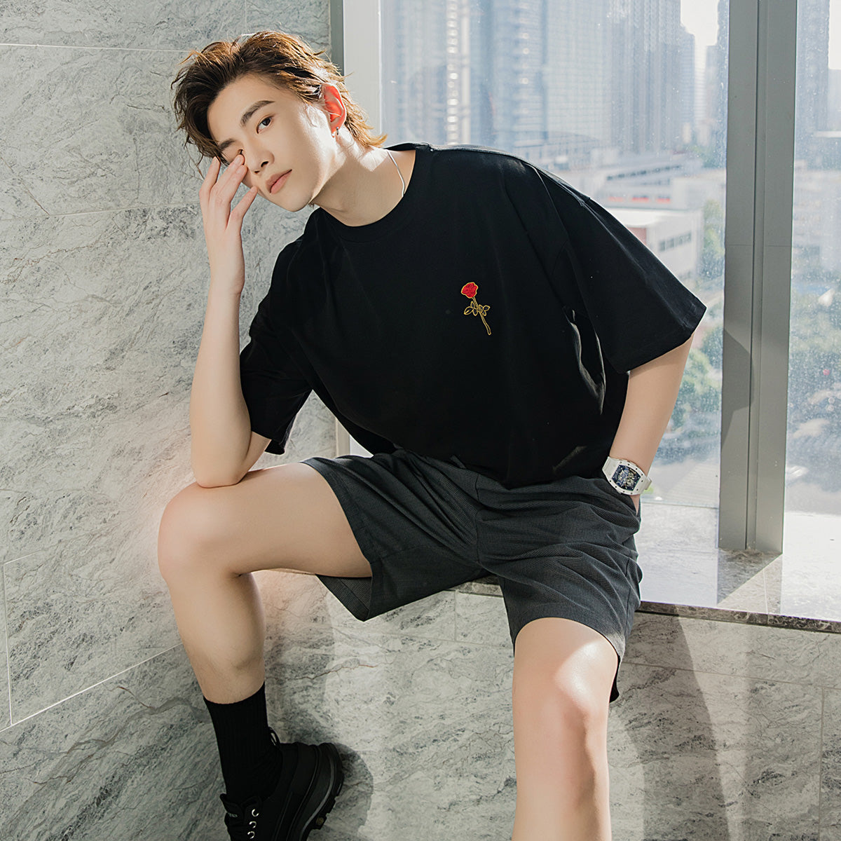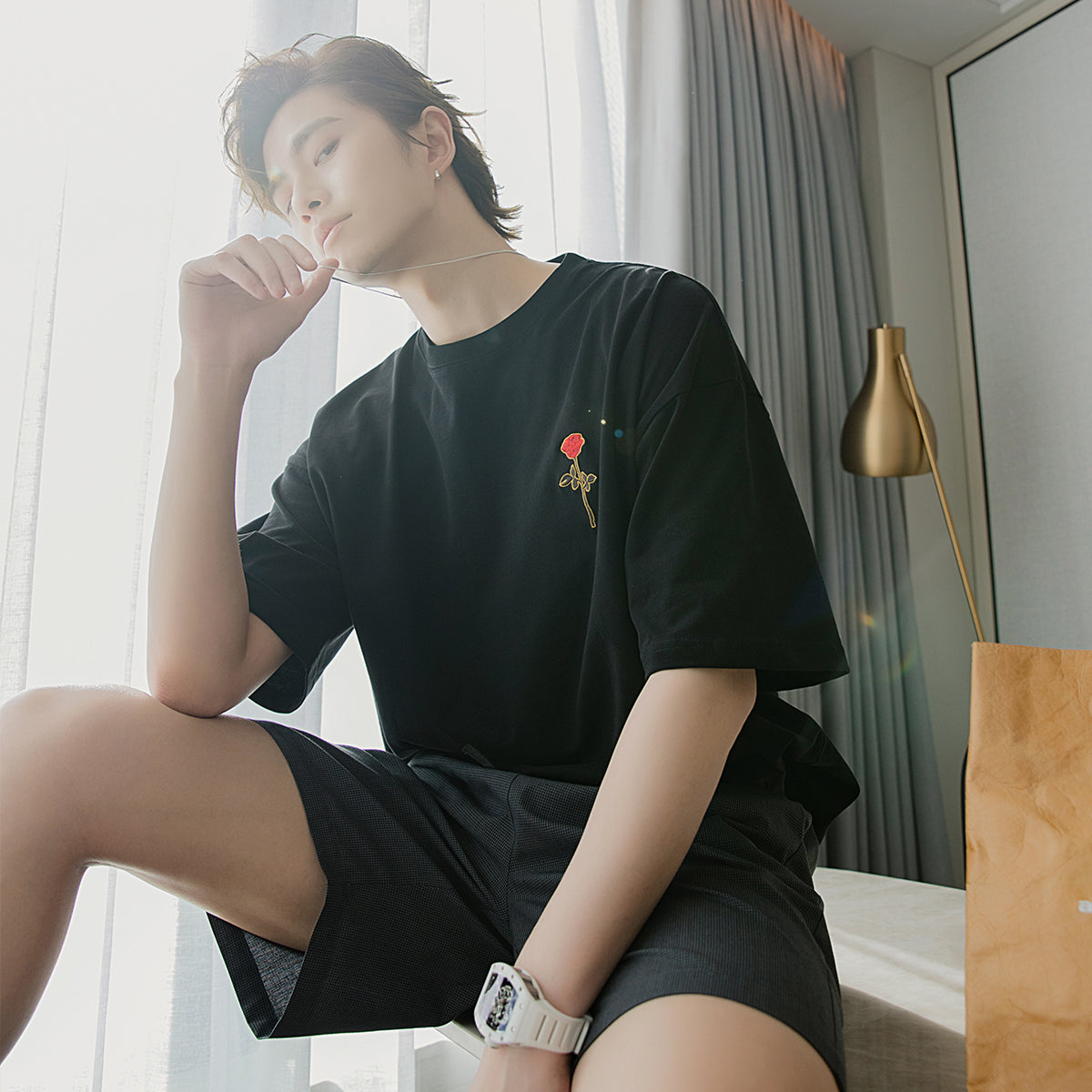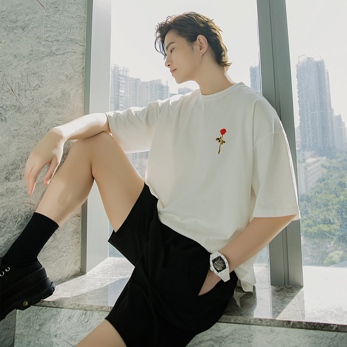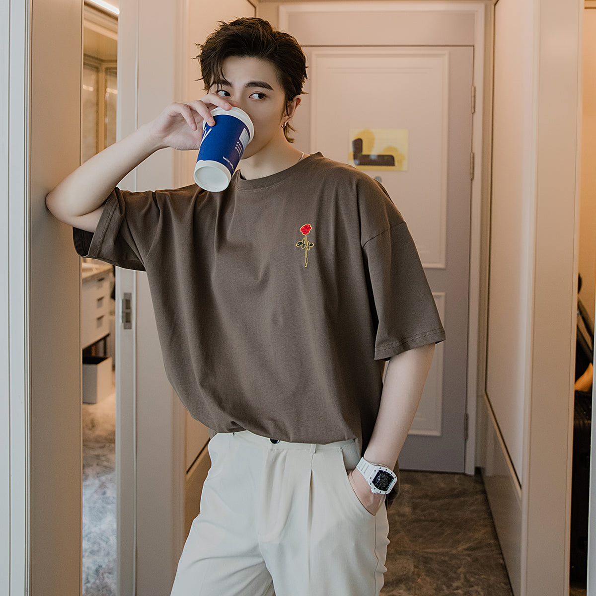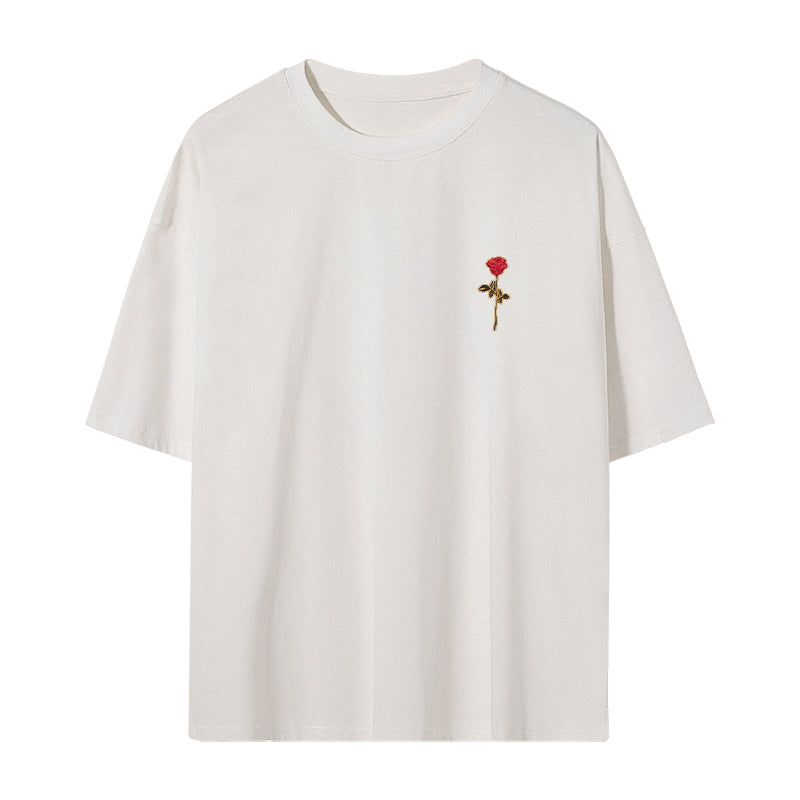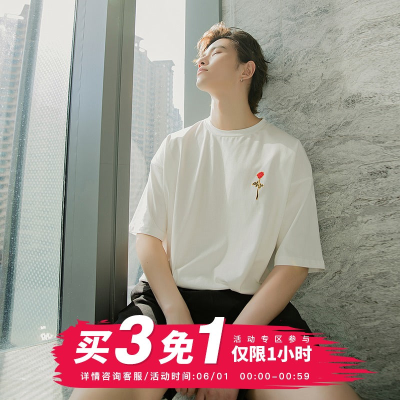 CHIC ERRO Chic Erro white short-sleeved men's tide brand trend loose five-point sleeve men's half-sleeved rose embroidery t-shirt