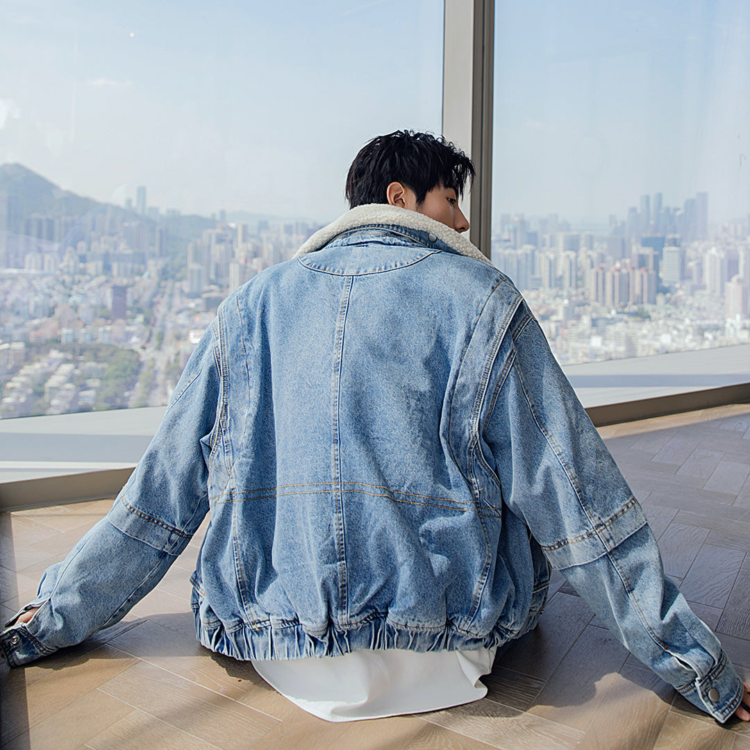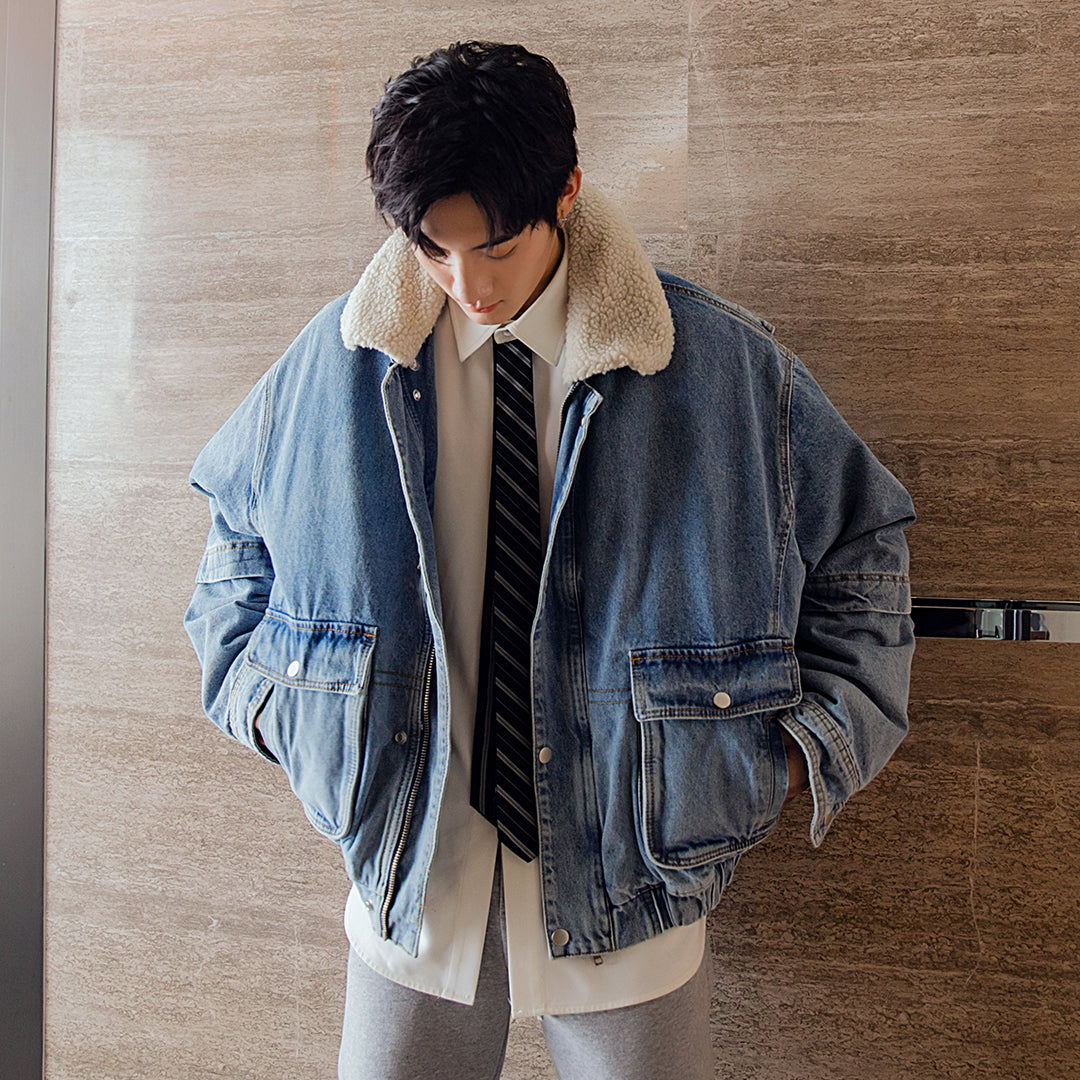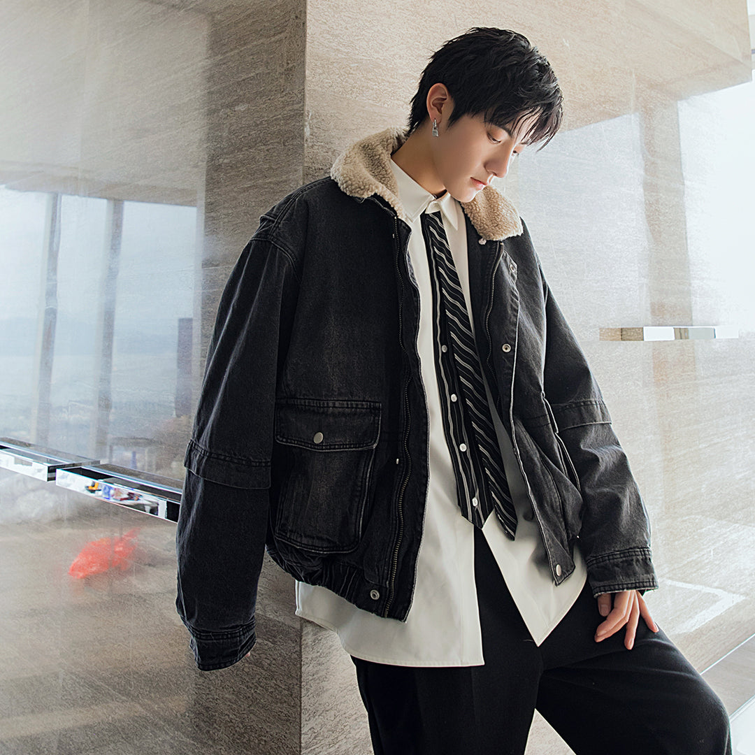 CHIC ERRO Chic Erro winter new denim jacket lamb velvet lapel loose warmth thickened youth jacket male