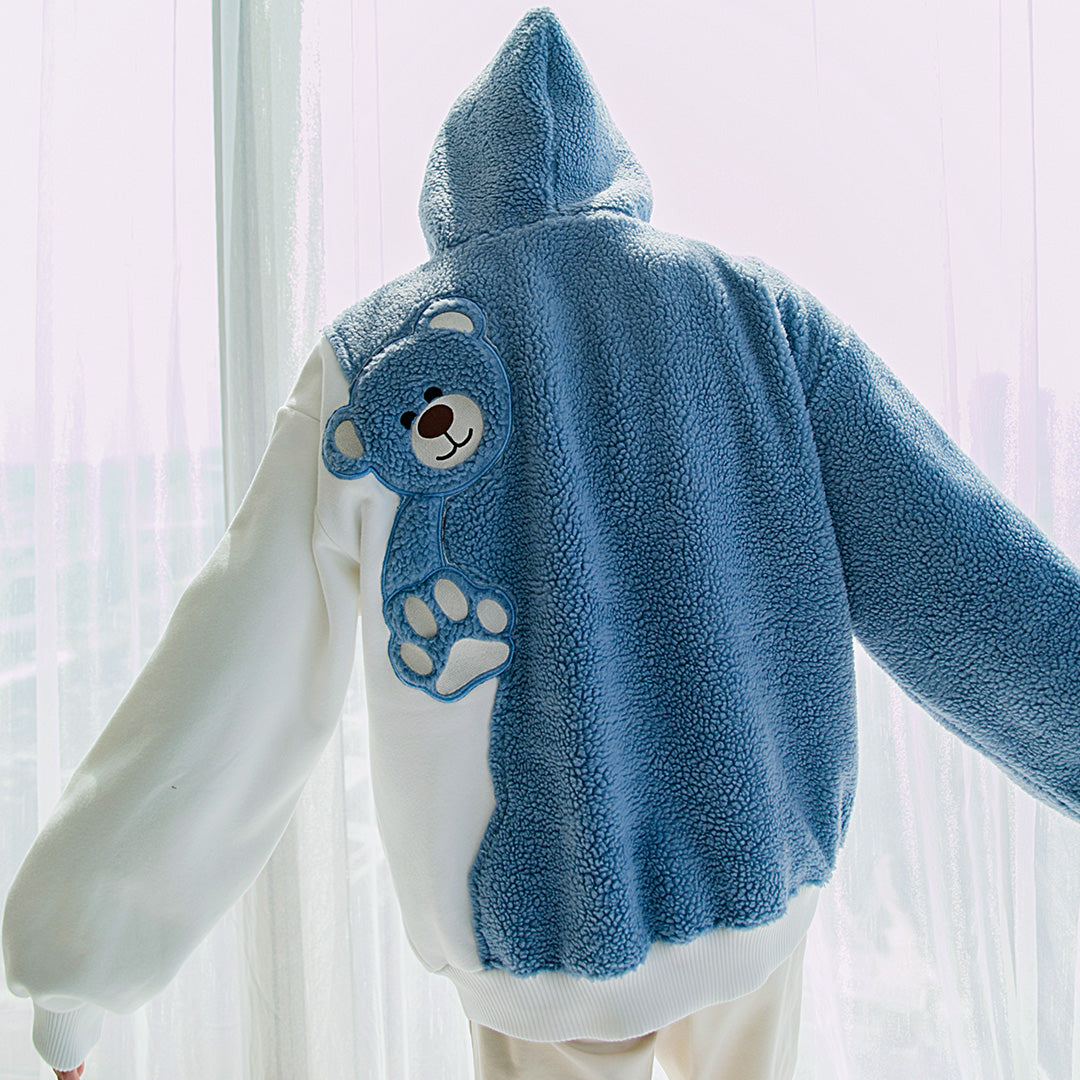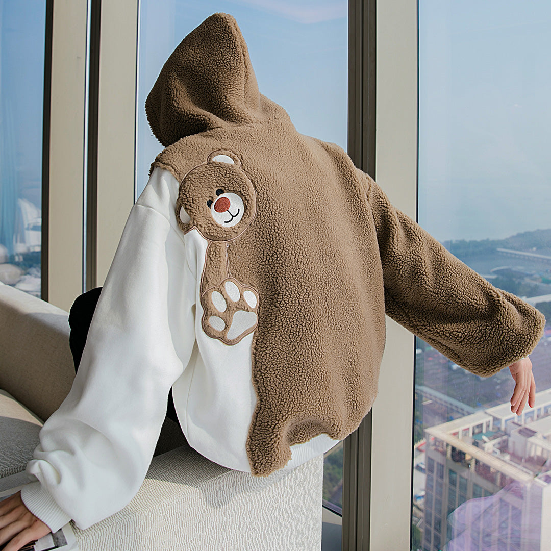 CHIC ERRO Chic Erro winter new lamb velvet hooded sweater design on the back, cute bear hit color shirt for men