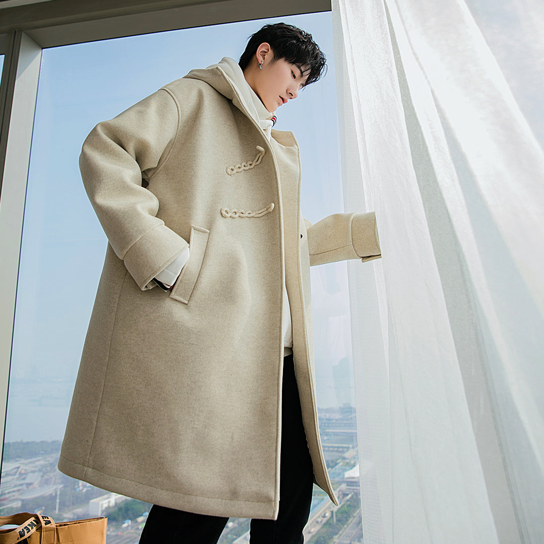 CHIC ERRO Chic Erro winter new mid-length horn buckle woolen coat loose handsome casual hooded jacket men