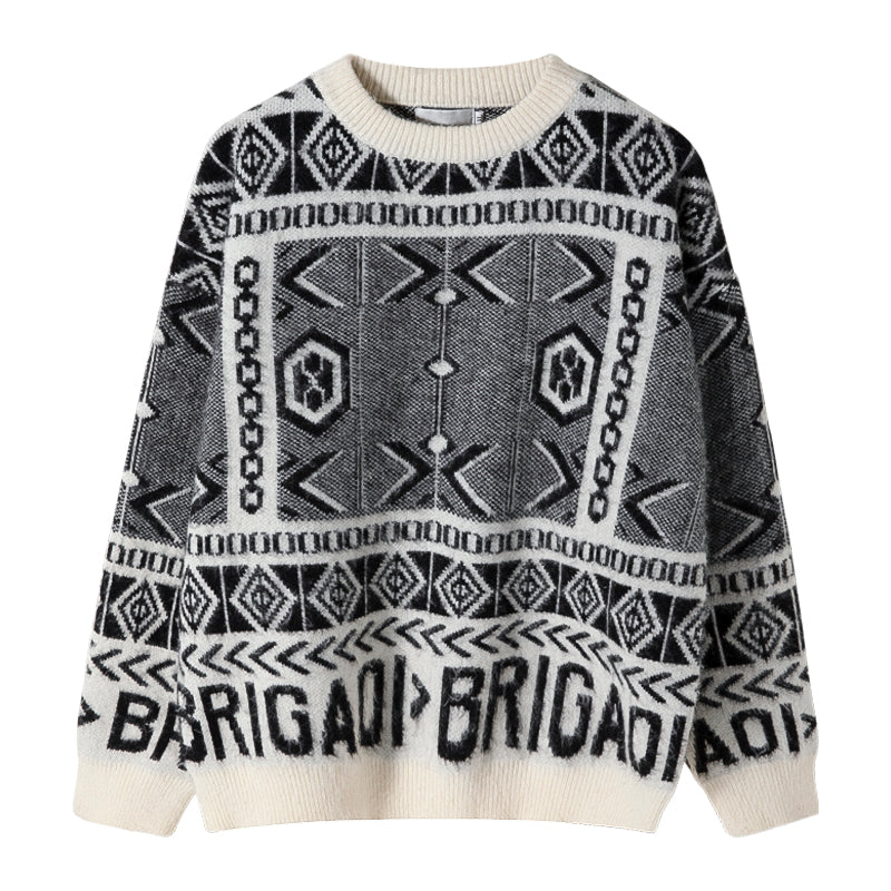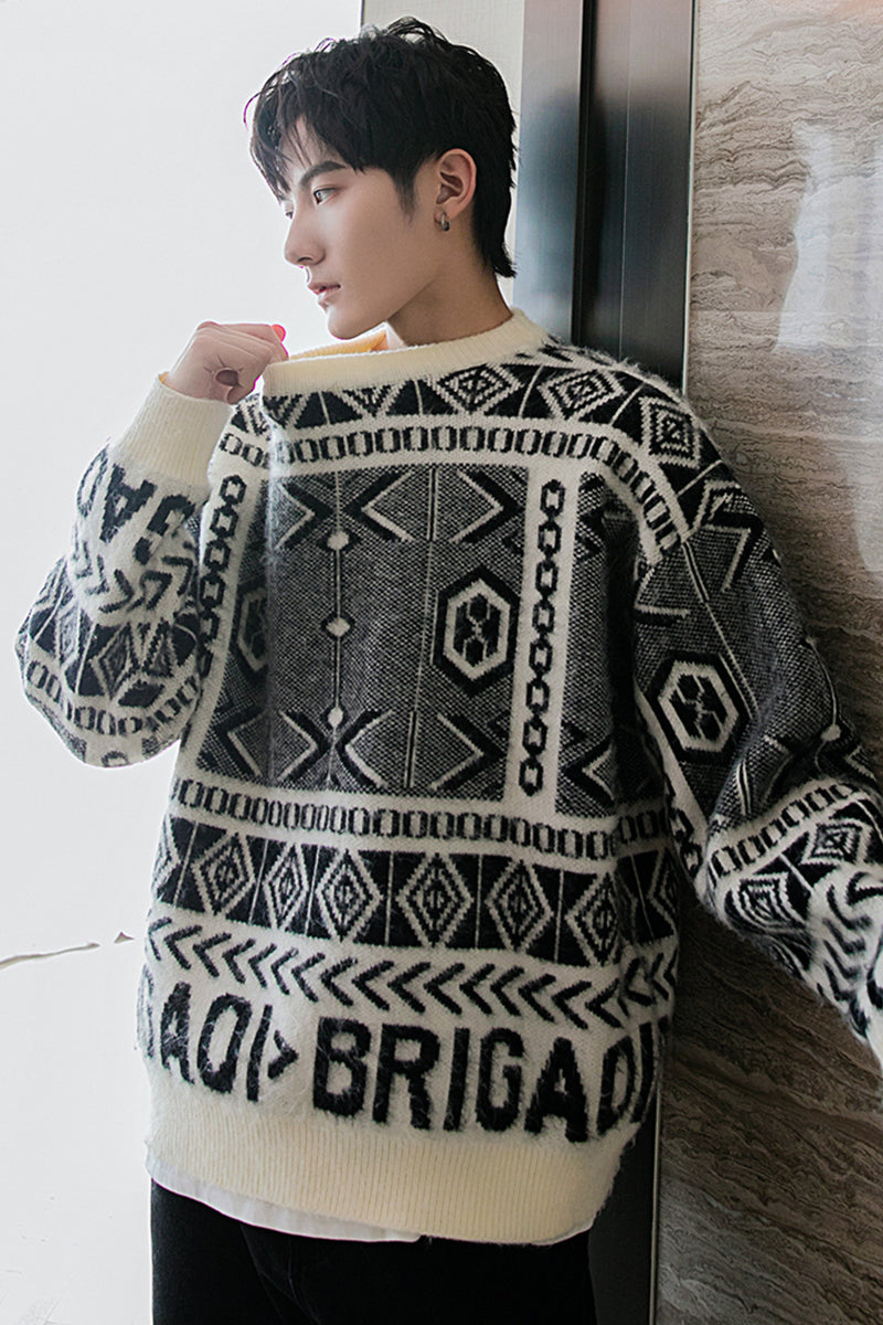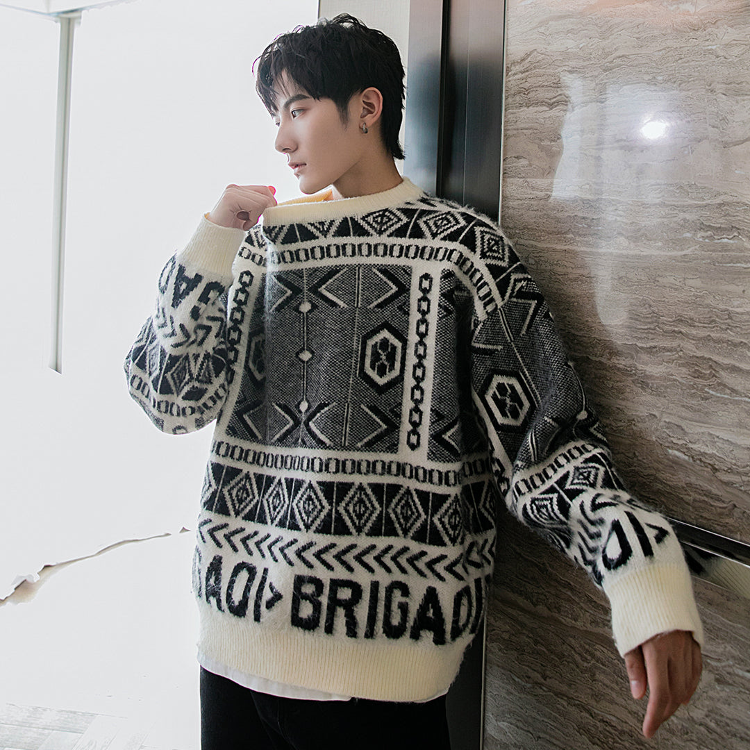 CHIC ERRO Chic Erro winter new round neck sweater contrast jacquard retro style loose trend pullover sweater men