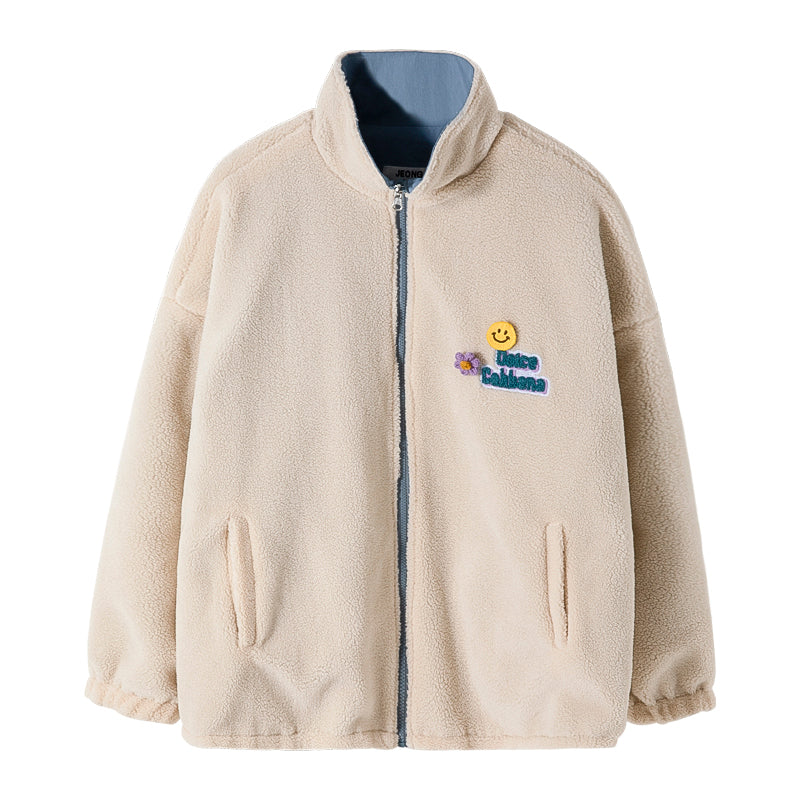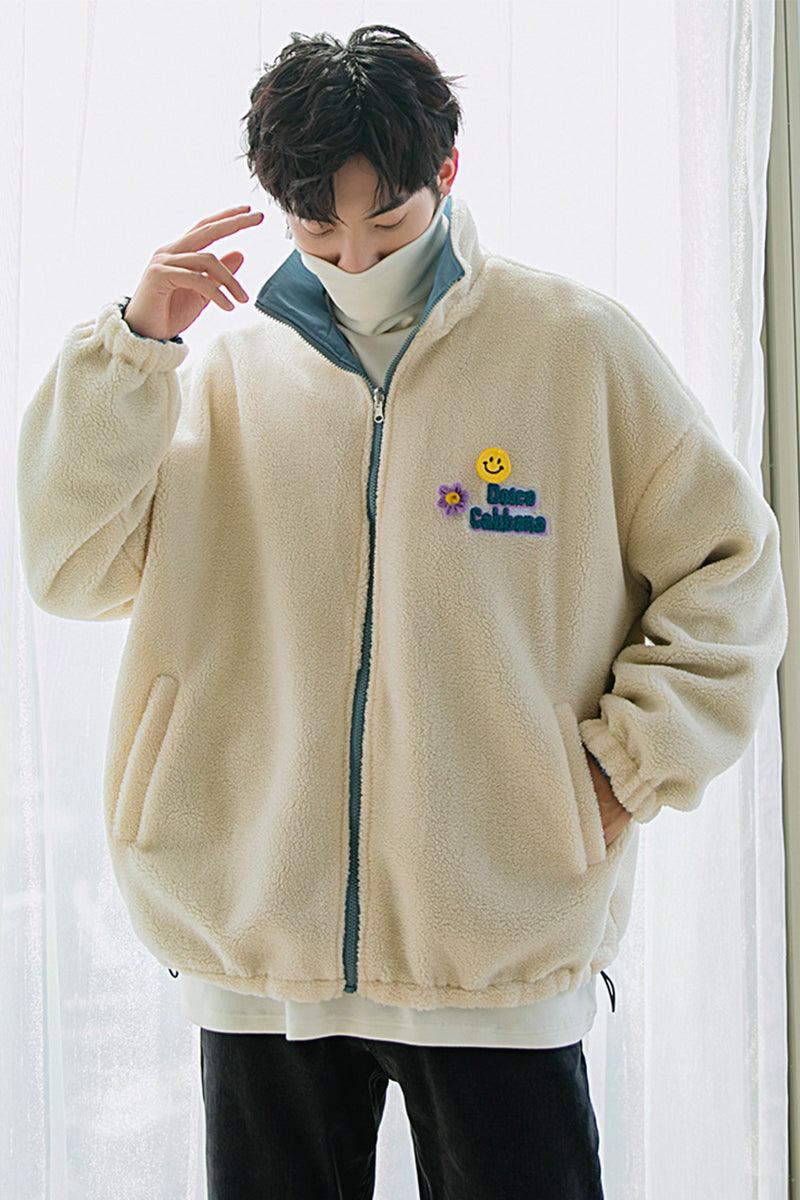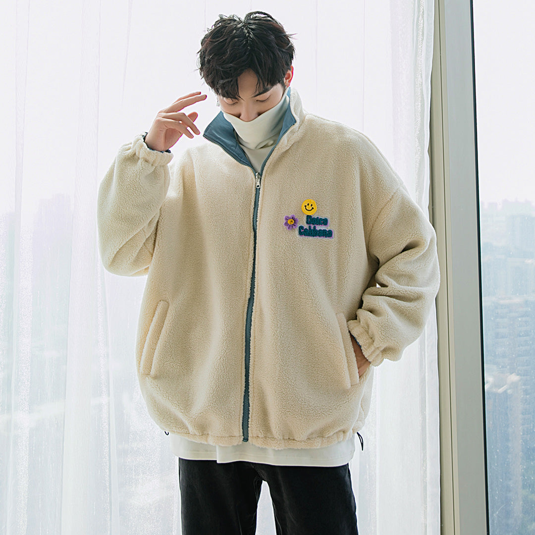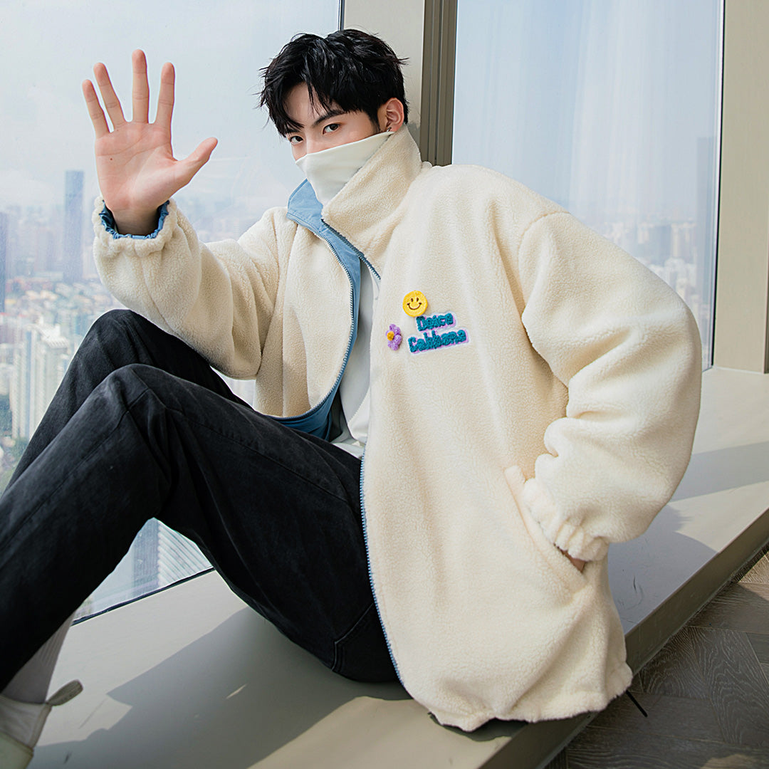 CHIC ERRO Chic Erro winter new style double-sided stand-up collar cotton-padded jacket with embroidery smiling face thickening warm lamb velvet jacket for men