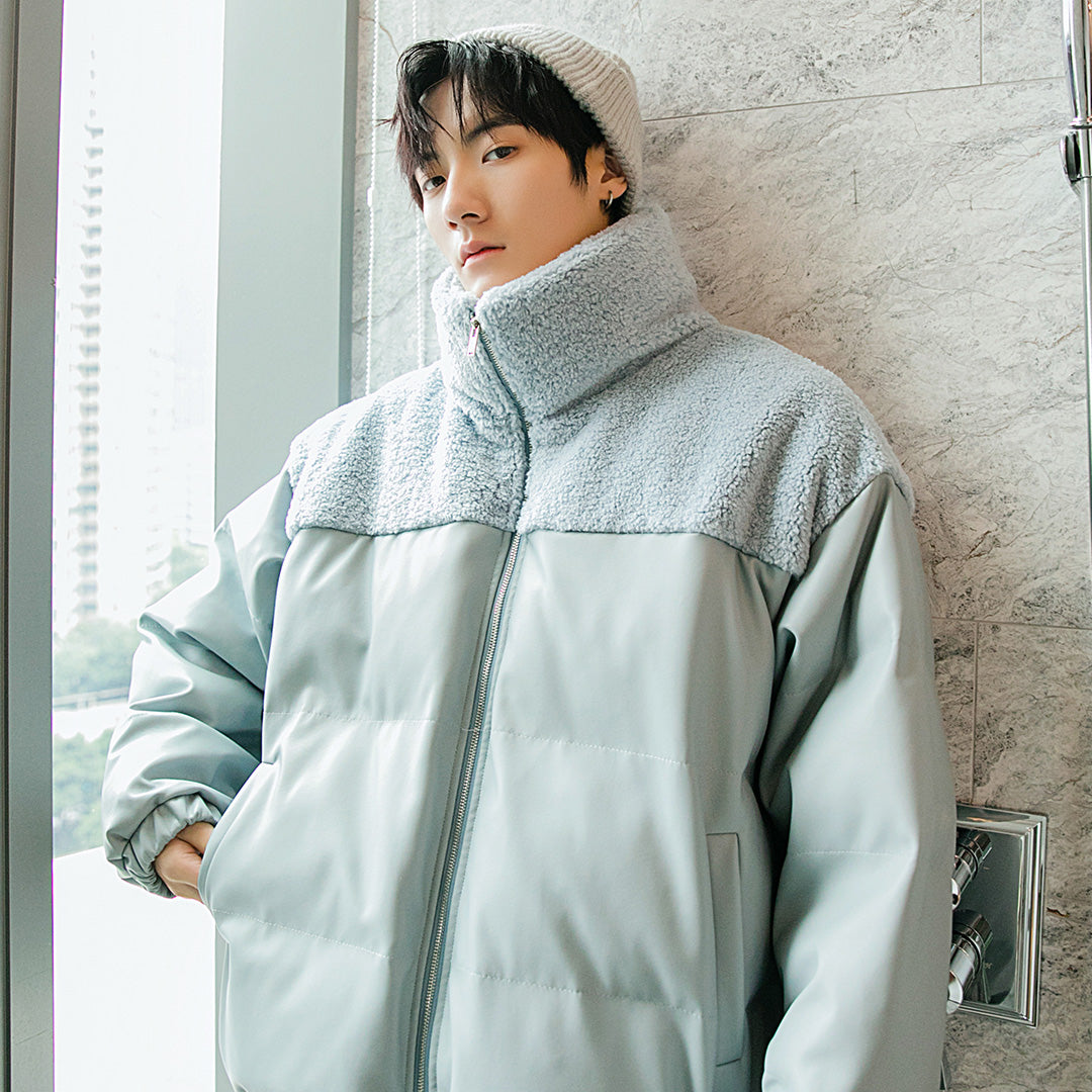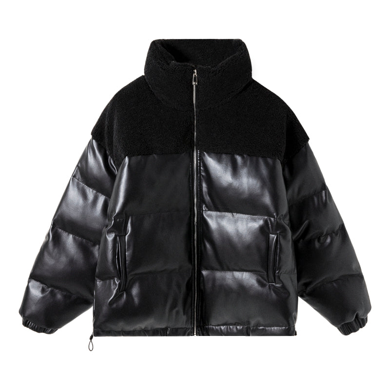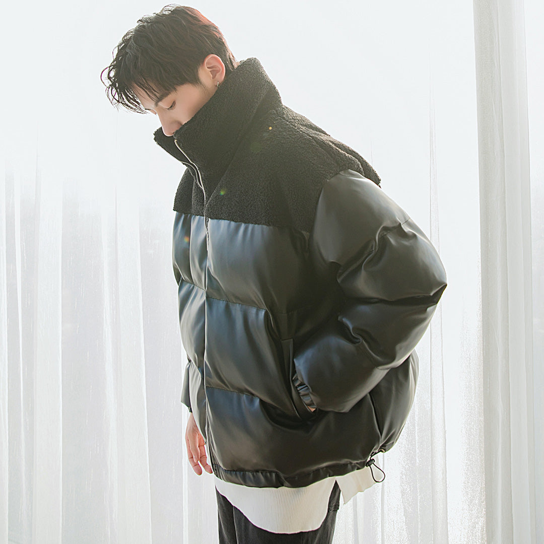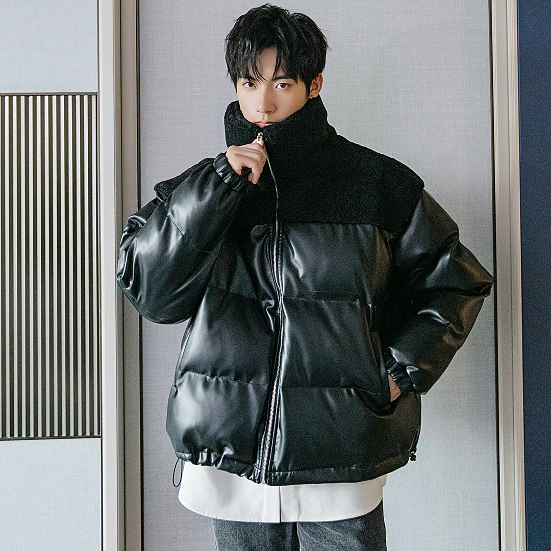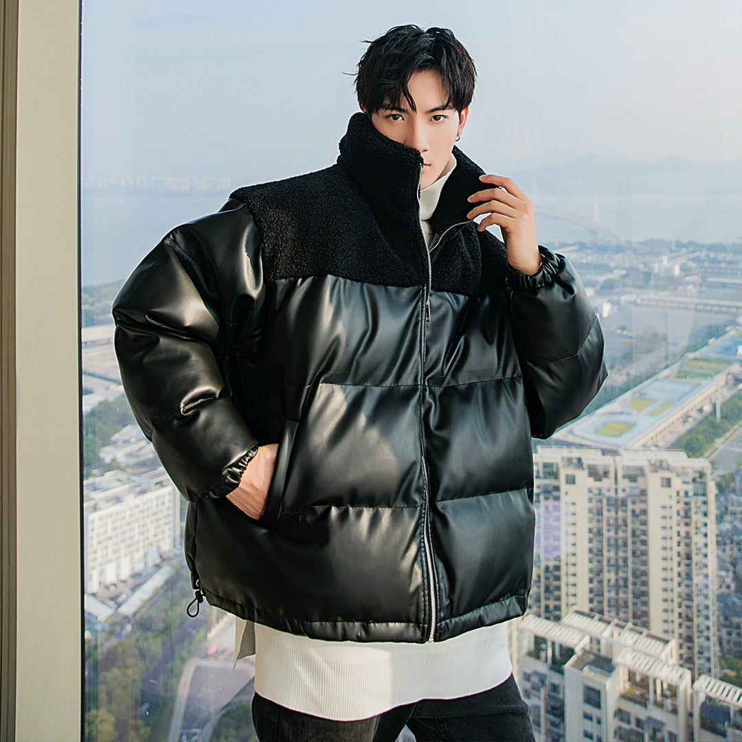 CHIC ERRO Chic Erro winter new thick cotton-padded jacket contrast stitching leather jacket men's loose trend handsome stand-up collar jacket