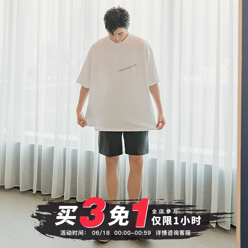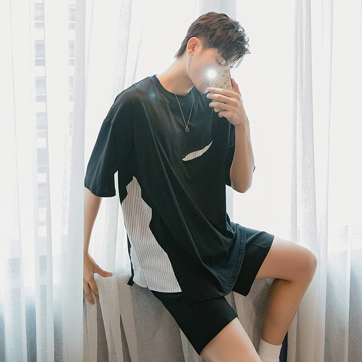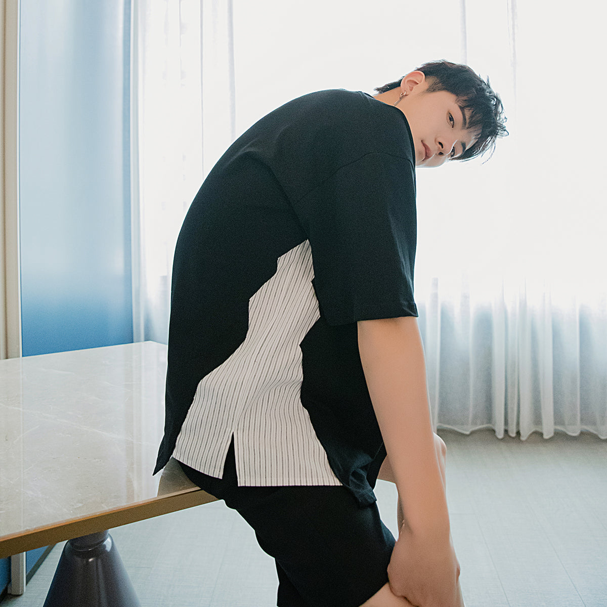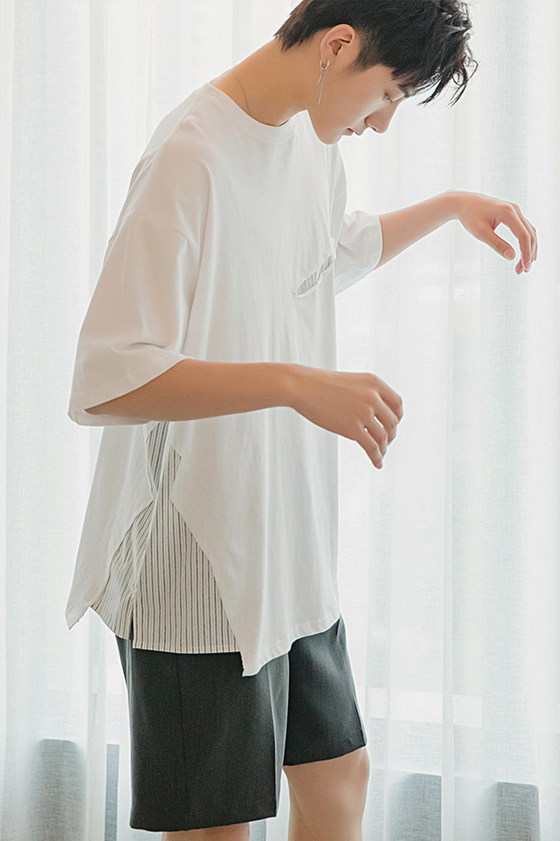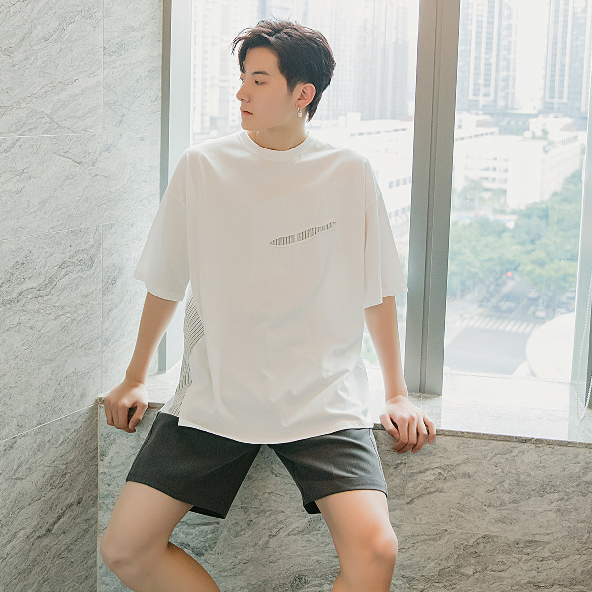 CHIC ERRO Half-sleeved men's trend loose five-point sleeves boys striped stitching holes white short-sleeved t-shirt