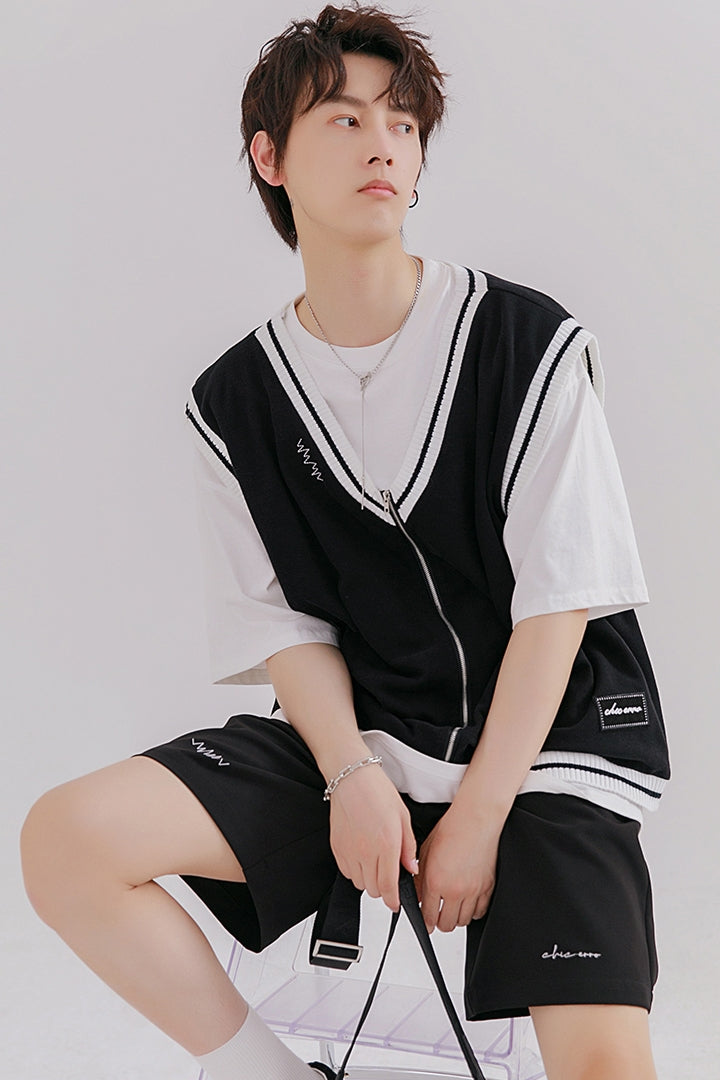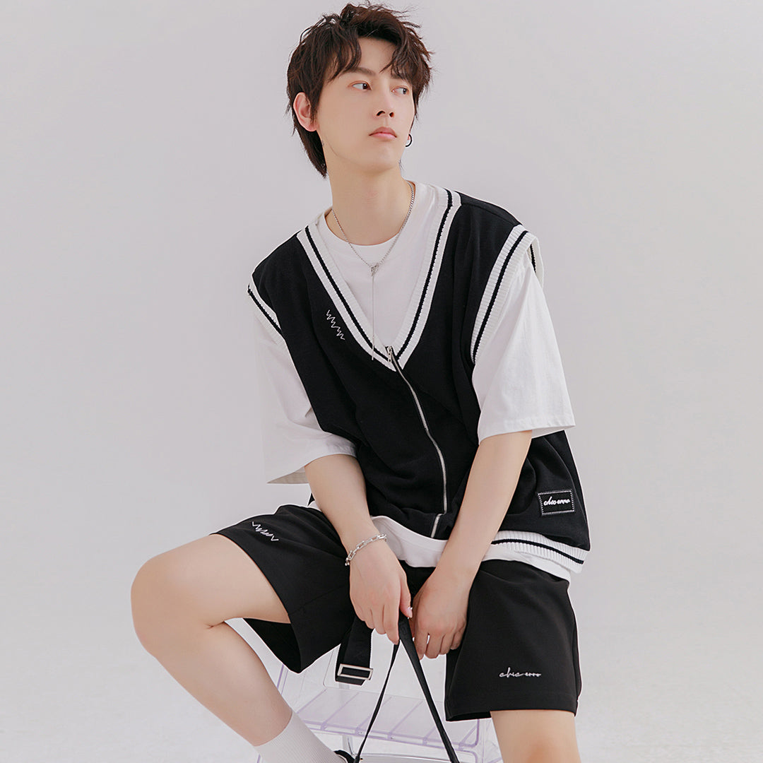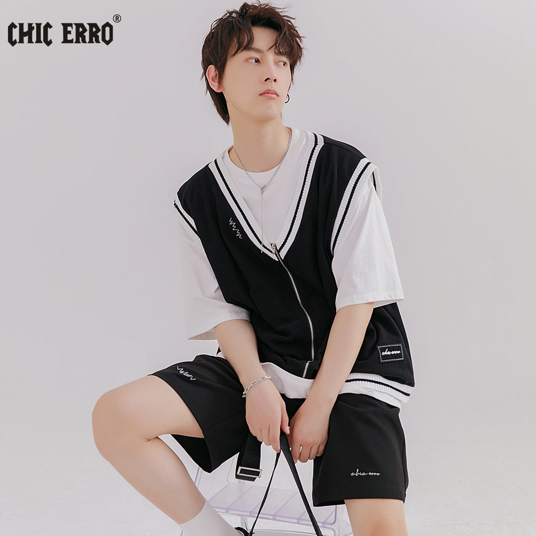 CHIC ERRO CHIC ERRO 2021 New Casual Vest Men's Summer V-neck Contrast Color Sleeveless Loose Thin Knit Cardigan