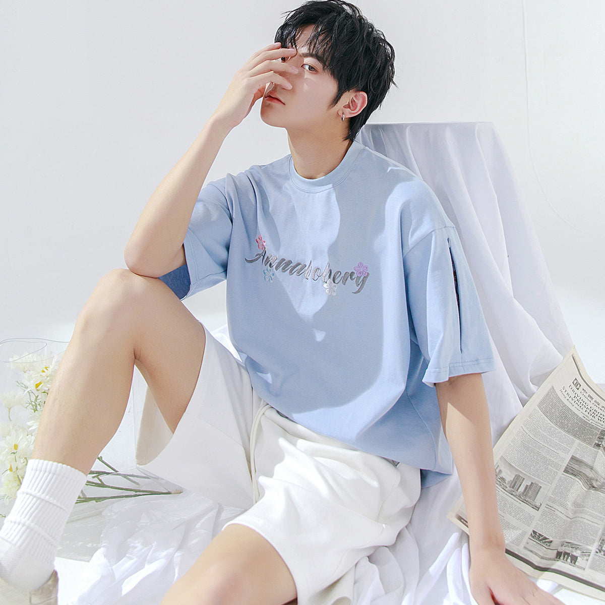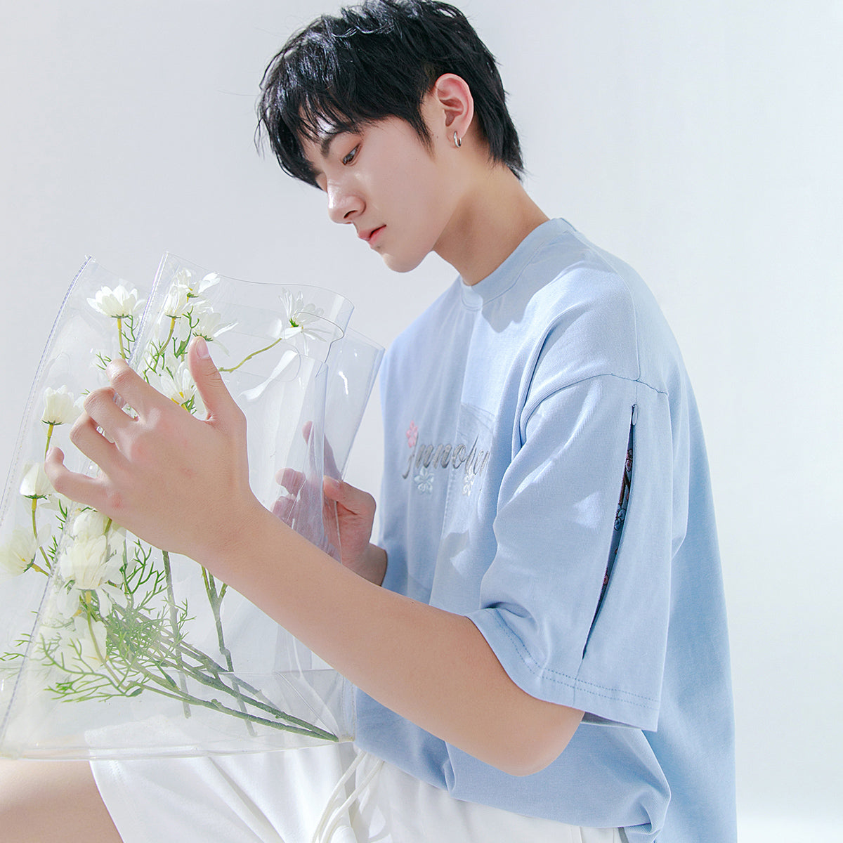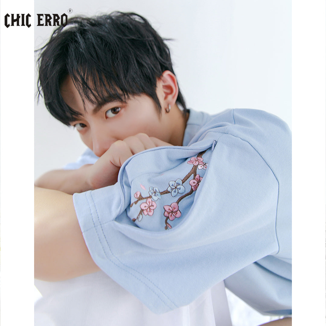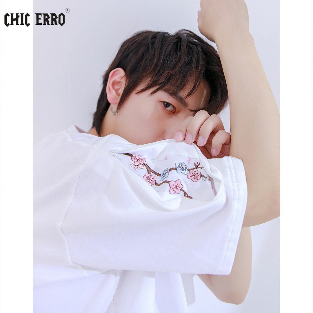 CHIC ERRO CHIC ERRO Slit Flower Embroidered Short Sleeve T-shirt Men's Tide Brand 2021 New Summer Loose Boys T-shirt