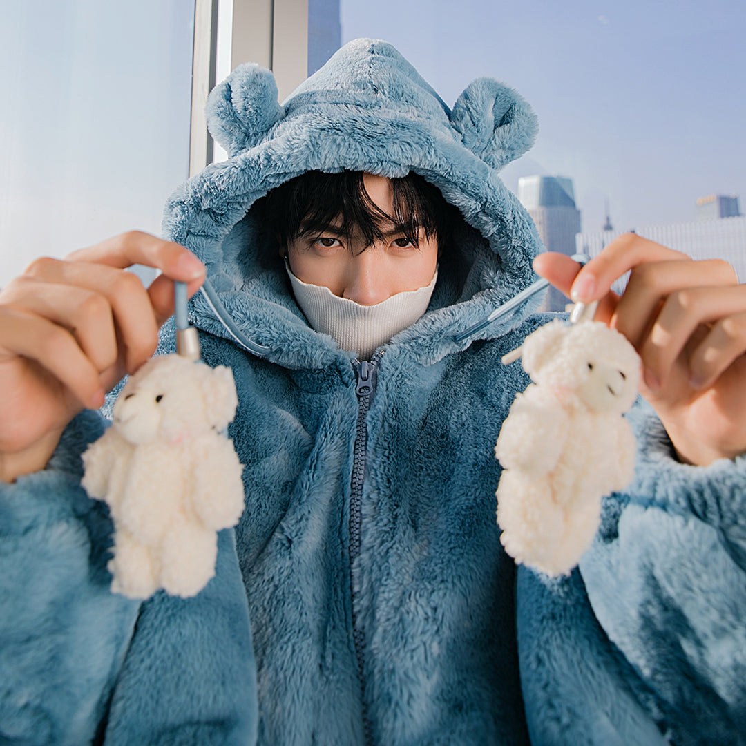 CHIC ERRO CHIC ERRO Winter New Thick Bear Head Hooded Sweater Cute Loose Casual Warm Rabbit Fleece Jacket Men