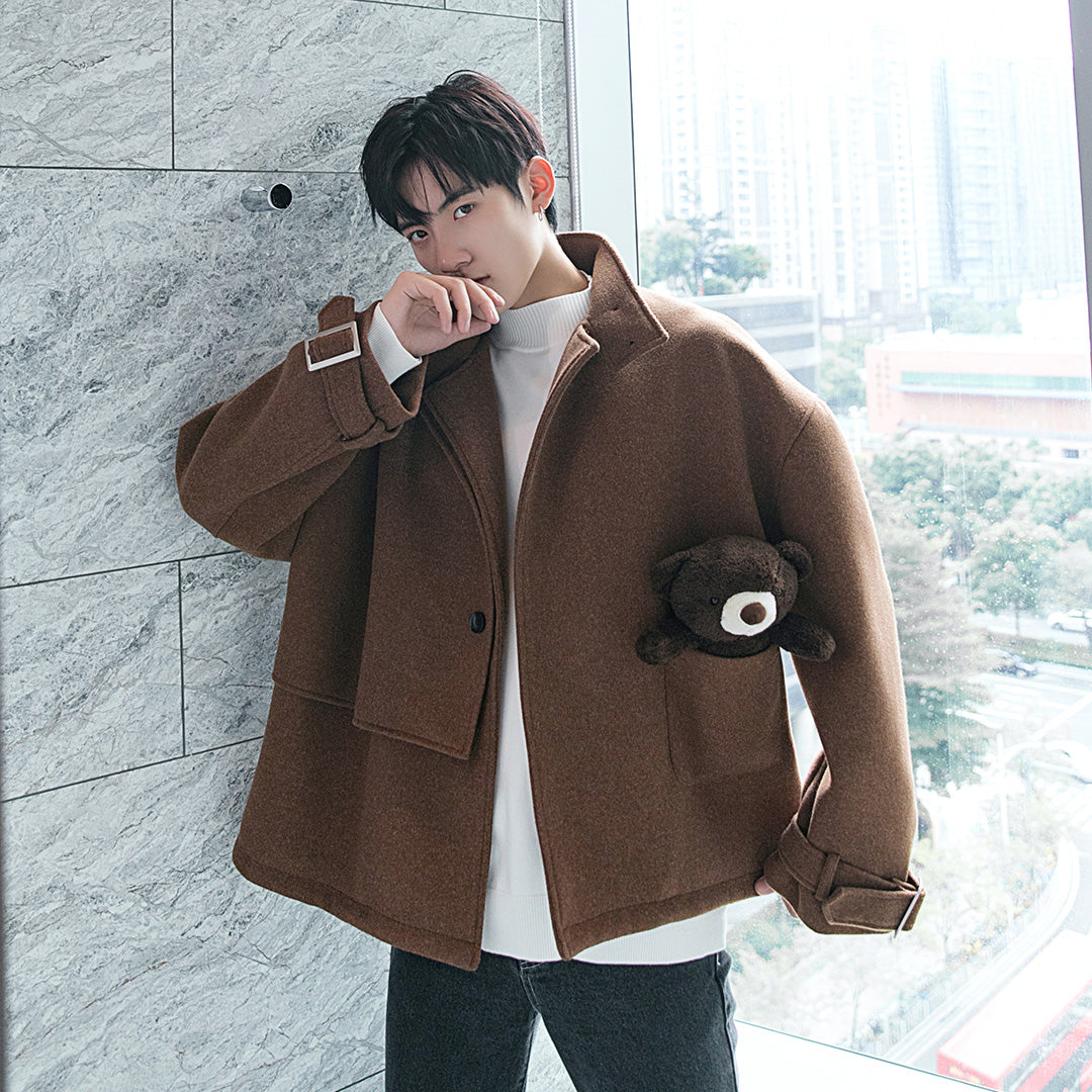 CHIC ERRO CHIC ERRO Youth Pure Color Short Woolen Back Bear Loose Casual Men's Jacket
