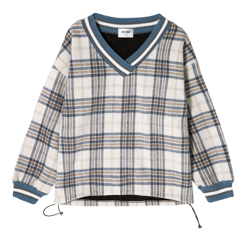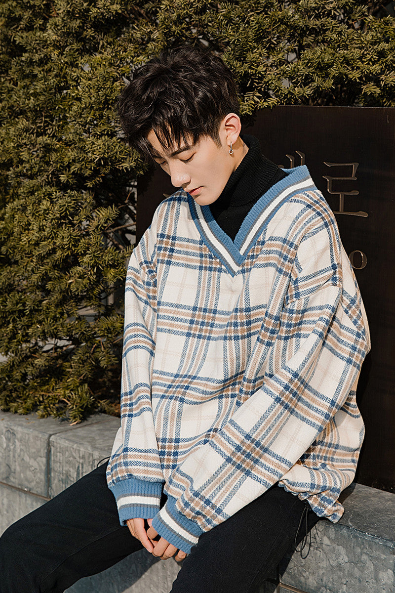 CHIC ERRO Tops Korean style trendy boys loose woolen plaid V-neck sweater men's trend