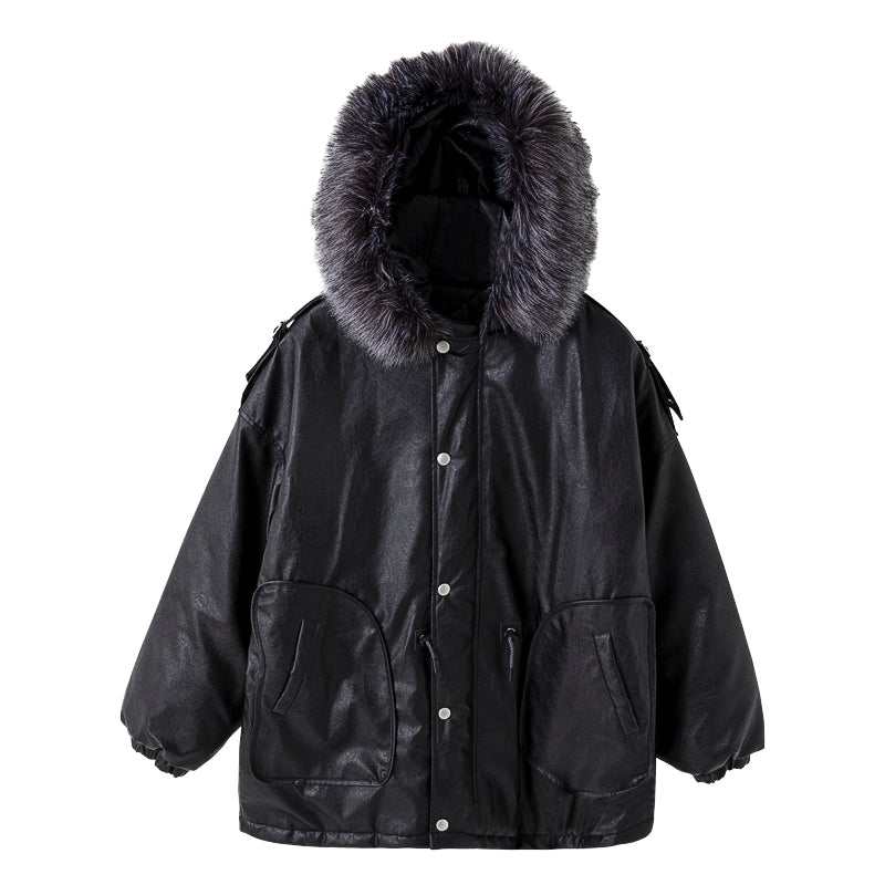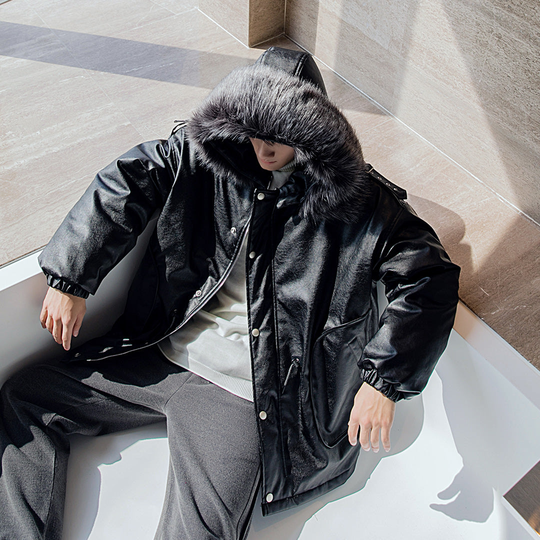 CHIC ERRO Men's fur collar hooded leather jacket Korean style trend loose handsome youth jacket